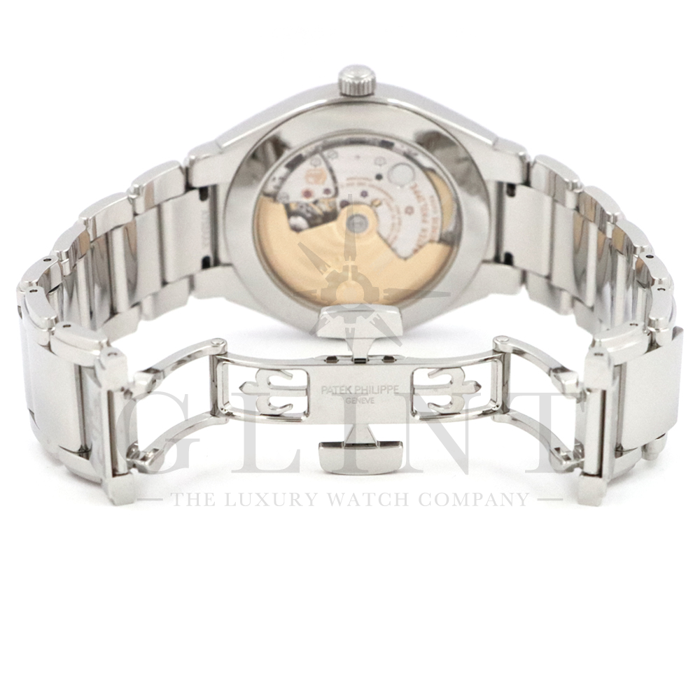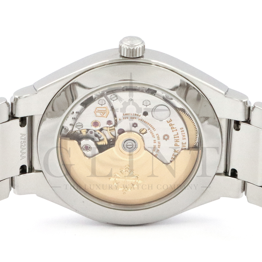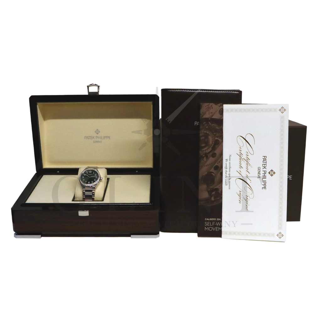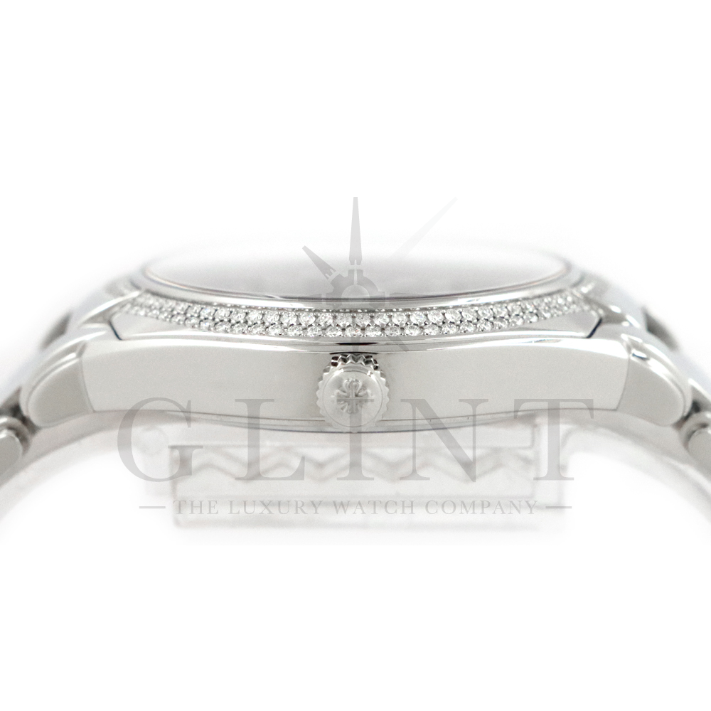 こちらはTWENTY~4 7300/1200A-011 オリーブグリーン・ソレイユです。このステンレススチール仕様の新しいTwenty~4 Automaticは、オリーブグリーンのエレガントな文字盤で際立ちます。このカラーは、現代のパテック フィリップ・コレクションで今回初めて登場し、放射状・ソレイユ仕上げにより輝かしい効果を発揮します。ベゼルに輝く160個のダイヤモンドと相まって大人の女性の腕元を演出してくれるでしょう。