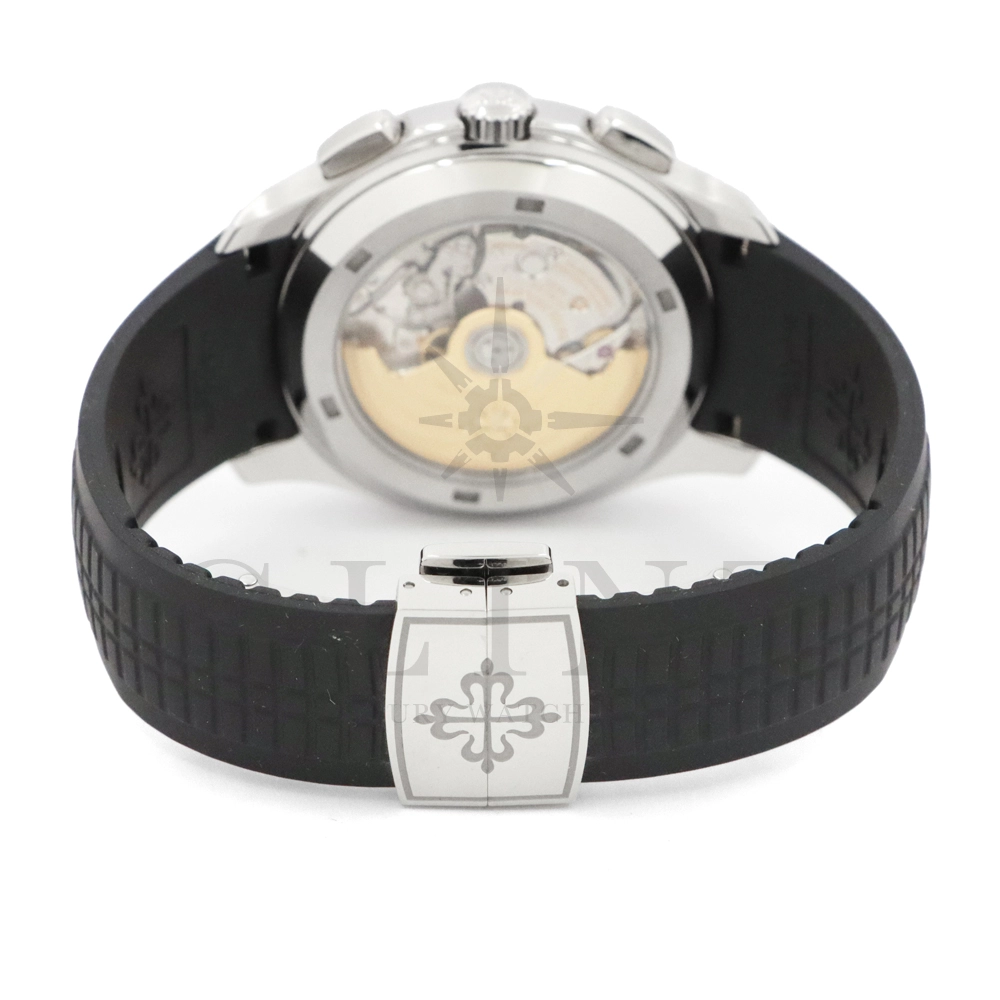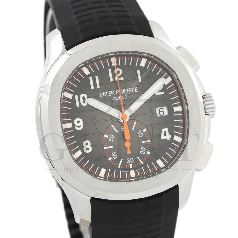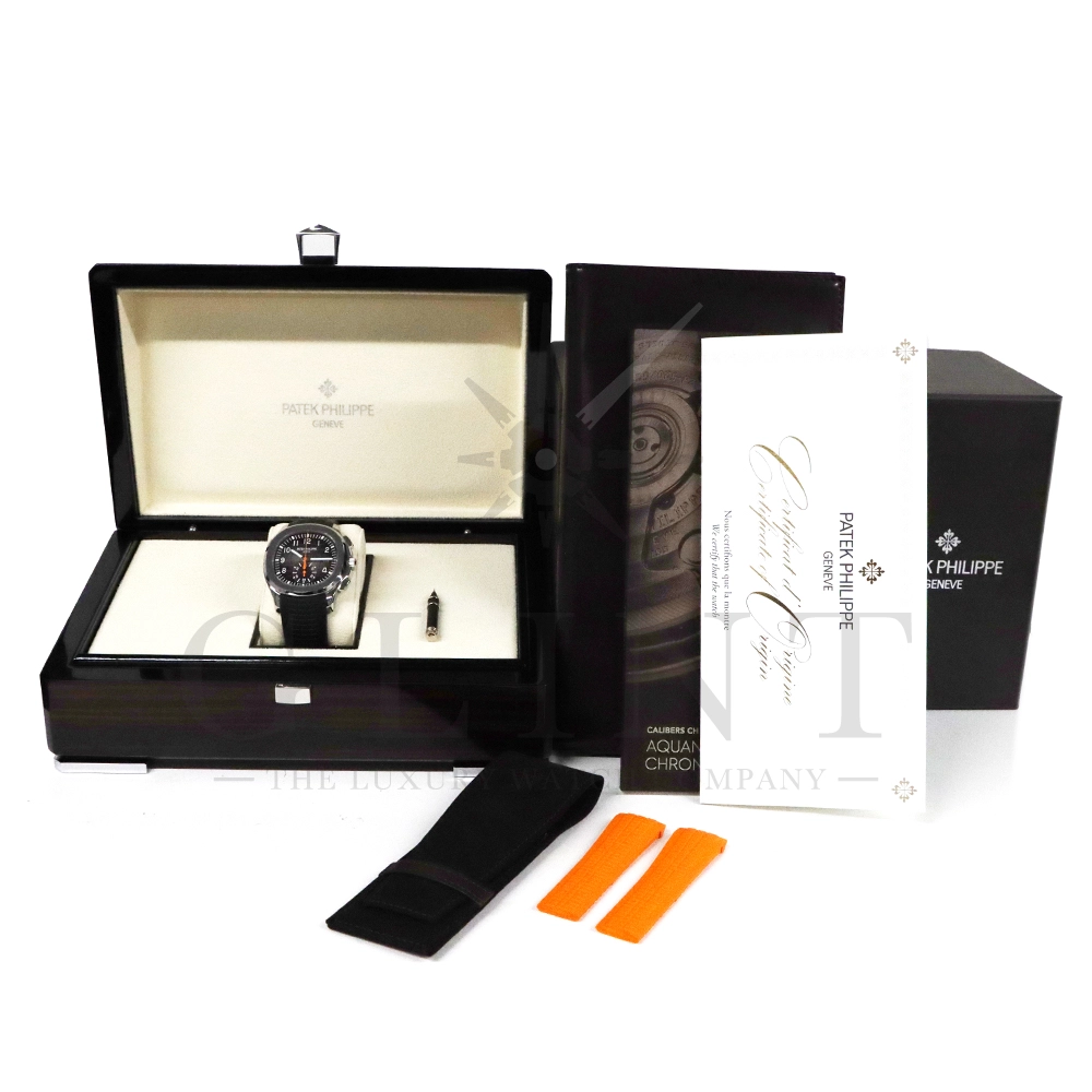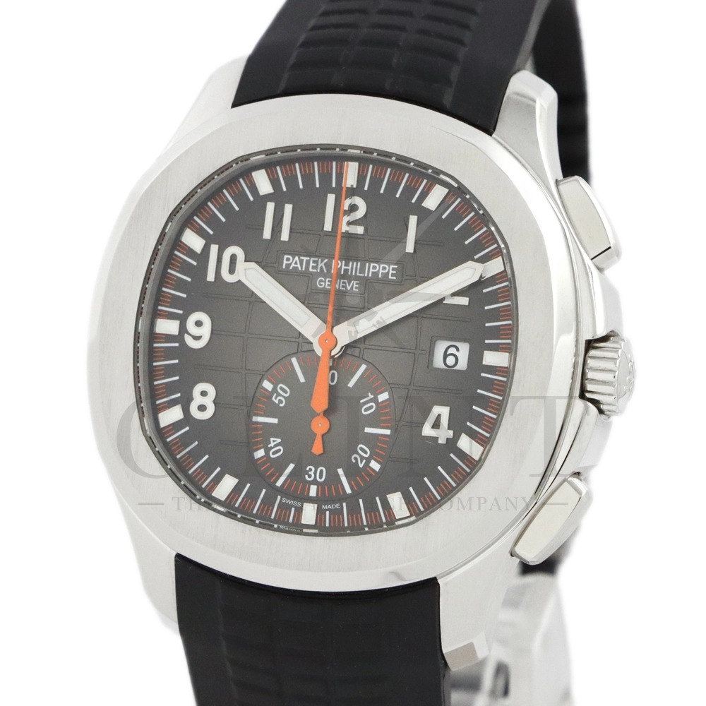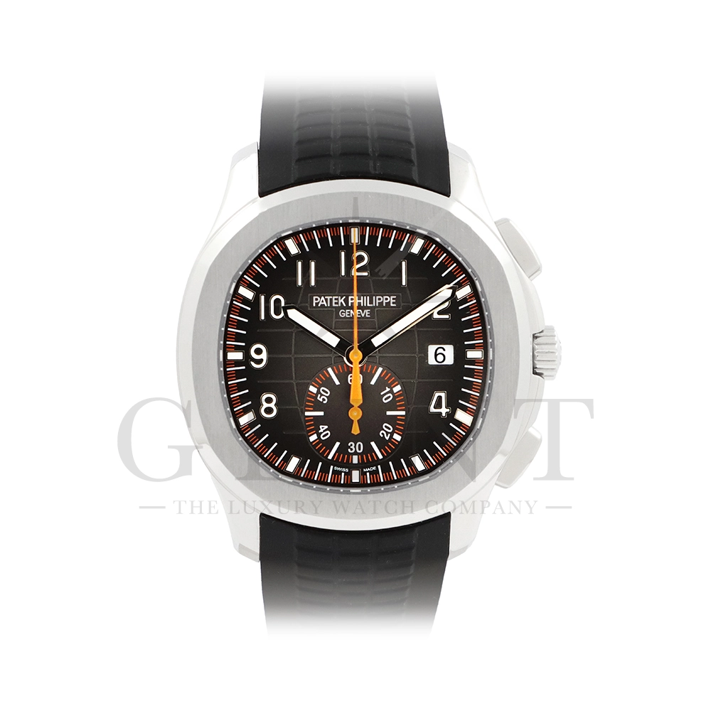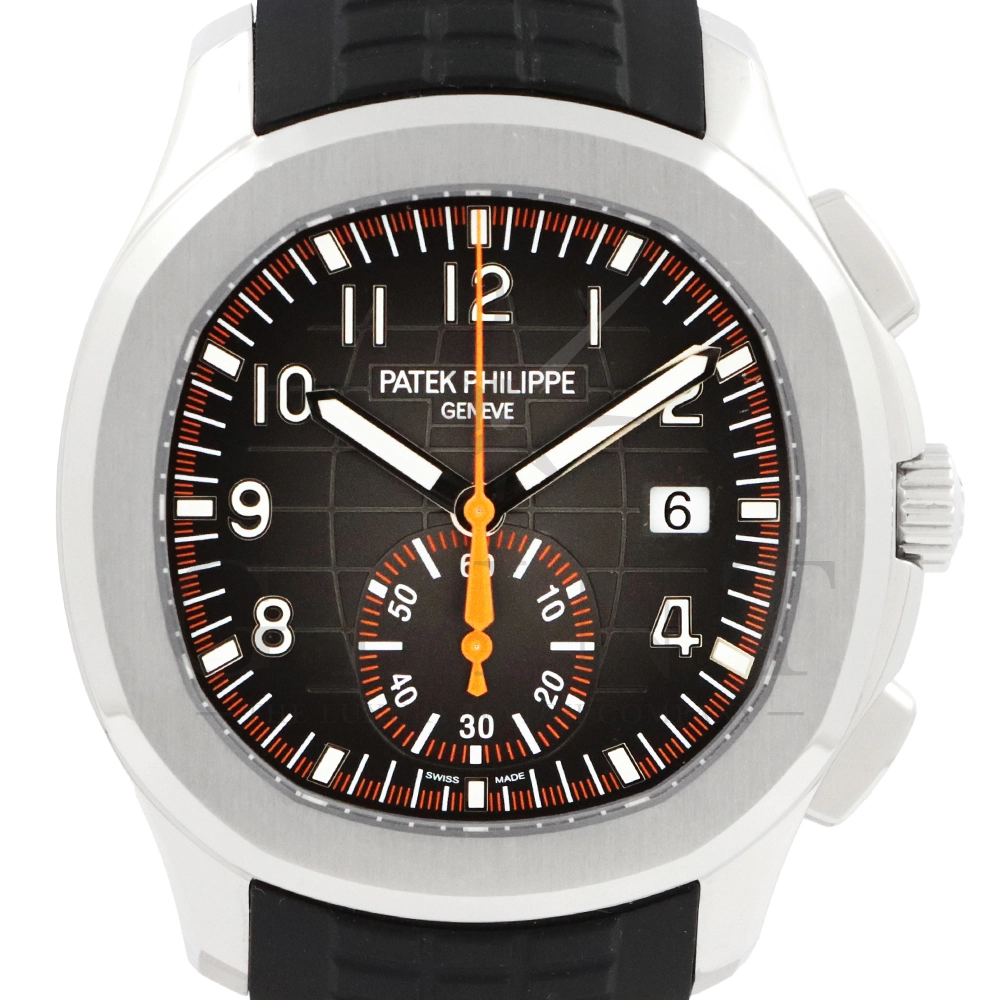 スポーツエレガンスを象徴するモデルとして1997年に発表されたアクアノートコレクション。2018年に登場したこちらのRef.5968Aはアクアノート初のクロノグラフ搭載モデルです。ケースサイズは大きく、通称”JUMBO”と言われるジャンボサイズの42.2mm。エンボス加工のブラック文字盤にオレンジカラーのクロノグラフ針、60分積算計針がアクセントとなっており、ポップな印象を与えてくれるでしょう。搭載されているフライバッククロノグラフ自動巻きムーブメント Cal.CH 28-520 C/528は5960Pや5980/1Aから系譜されてきたキャリバーで、ムーブメントの動きをシースルーバックから堪能する事ができます。12気圧防水、ねじ込み式リュウズ、ラバーベルトは海水にも耐えるコンポジット素材を採用。カジュアルながらもパテックフィリップらしい上品な雰囲気も感じさせてくれる魅力的な一本です。
