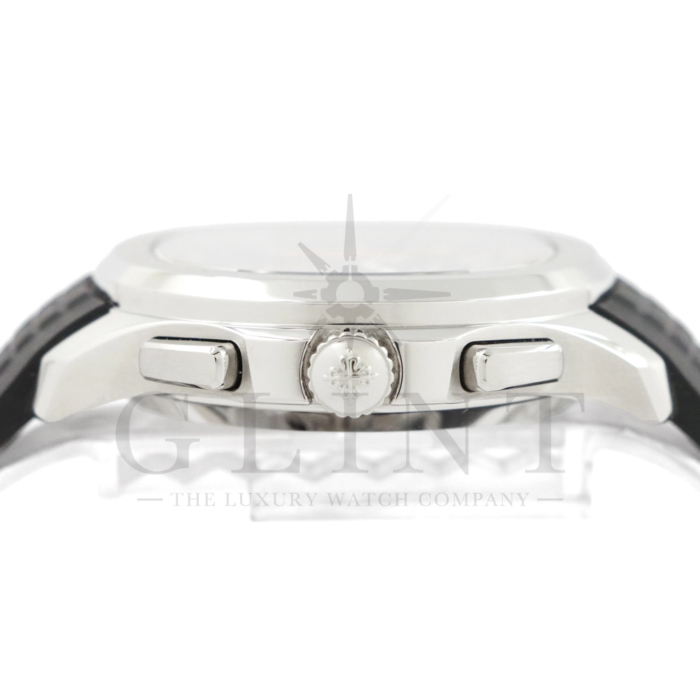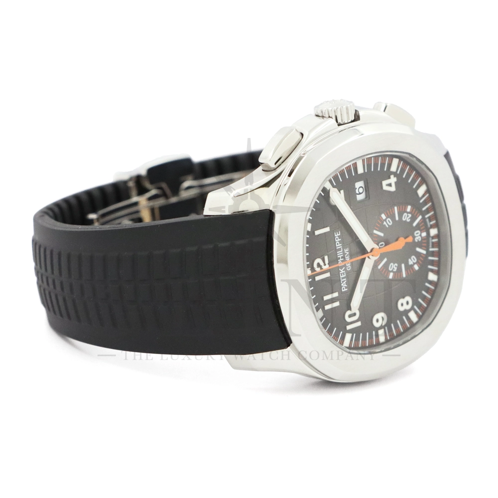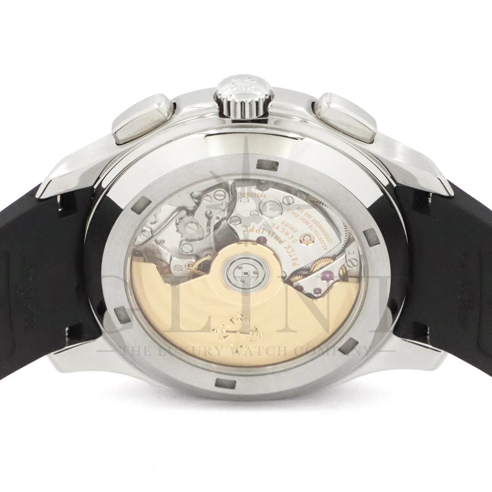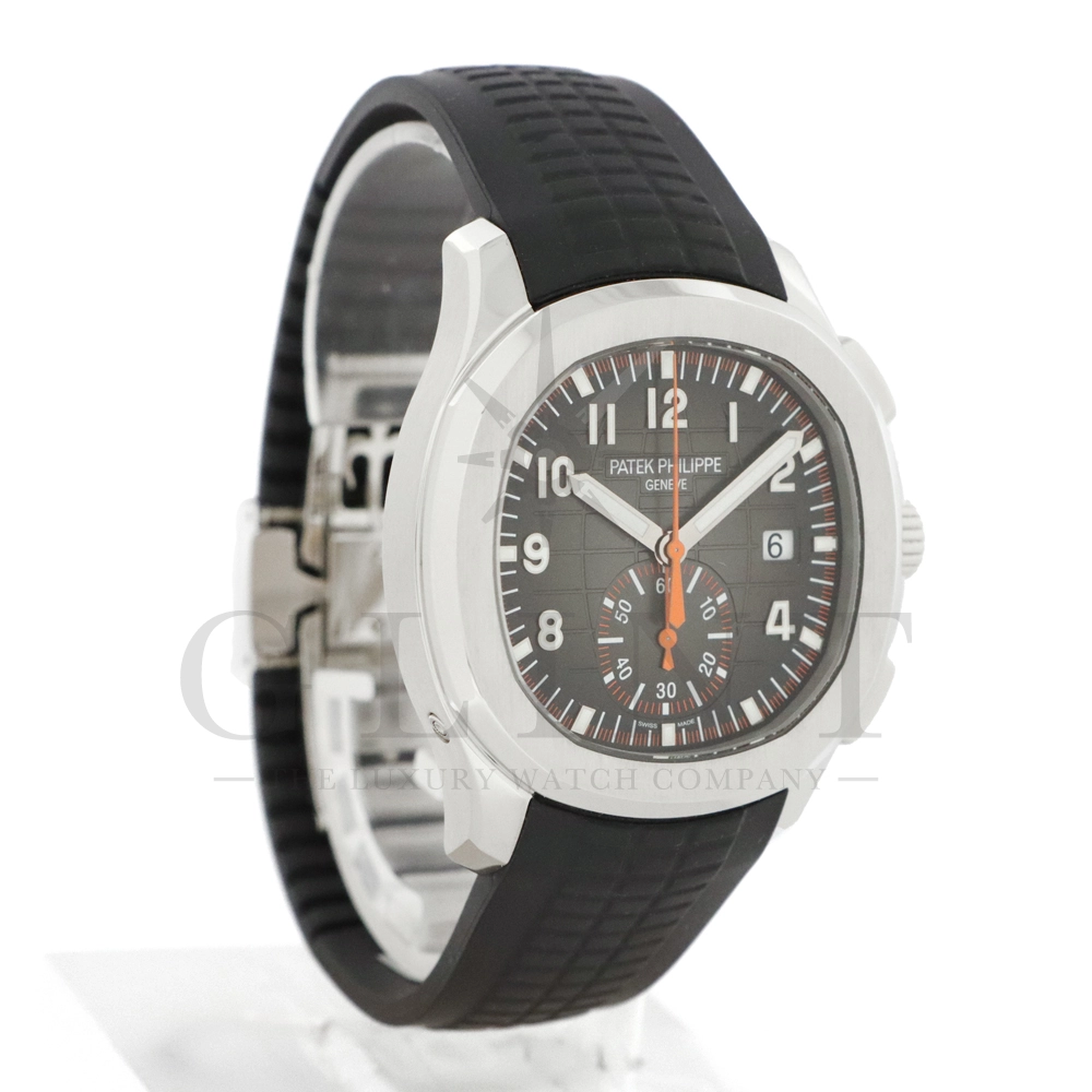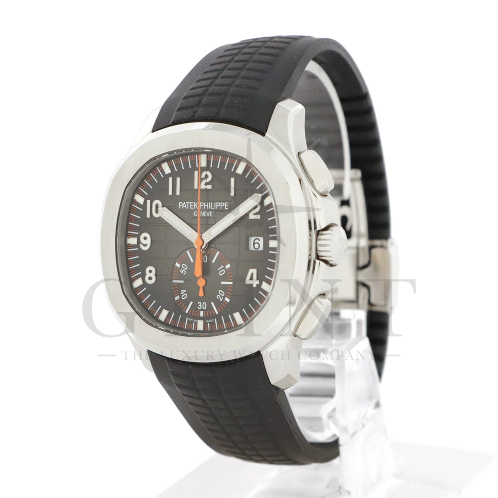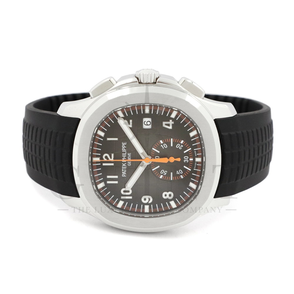スポーツエレガンスを象徴するモデルとして1997年に発表されたアクアノートコレクション。2018年に登場したこちらのRef.5968Aはアクアノート初のクロノグラフ搭載モデルです。ケースサイズは大きく、通称”JUMBO”と言われるジャンボサイズの42.2mm。エンボス加工のブラック文字盤にオレンジカラーのクロノグラフ針、60分積算計針がアクセントとなっており、ポップな印象を与えてくれるでしょう。搭載されているフライバッククロノグラフ自動巻きムーブメント Cal.CH 28-520 C/528は5960Pや5980/1Aから系譜されてきたキャリバーで、ムーブメントの動きをシースルーバックから堪能する事ができます。12気圧防水、ねじ込み式リュウズ、ラバーベルトは海水にも耐えるコンポジット素材を採用。カジュアルながらもパテックフィリップらしい上品な雰囲気も感じさせてくれる魅力的な一本です。