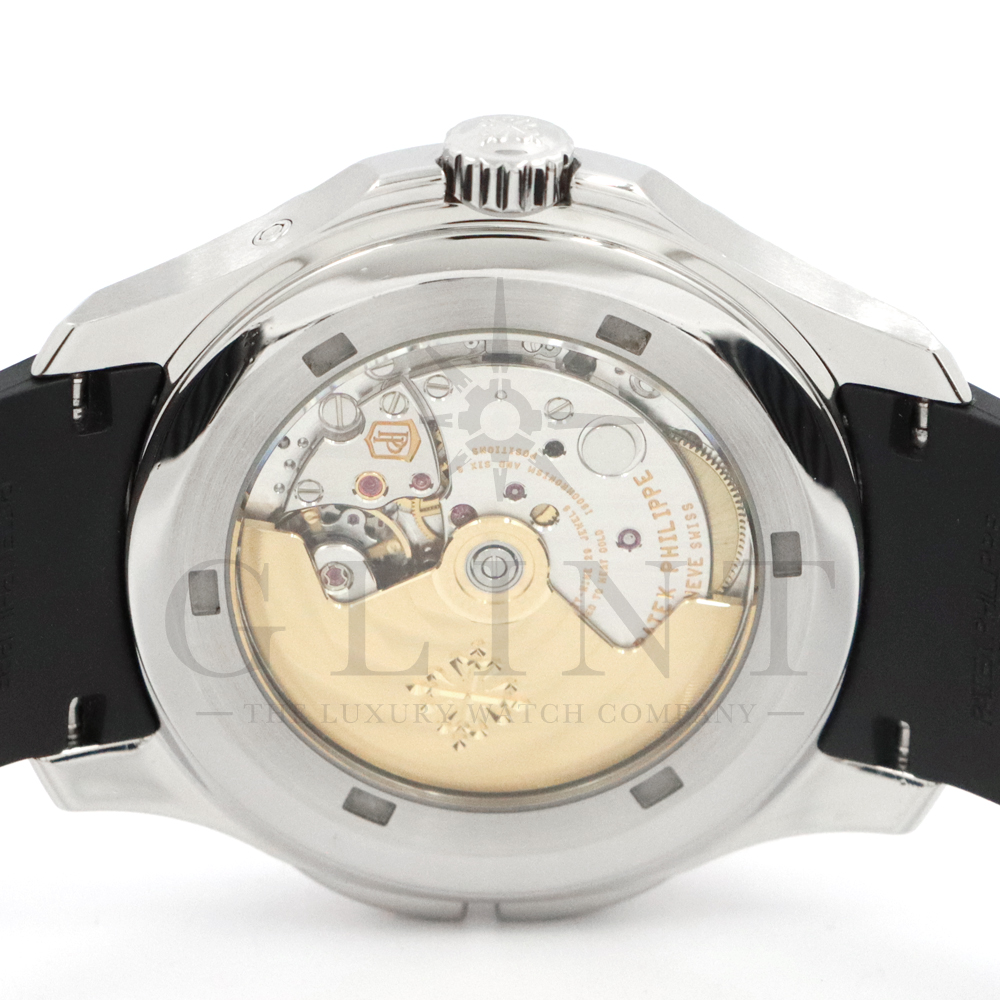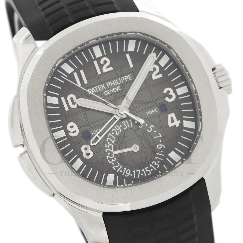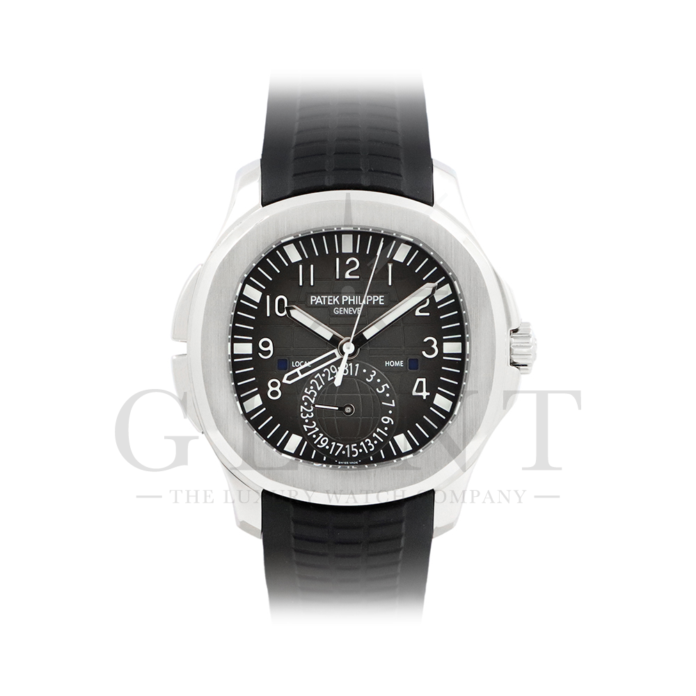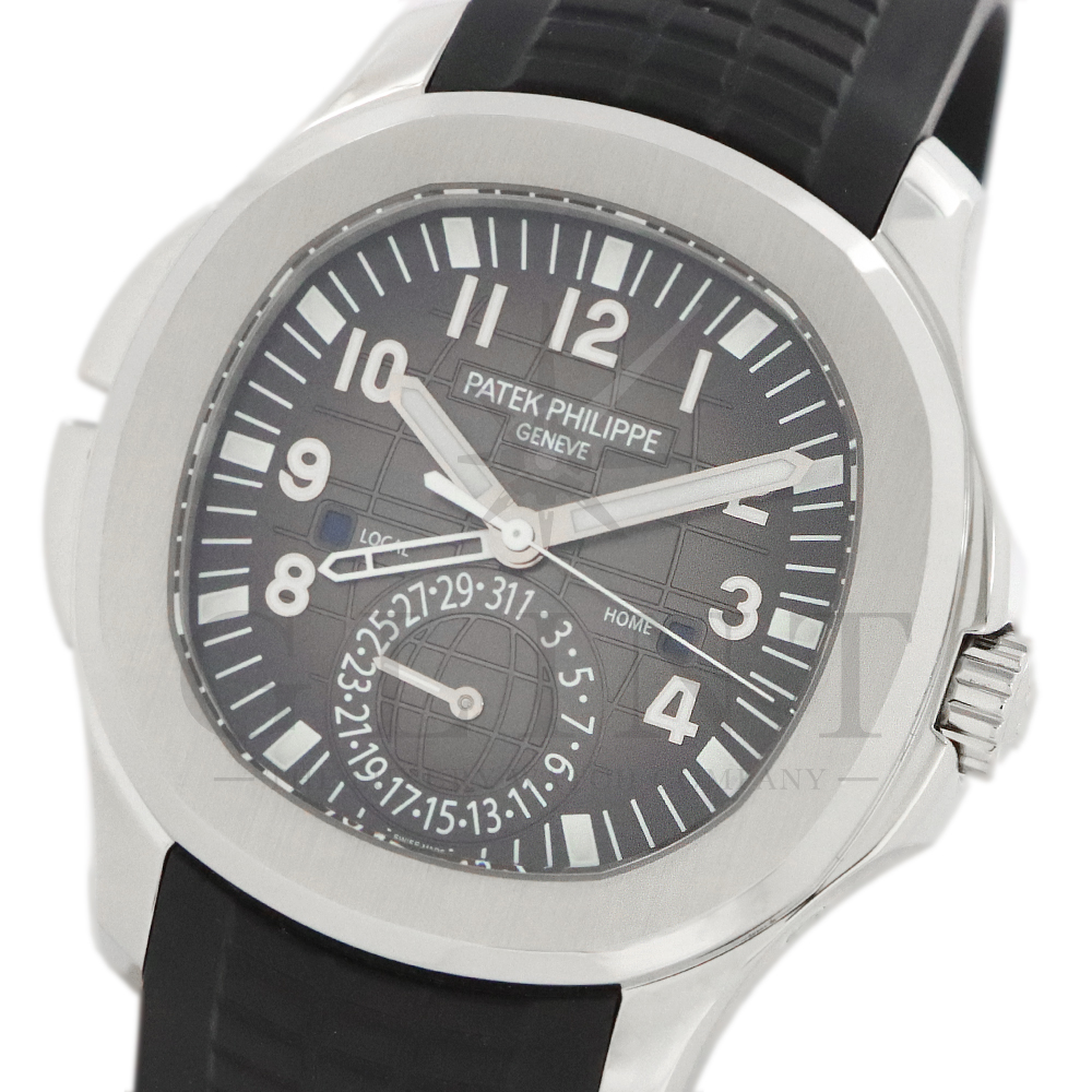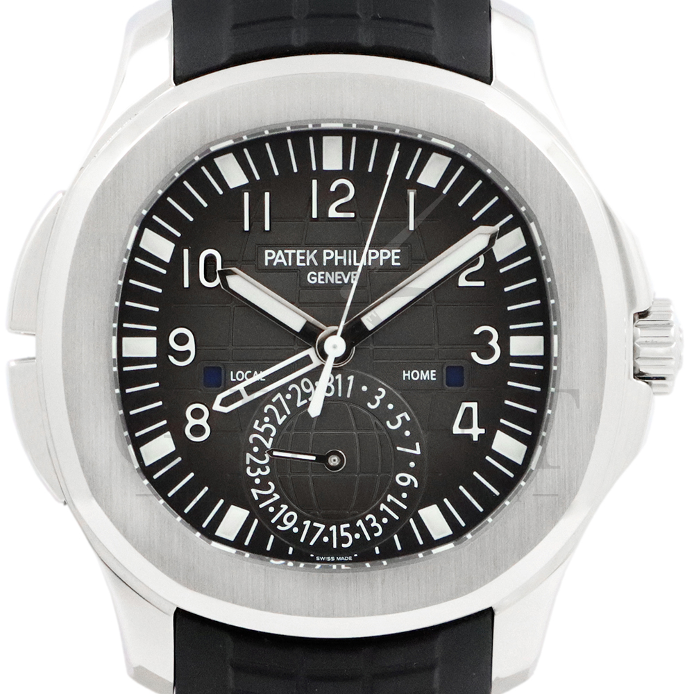 こちらはパテックフィリップ アクアノート トラベルタイム 5164A-001です。初めて自動巻きのトラベルタイムムーブメントを搭載した記念すべきモデル。トラベルタイムは重なり合う2本の時針により、2つの異なったタイムゾーンの時刻を一目で判るように表示する機構で、こちらのモデルは出発地と現地の2つの昼夜窓表示を搭載するなど、より実用性に特化した仕様となっております。更には、12気圧防水、ねじ込み式リュウズ、海水にも耐えるコンポジット素材を採用したトロピカルバンドが最高の安全性を保証。そして美しい文字盤の構造的なデザインは、トロピカルバンドのモチーフと統一されており、丸みを帯びた八角形の驚くほどモダンなフォルムが、アクアノートの魅力を存分に引き出してくれます。