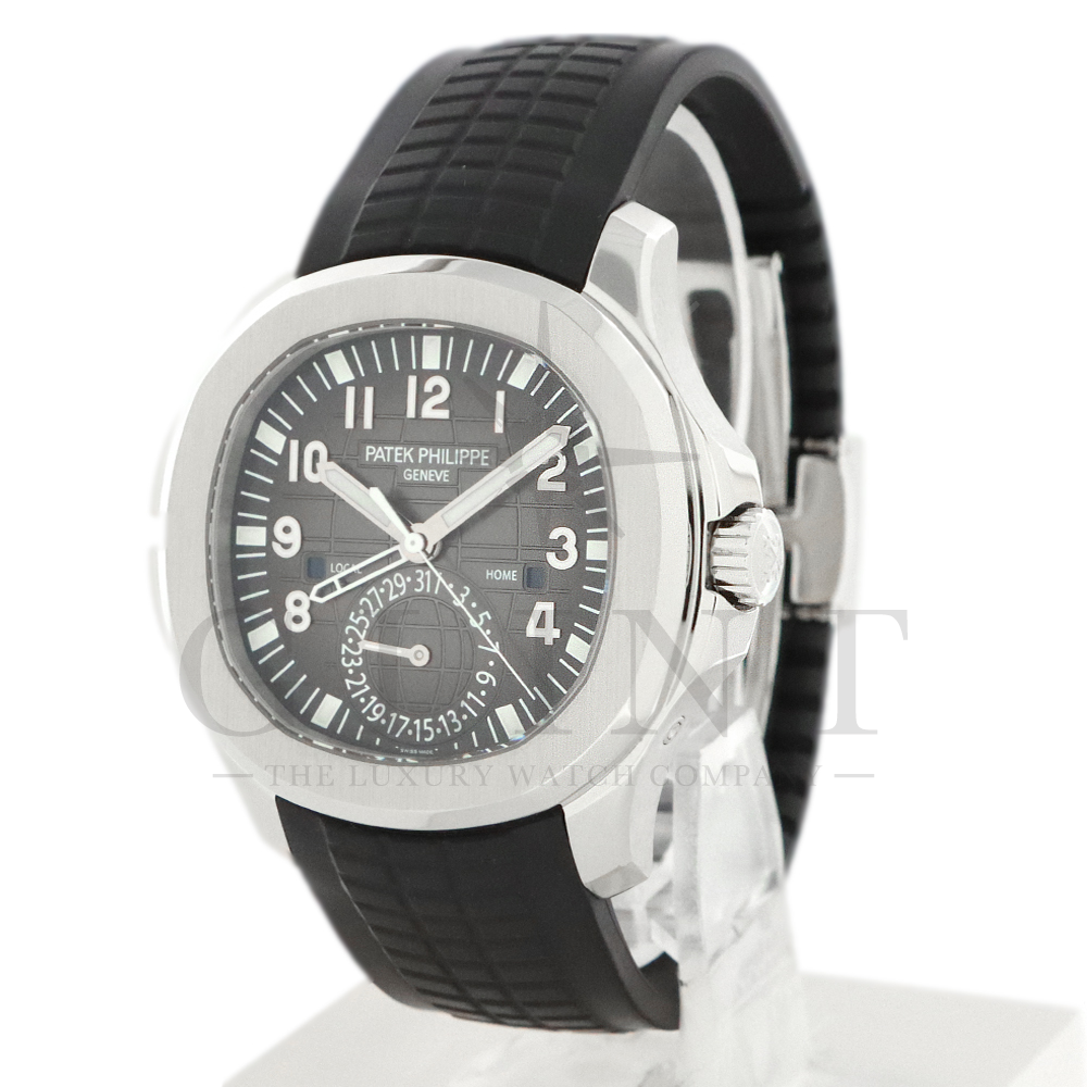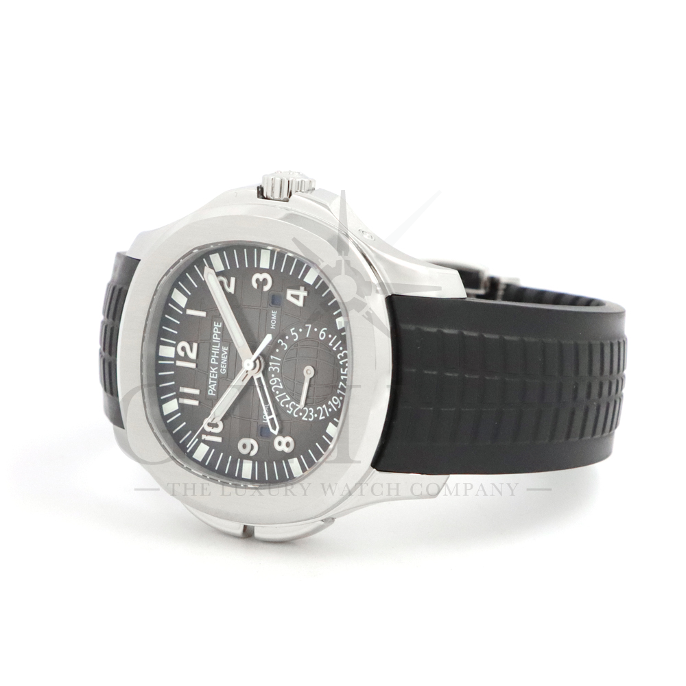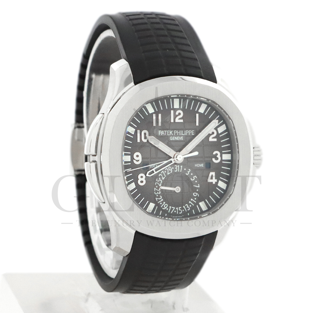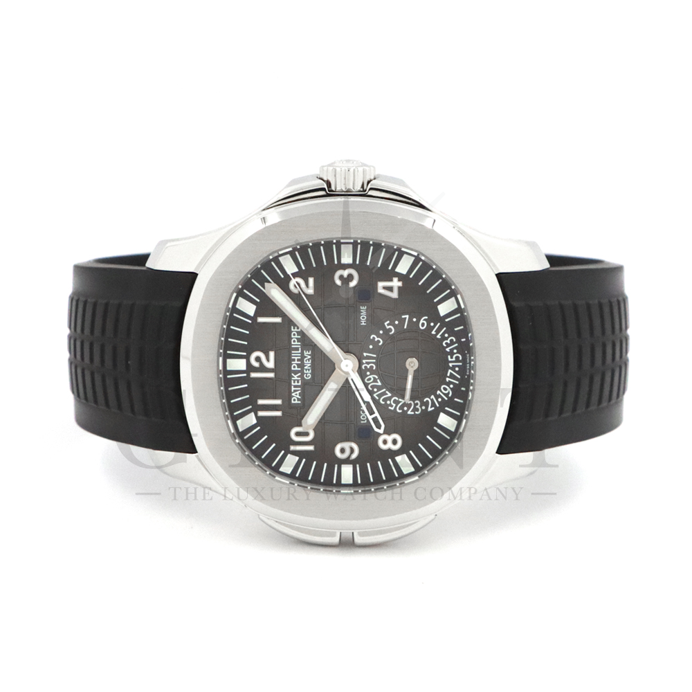 こちらはパテックフィリップ アクアノート トラベルタイム 5164A-001です。初めて自動巻きのトラベルタイムムーブメントを搭載した記念すべきモデル。トラベルタイムは重なり合う2本の時針により、2つの異なったタイムゾーンの時刻を一目で判るように表示する機構で、こちらのモデルは出発地と現地の2つの昼夜窓表示を搭載するなど、より実用性に特化した仕様となっております。更には、12気圧防水、ねじ込み式リュウズ、海水にも耐えるコンポジット素材を採用したトロピカルバンドが最高の安全性を保証。そして美しい文字盤の構造的なデザインは、トロピカルバンドのモチーフと統一されており、丸みを帯びた八角形の驚くほどモダンなフォルムが、アクアノートの魅力を存分に引き出してくれます。