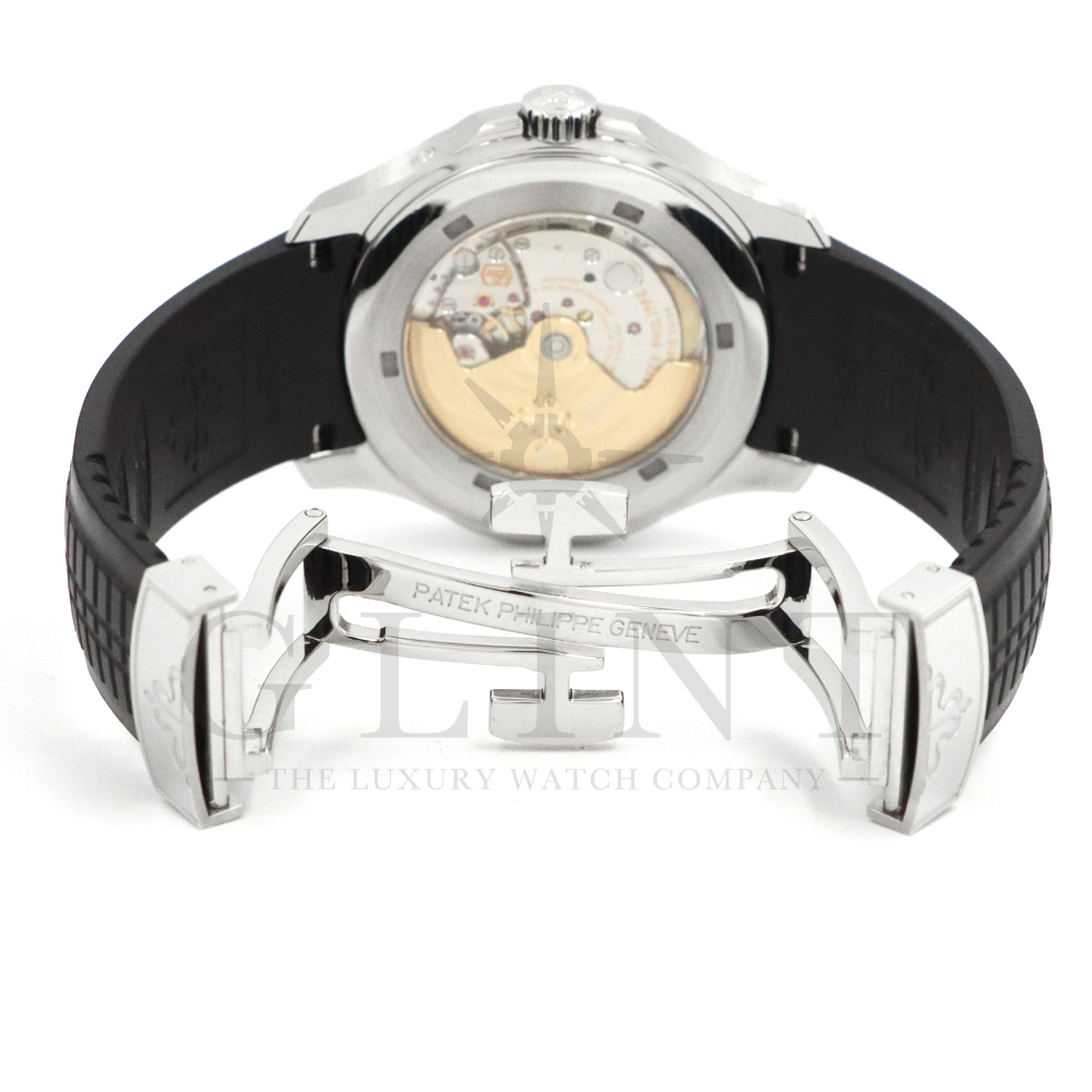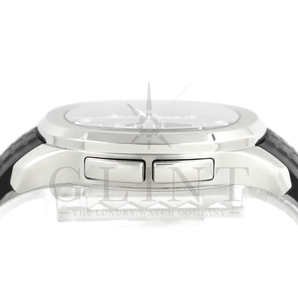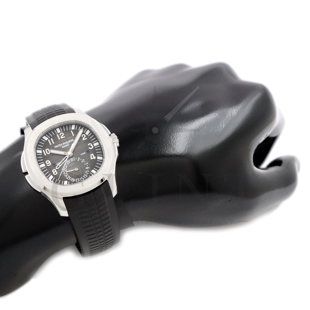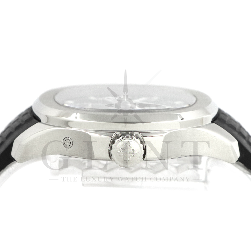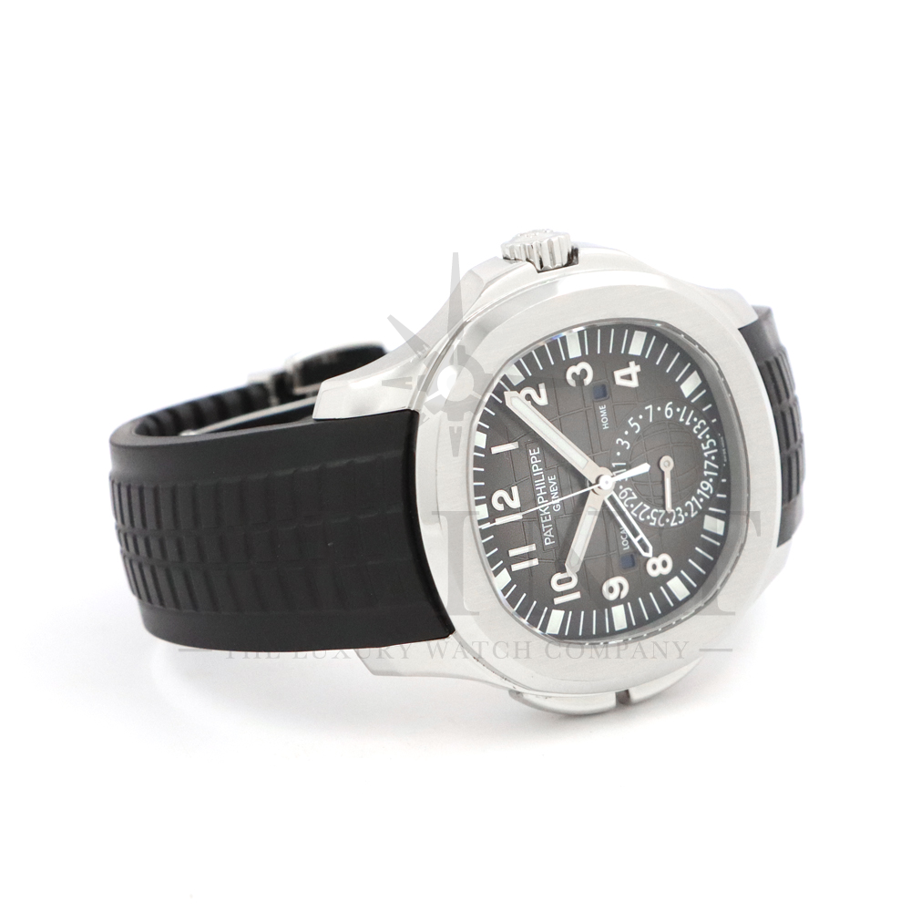 こちらはパテックフィリップ アクアノート トラベルタイム 5164A-001です。初めて自動巻きのトラベルタイムムーブメントを搭載した記念すべきモデル。トラベルタイムは重なり合う2本の時針により、2つの異なったタイムゾーンの時刻を一目で判るように表示する機構で、こちらのモデルは出発地と現地の2つの昼夜窓表示を搭載するなど、より実用性に特化した仕様となっております。更には、12気圧防水、ねじ込み式リュウズ、海水にも耐えるコンポジット素材を採用したトロピカルバンドが最高の安全性を保証。そして美しい文字盤の構造的なデザインは、トロピカルバンドのモチーフと統一されており、丸みを帯びた八角形の驚くほどモダンなフォルムが、アクアノートの魅力を存分に引き出してくれます。