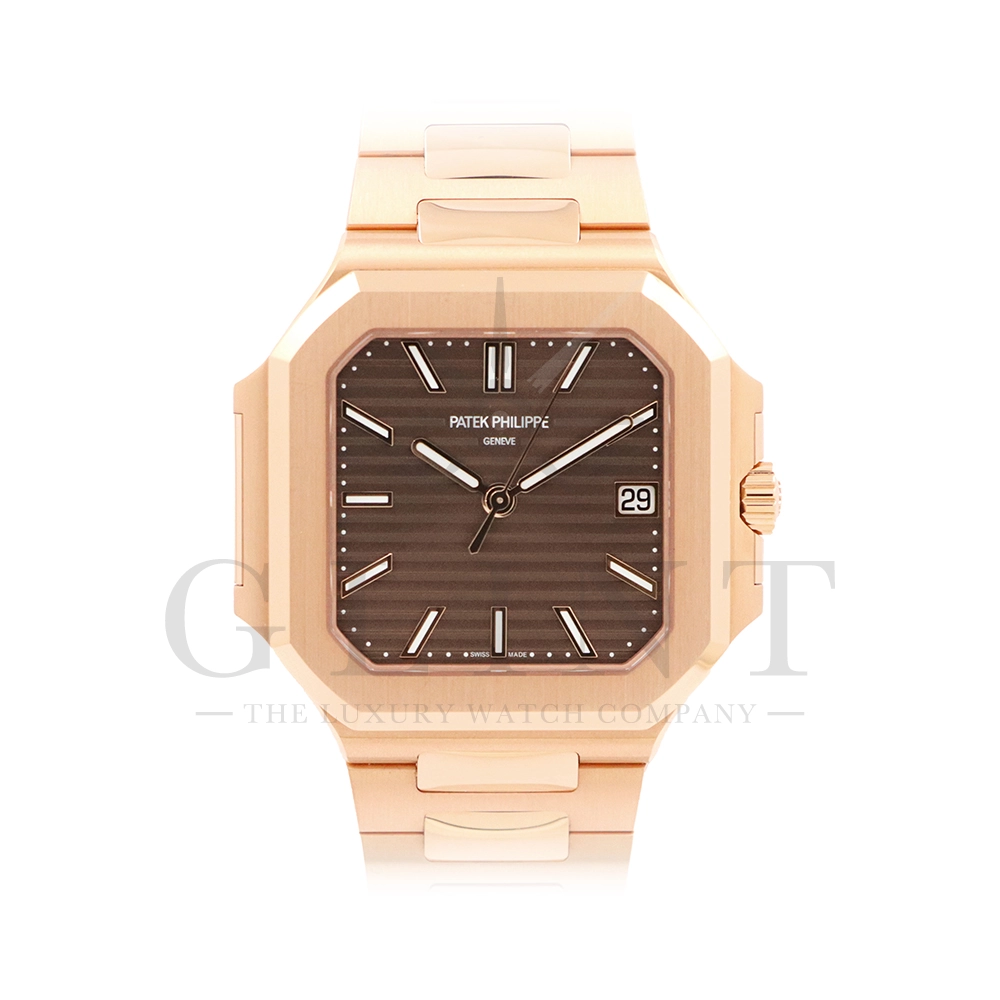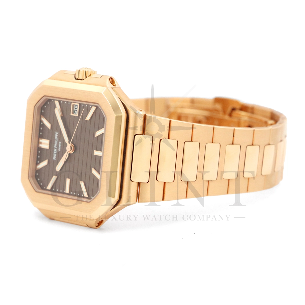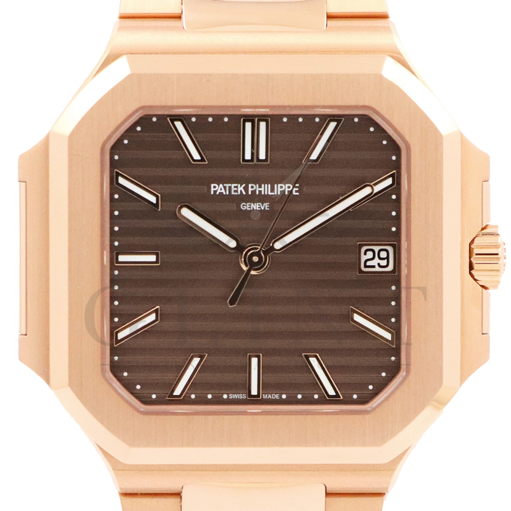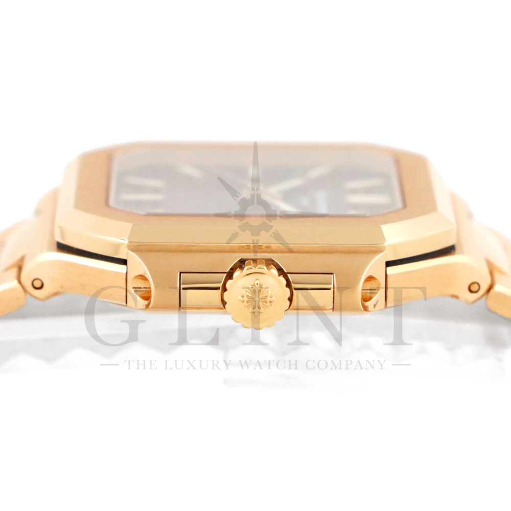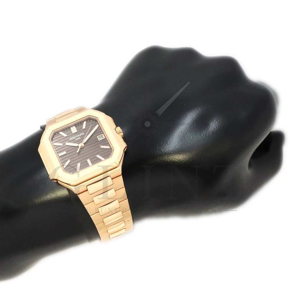 こちらはパテックフィリップコレクション「Cubitus(キュビタス)」 7128/1R-001です。大胆さとエレガンスのユニークな融合を体現したコレクションに新しいミディアムサイズが登場。40mmとスリムなスクエア型ケースになっており、手首にエレガントにフィットすることが特徴です。水平エンボス文字盤は、エレガントなブラウン・ソレイユ・カラー。ローズゴールド・ブレスレットには、ロック可能な調整システムを備え、快適性と安全性を保証する、特許取得のパテック フィリップ折り畳み式バックルが装着されています。さらに、ムーブメントには、ストップ・セコンド機能を備えたニューモデルのキャリバー26‑330 S Cを搭載。モダンで独自性溢れるデザインで洗練されたな雰囲気をお楽しみいただる一本です。
