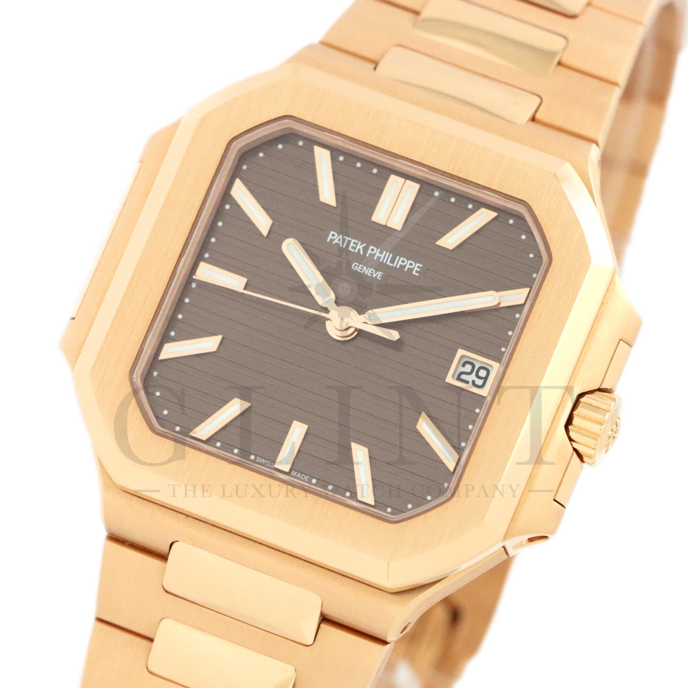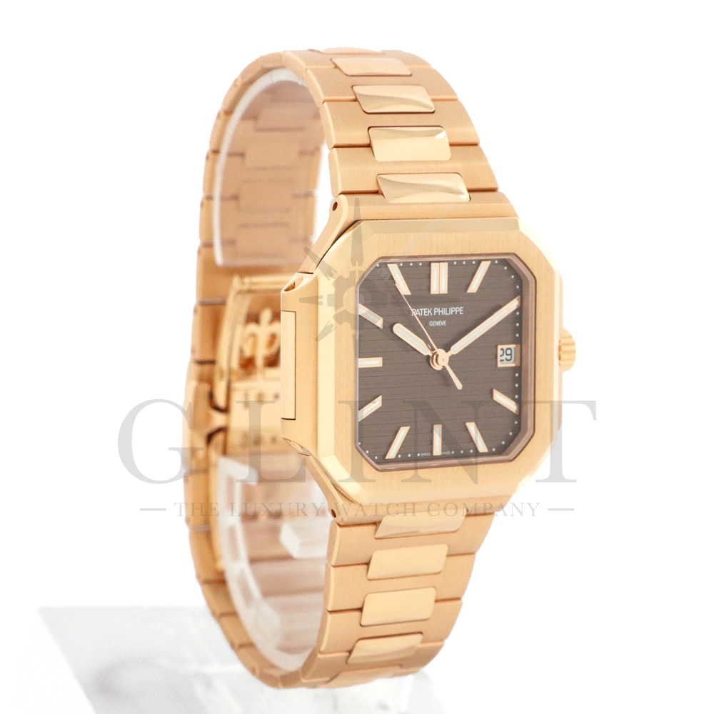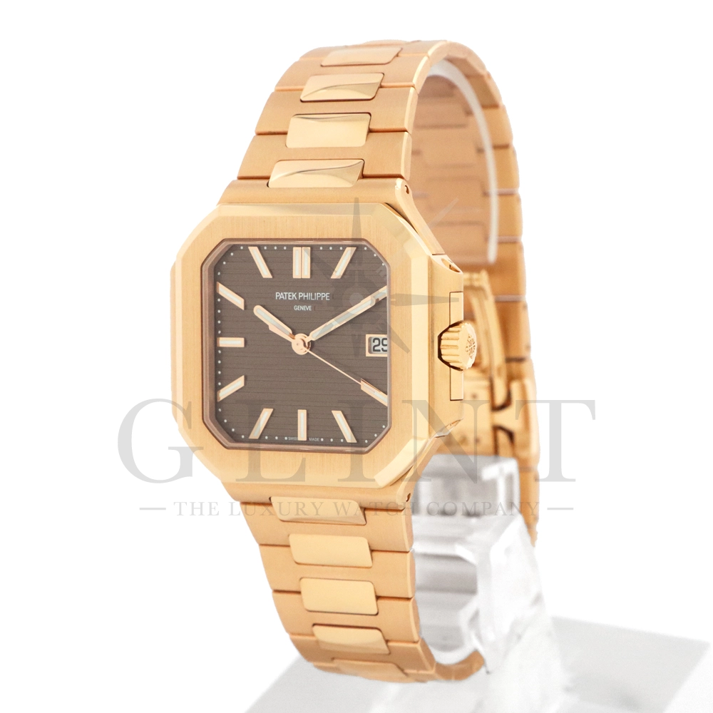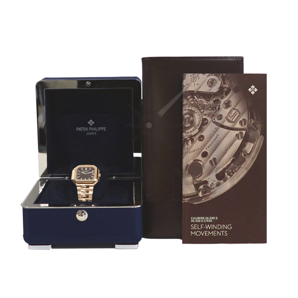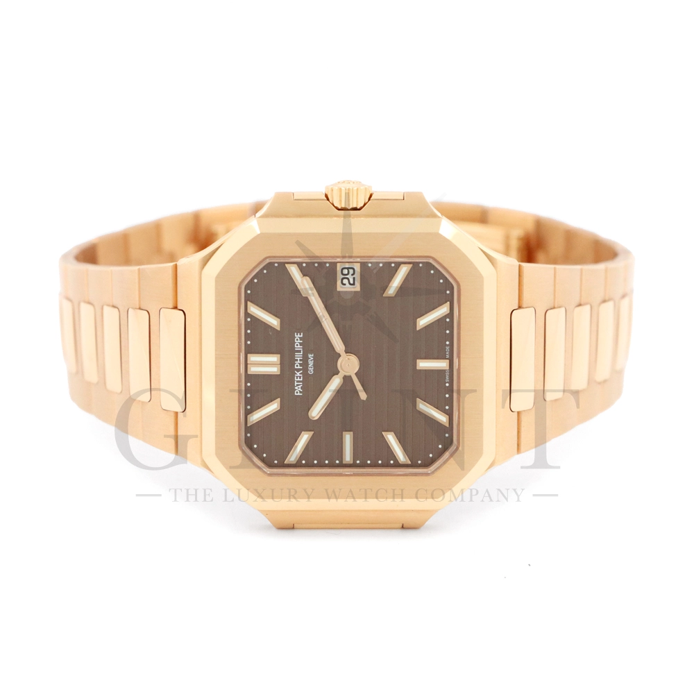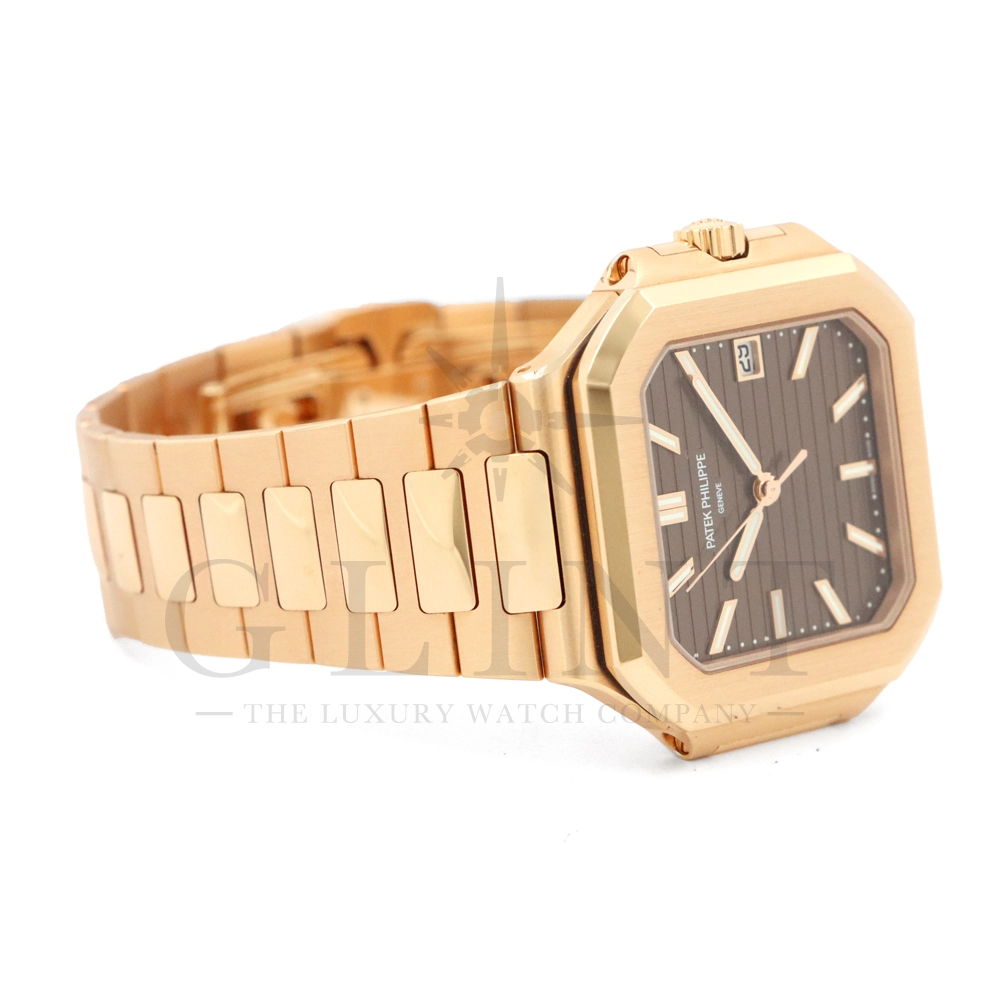 こちらはパテックフィリップコレクション「Cubitus(キュビタス)」 7128/1R-001です。大胆さとエレガンスのユニークな融合を体現したコレクションに新しいミディアムサイズが登場。40mmとスリムなスクエア型ケースになっており、手首にエレガントにフィットすることが特徴です。水平エンボス文字盤は、エレガントなブラウン・ソレイユ・カラー。ローズゴールド・ブレスレットには、ロック可能な調整システムを備え、快適性と安全性を保証する、特許取得のパテック フィリップ折り畳み式バックルが装着されています。さらに、ムーブメントには、ストップ・セコンド機能を備えたニューモデルのキャリバー26‑330 S Cを搭載。モダンで独自性溢れるデザインで洗練されたな雰囲気をお楽しみいただる一本です。