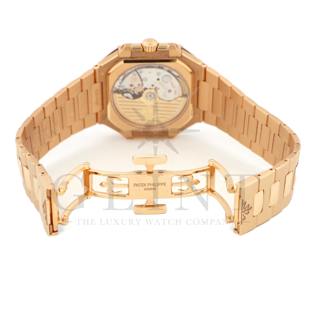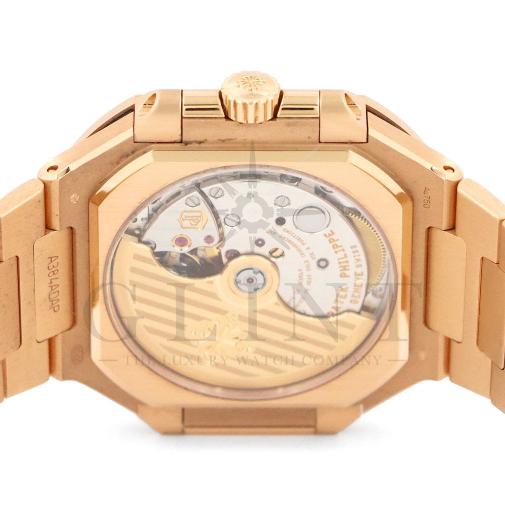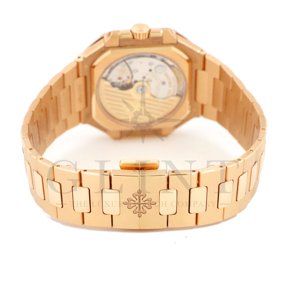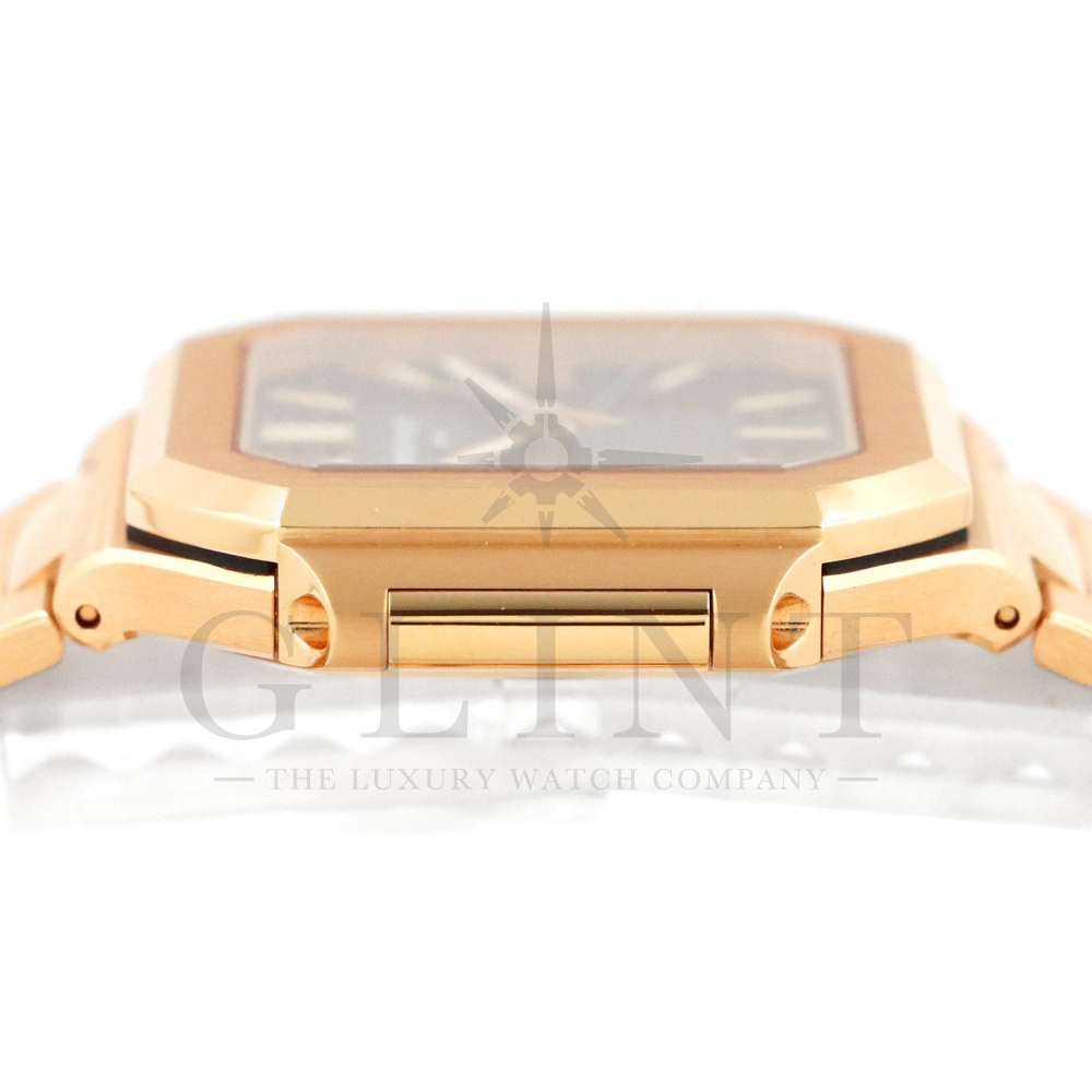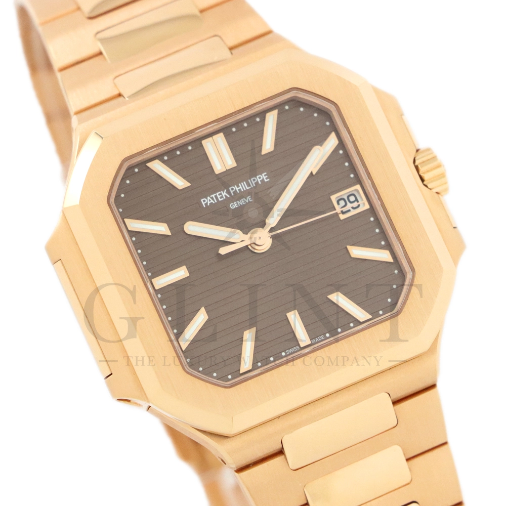 こちらはパテックフィリップコレクション「Cubitus(キュビタス)」 7128/1R-001です。大胆さとエレガンスのユニークな融合を体現したコレクションに新しいミディアムサイズが登場。40mmとスリムなスクエア型ケースになっており、手首にエレガントにフィットすることが特徴です。水平エンボス文字盤は、エレガントなブラウン・ソレイユ・カラー。ローズゴールド・ブレスレットには、ロック可能な調整システムを備え、快適性と安全性を保証する、特許取得のパテック フィリップ折り畳み式バックルが装着されています。さらに、ムーブメントには、ストップ・セコンド機能を備えたニューモデルのキャリバー26‑330 S Cを搭載。モダンで独自性溢れるデザインで洗練されたな雰囲気をお楽しみいただる一本です。