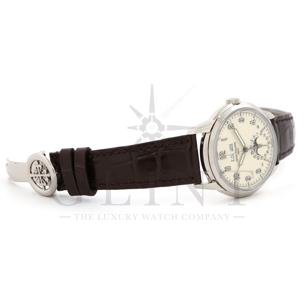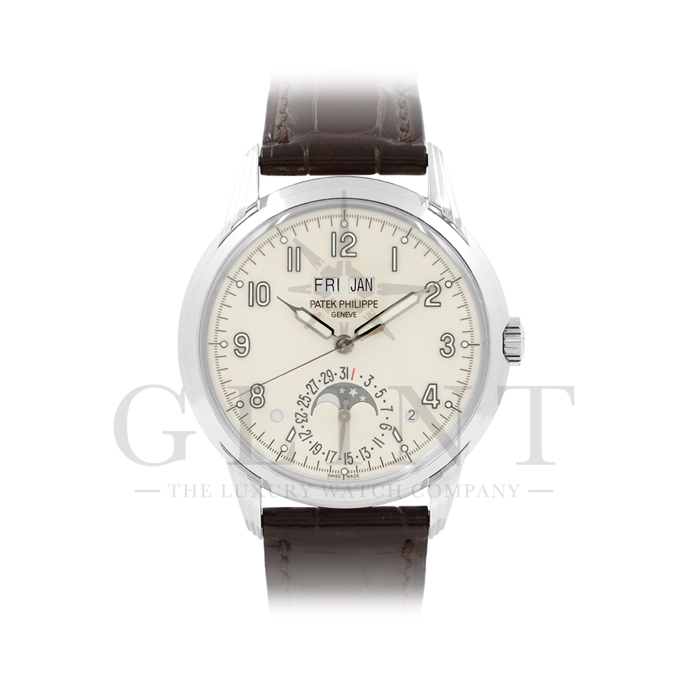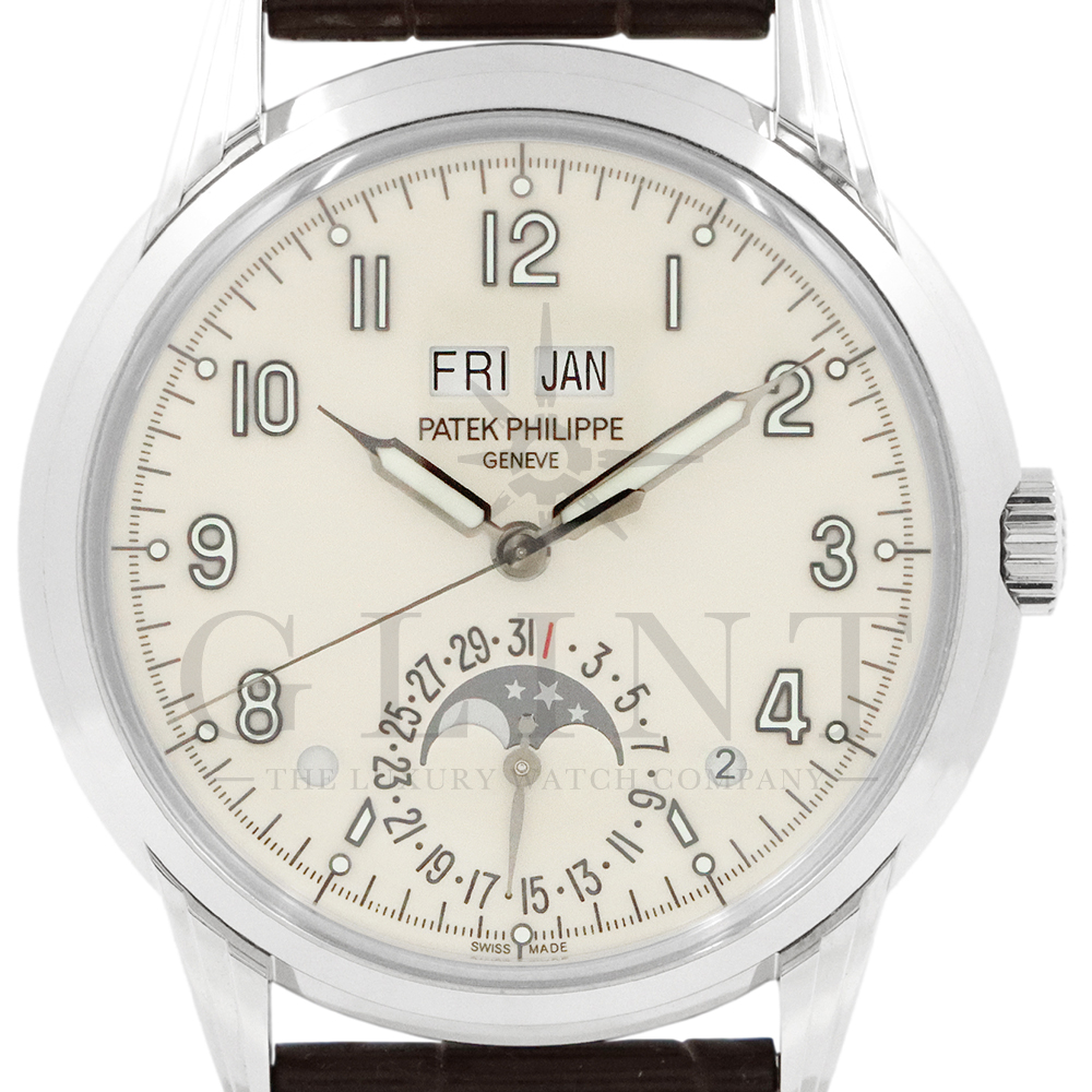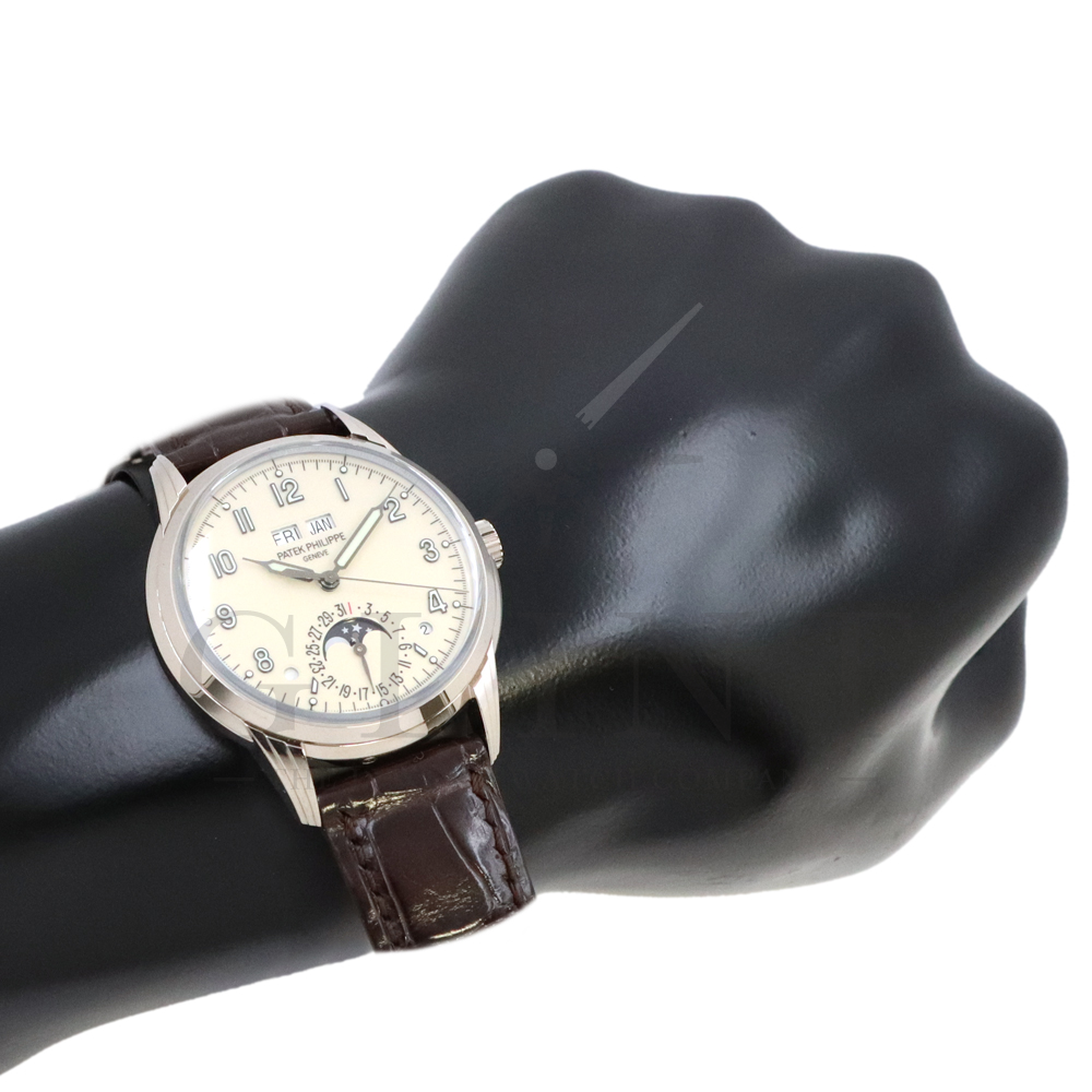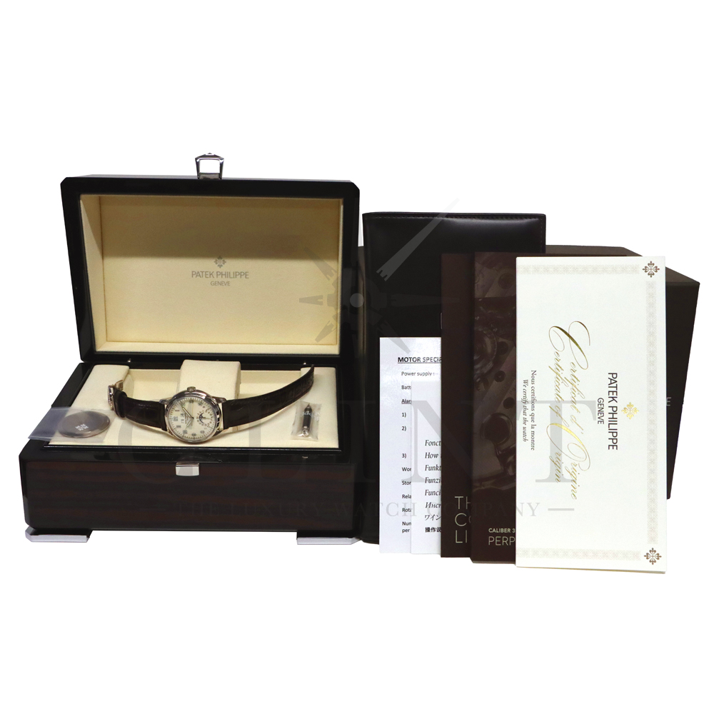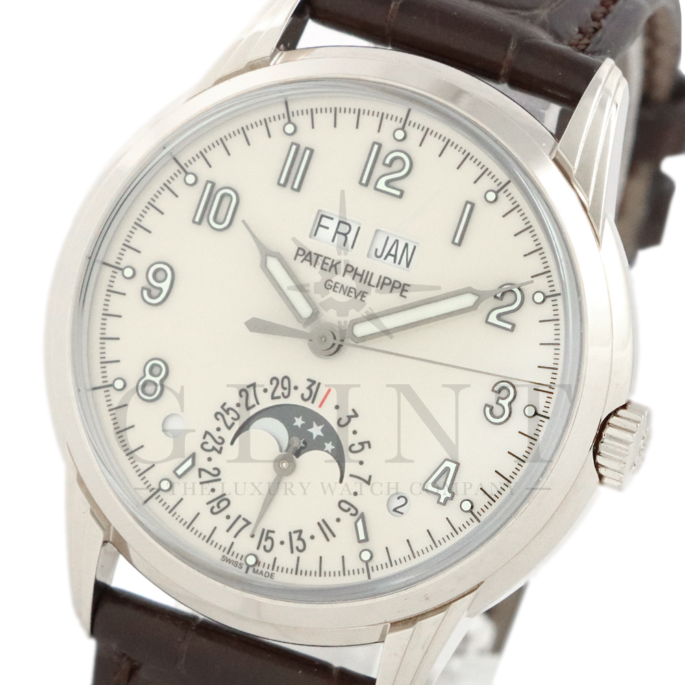 こちらはパテックフィリップ グランドコンプリケーション パーペチュアルカレンダー 5320G-001です。1940年から1950年代にパテックフィリップで制作されたタイムピースからインスピレーションを得て誕生したモデル。ビンテージ感が漂う雰囲気で、温かみのあるラッカー仕様のクリーム色文字盤に配されたインデックスは立体的な正対書体の植字タイプで蓄光塗料を塗り込んで実用性を高めております。ムーブメントにはCal.324 S Qを搭載。1時位置に月、11時位置に曜日、6時位置には日付と月齢表示で美しいムーブメントの動きをシースルーバックから存分にご堪能できるでしょう。伝統的に脈々と受け継がれてきたパテックフィリップのパーペチュアルカレンダーモデルは、いつの時代も色褪せることが無い魅力が備わった最高級の一本です。