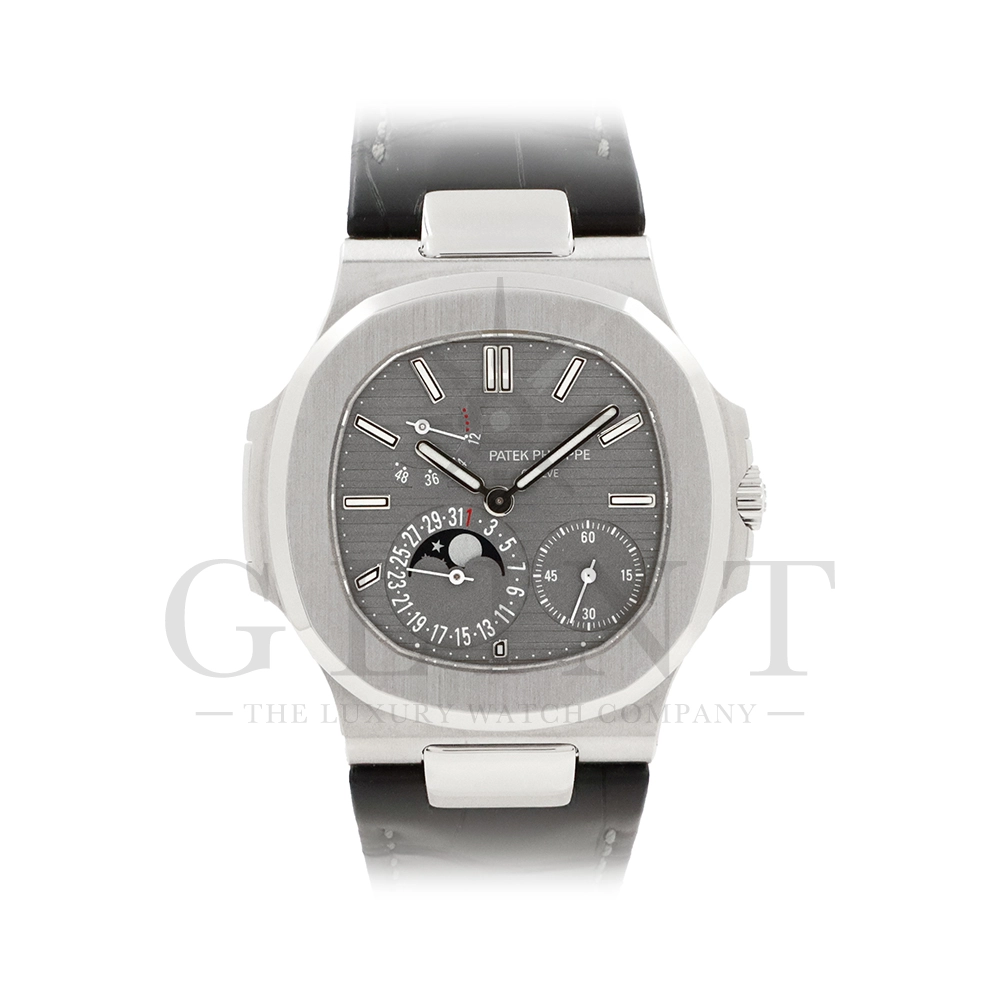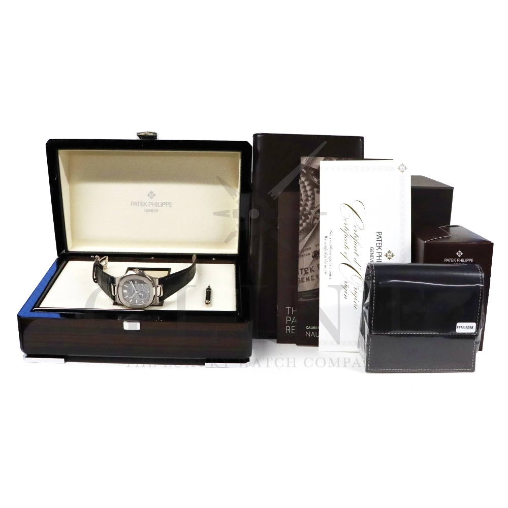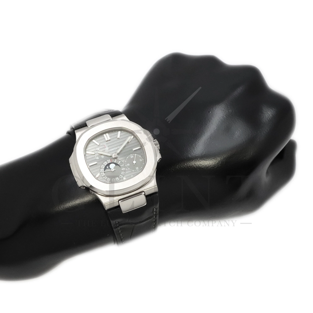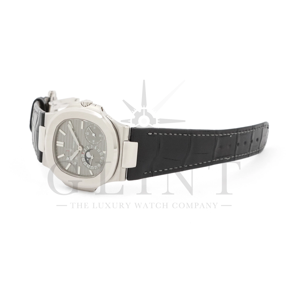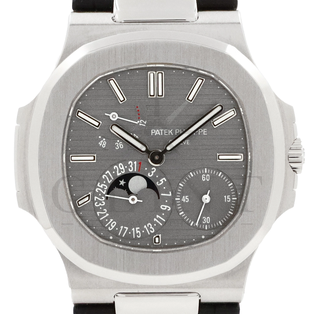 こちらのRef.5712Gはノーチラスが誕生して30周年を迎えた2006年に新たなラインナップとして発表されたコレクションの中でも高い人気を誇るモデルで、ポインターデイト、ムーンフェイズ、パワーリザーブなど様々な機能を搭載したプチコンプリケーションが魅力の一つです。多機能ながらこれほどまでの薄型を実現する事が出来るのも世界最高水準の時計技術を誇るパテックフィリップだからこそ。そしてケースにはホワイトゴールドを採用し、エレガンスな印象をより一層強調してくれます。更にはノーチラスシリーズでは初となる革ベルトを採用しており、スポーツモデルながらもフォーマルな印象も与え、ステータス性の高い洗練された大人の雰囲気を演出してくれる魅力的な逸品です。