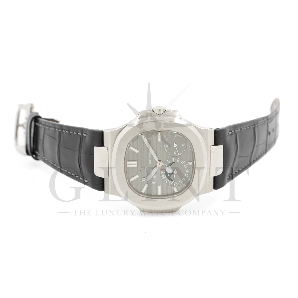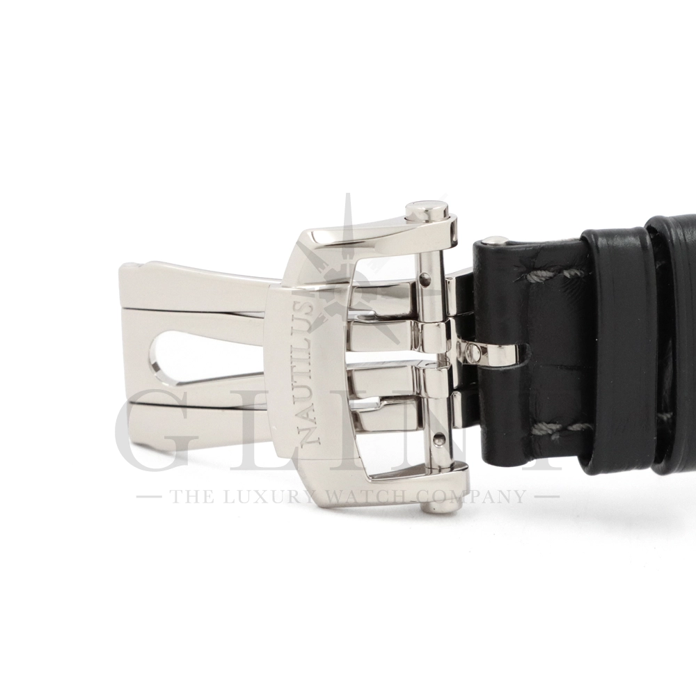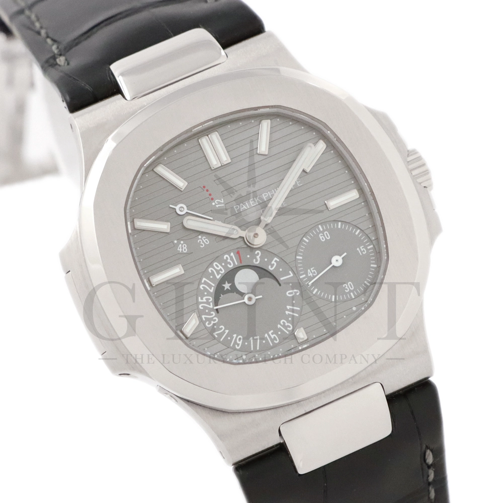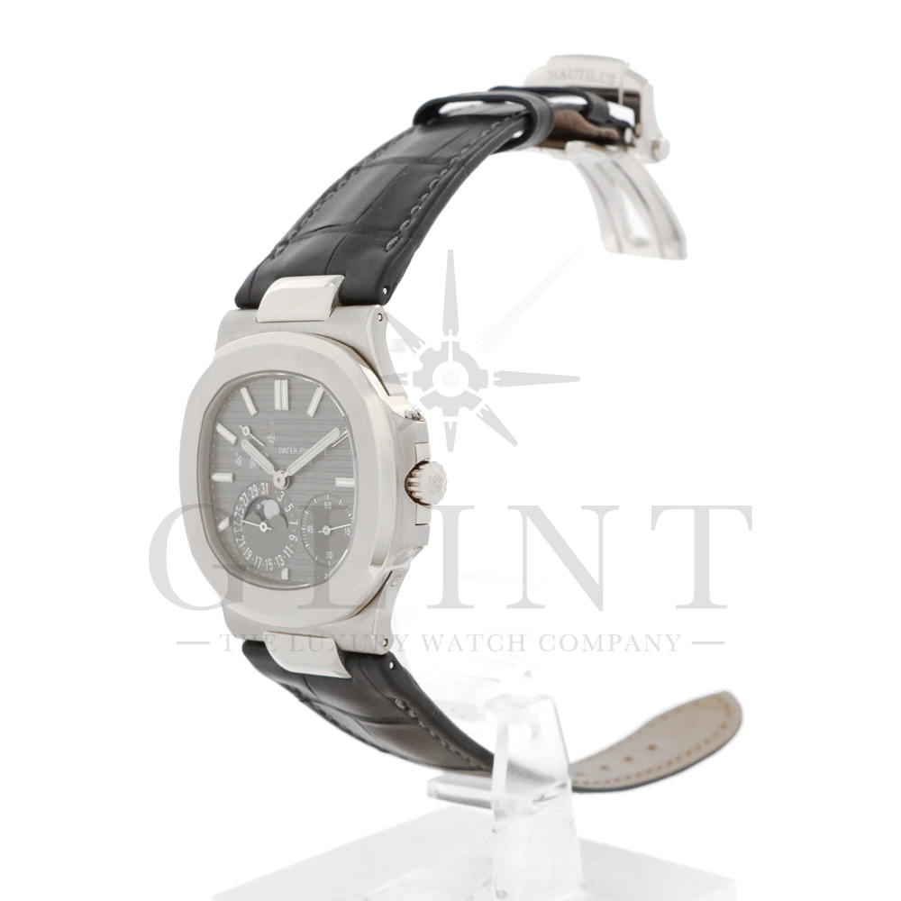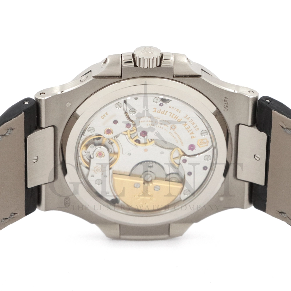 こちらのRef.5712Gはノーチラスが誕生して30周年を迎えた2006年に新たなラインナップとして発表されたコレクションの中でも高い人気を誇るモデルで、ポインターデイト、ムーンフェイズ、パワーリザーブなど様々な機能を搭載したプチコンプリケーションが魅力の一つです。多機能ながらこれほどまでの薄型を実現する事が出来るのも世界最高水準の時計技術を誇るパテックフィリップだからこそ。そしてケースにはホワイトゴールドを採用し、エレガンスな印象をより一層強調してくれます。更にはノーチラスシリーズでは初となる革ベルトを採用しており、スポーツモデルながらもフォーマルな印象も与え、ステータス性の高い洗練された大人の雰囲気を演出してくれる魅力的な逸品です。