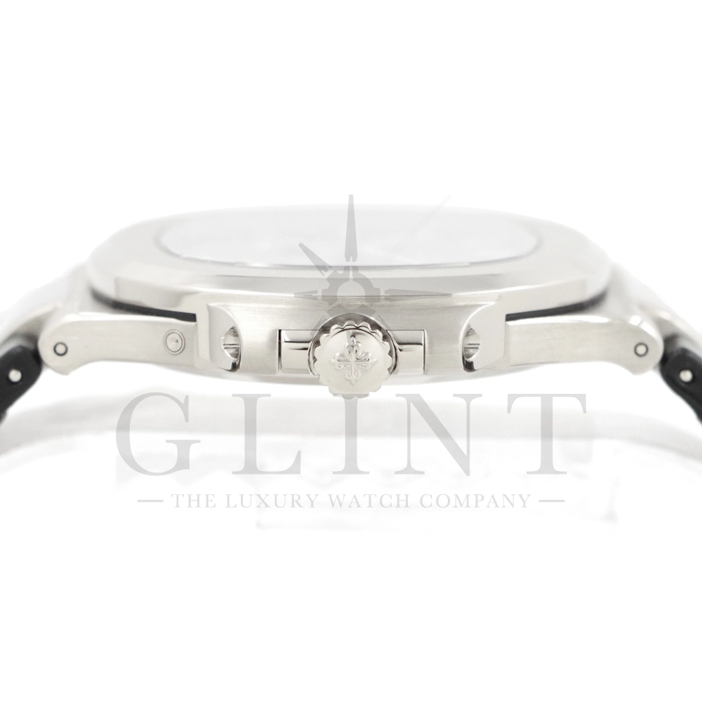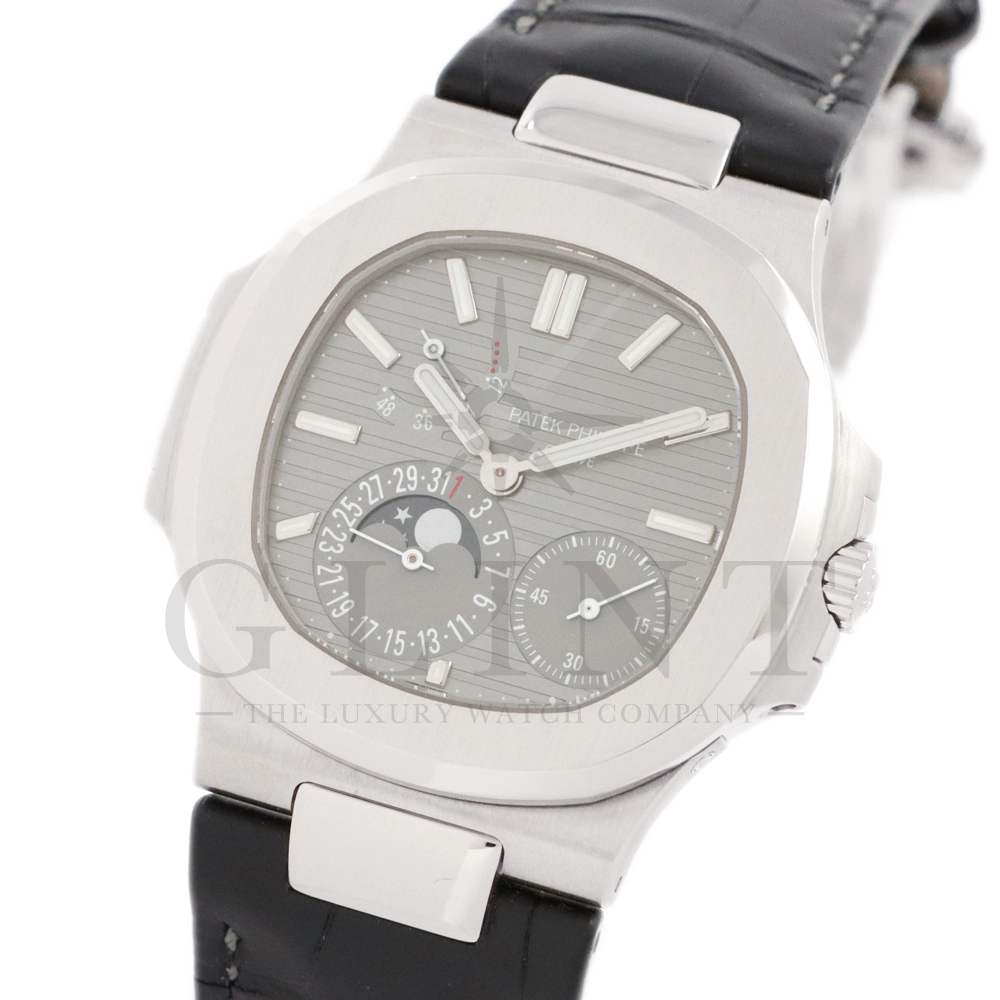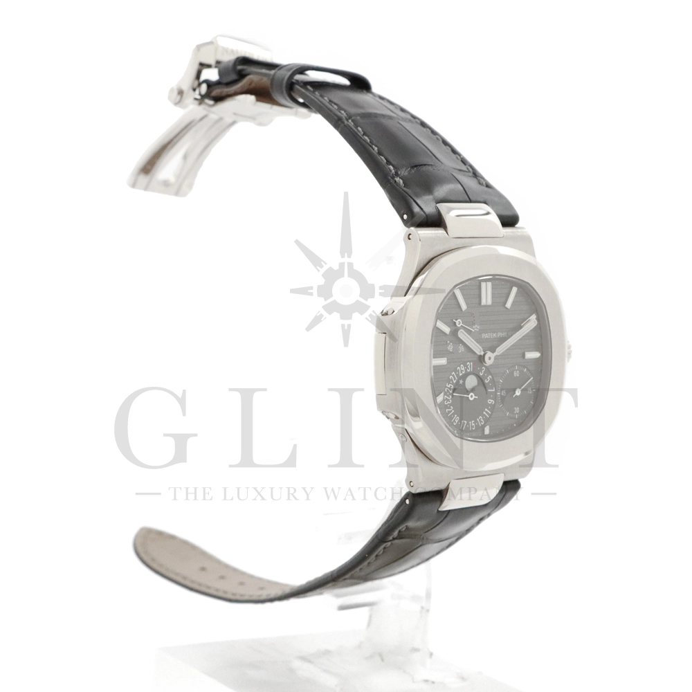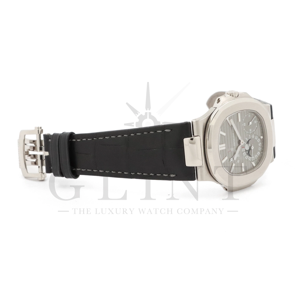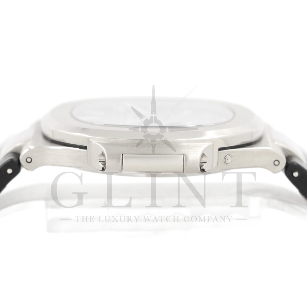 こちらのRef.5712Gはノーチラスが誕生して30周年を迎えた2006年に新たなラインナップとして発表されたコレクションの中でも高い人気を誇るモデルで、ポインターデイト、ムーンフェイズ、パワーリザーブなど様々な機能を搭載したプチコンプリケーションが魅力の一つです。多機能ながらこれほどまでの薄型を実現する事が出来るのも世界最高水準の時計技術を誇るパテックフィリップだからこそ。そしてケースにはホワイトゴールドを採用し、エレガンスな印象をより一層強調してくれます。更にはノーチラスシリーズでは初となる革ベルトを採用しており、スポーツモデルながらもフォーマルな印象も与え、ステータス性の高い洗練された大人の雰囲気を演出してくれる魅力的な逸品です。