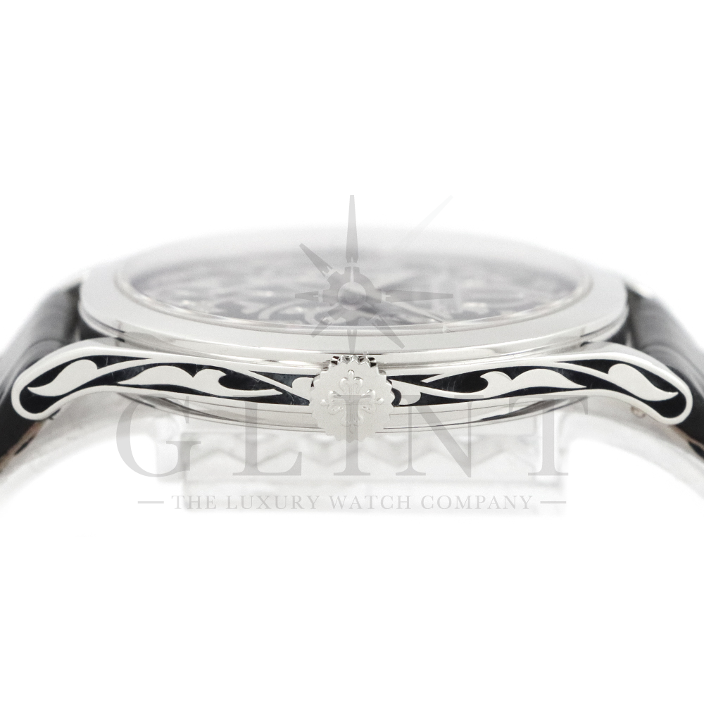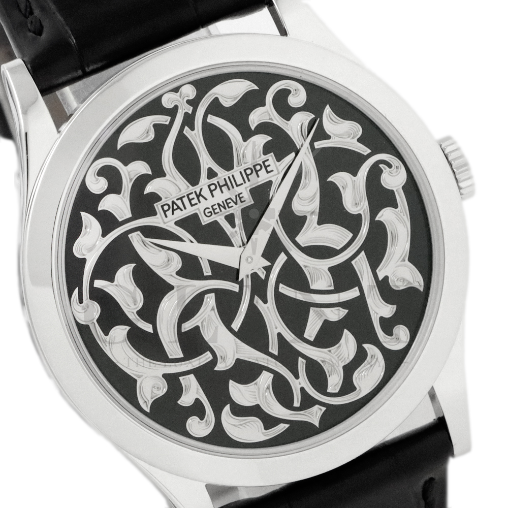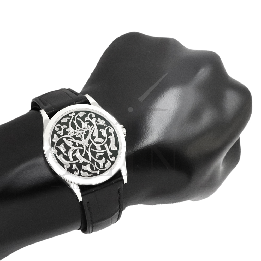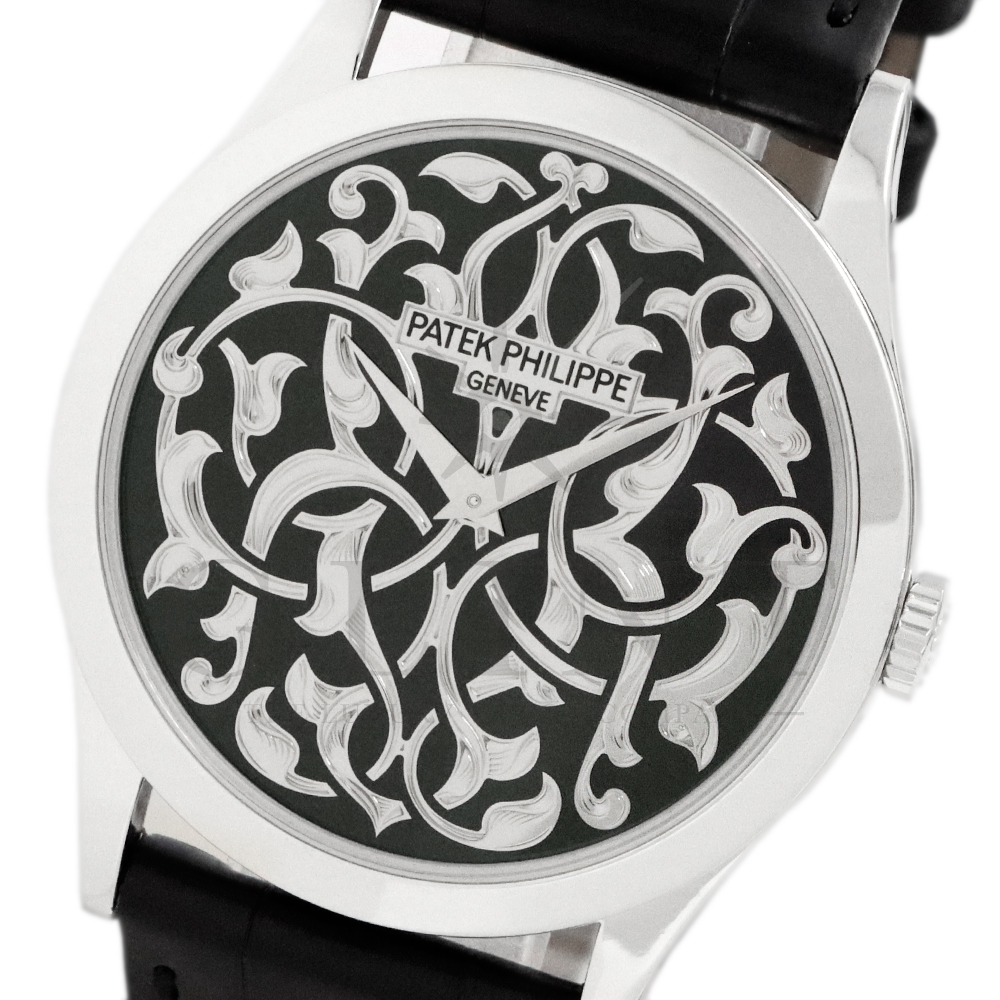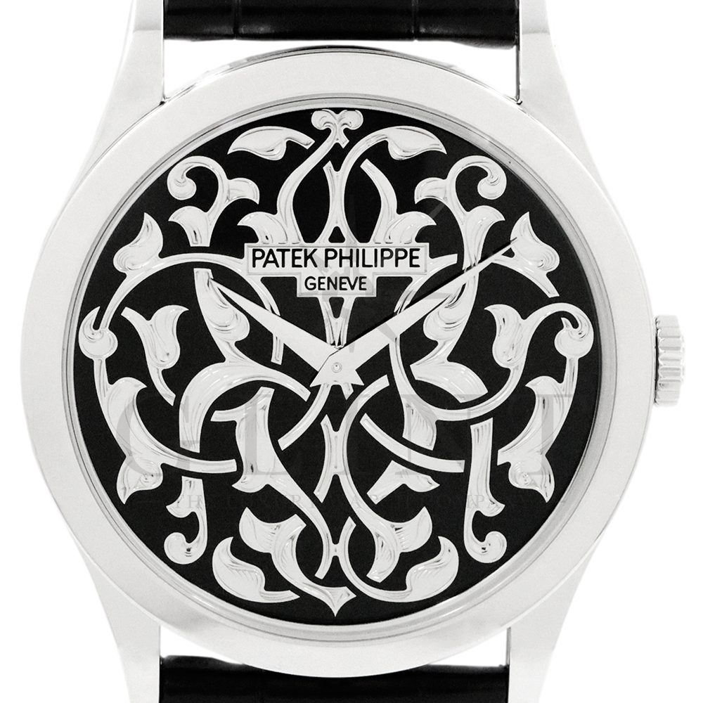 こちらはパテックフィリップ カラトラバ 5088/100P-001です。パテック フィリップを代表するドレスウォッチに、芸術的とも言える装飾を施した至高のタイムピース。プラチナ製ケースには、ブランドを象徴するクルー・ド・パリ装飾をベースに、熟練職人の手作業によるハンドエングレービングとエナメル装飾を融合し、圧倒的な存在感を放ちます。ダイヤルには深みのあるブラックエナメルを採用し、繊細な装飾と完璧なバランスで調和。シンプルな2針仕様ながら、細部に至るまで妥協のない仕上がりは、パテック フィリップならではの美学と技術力を物語ります。搭載されているCal.240は、パテック フィリップが誇る超薄型自動巻ムーブメント。マイクロローター(偏心ローター)方式を採用することで、ムーブメント全体の薄さを保ちながらも安定した巻き上げ効率を実現しています。地板・ブリッジには入念な面取りやコート・ド・ジュネーブ装飾が施され、ジュネーブ・シール(現行ではパテック フィリップ・シール)に準拠した最高水準の仕上げと精度を確保。薄型でありながらも高い耐久性と信頼性を兼ね備えています。量産とは一線を画す極めて希少なモデルであり、単なる腕時計の枠を超えた“身に着ける芸術品”として、コレクターからも高い評価を受ける一本です。