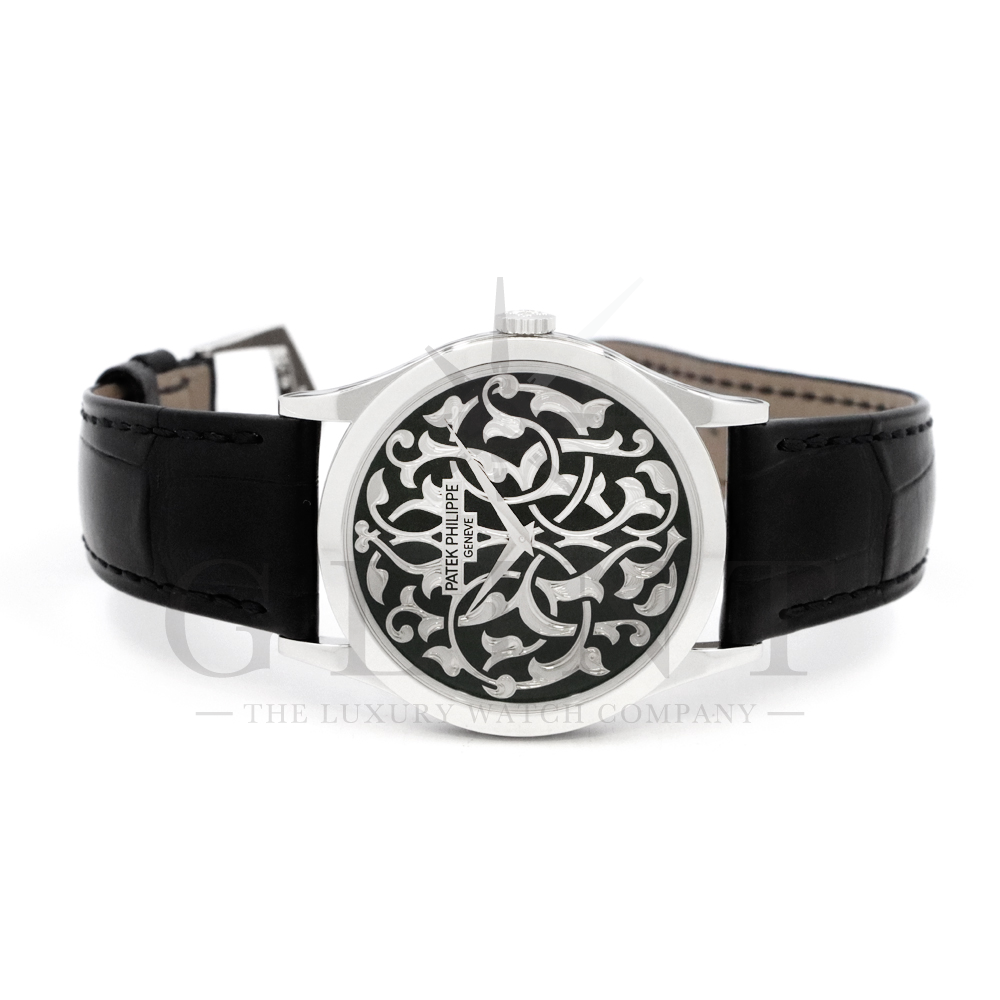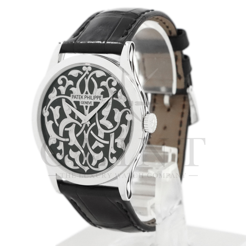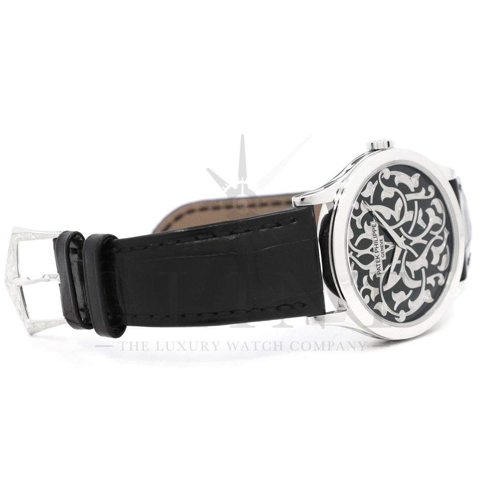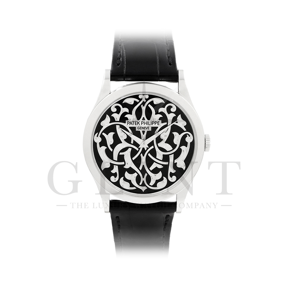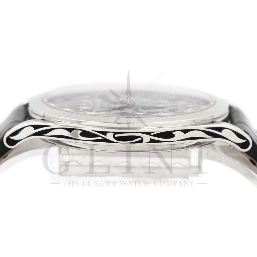 こちらはパテックフィリップ カラトラバ 5088/100P-001です。パテック フィリップを代表するドレスウォッチに、芸術的とも言える装飾を施した至高のタイムピース。プラチナ製ケースには、ブランドを象徴するクルー・ド・パリ装飾をベースに、熟練職人の手作業によるハンドエングレービングとエナメル装飾を融合し、圧倒的な存在感を放ちます。ダイヤルには深みのあるブラックエナメルを採用し、繊細な装飾と完璧なバランスで調和。シンプルな2針仕様ながら、細部に至るまで妥協のない仕上がりは、パテック フィリップならではの美学と技術力を物語ります。搭載されているCal.240は、パテック フィリップが誇る超薄型自動巻ムーブメント。マイクロローター(偏心ローター)方式を採用することで、ムーブメント全体の薄さを保ちながらも安定した巻き上げ効率を実現しています。地板・ブリッジには入念な面取りやコート・ド・ジュネーブ装飾が施され、ジュネーブ・シール(現行ではパテック フィリップ・シール)に準拠した最高水準の仕上げと精度を確保。薄型でありながらも高い耐久性と信頼性を兼ね備えています。量産とは一線を画す極めて希少なモデルであり、単なる腕時計の枠を超えた“身に着ける芸術品”として、コレクターからも高い評価を受ける一本です。