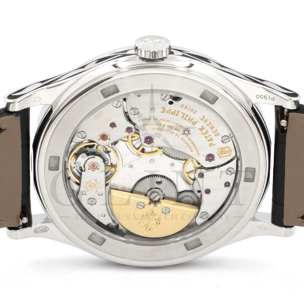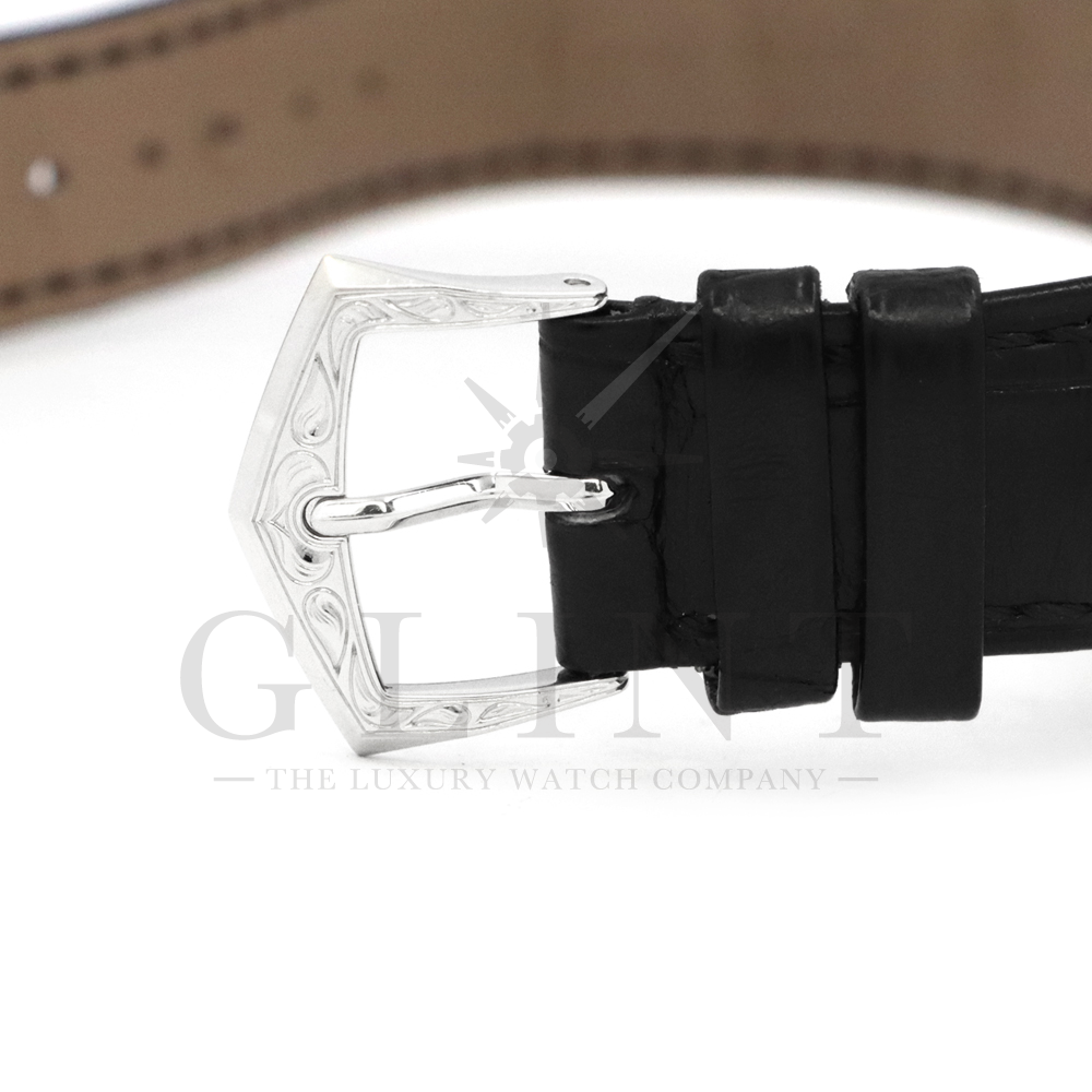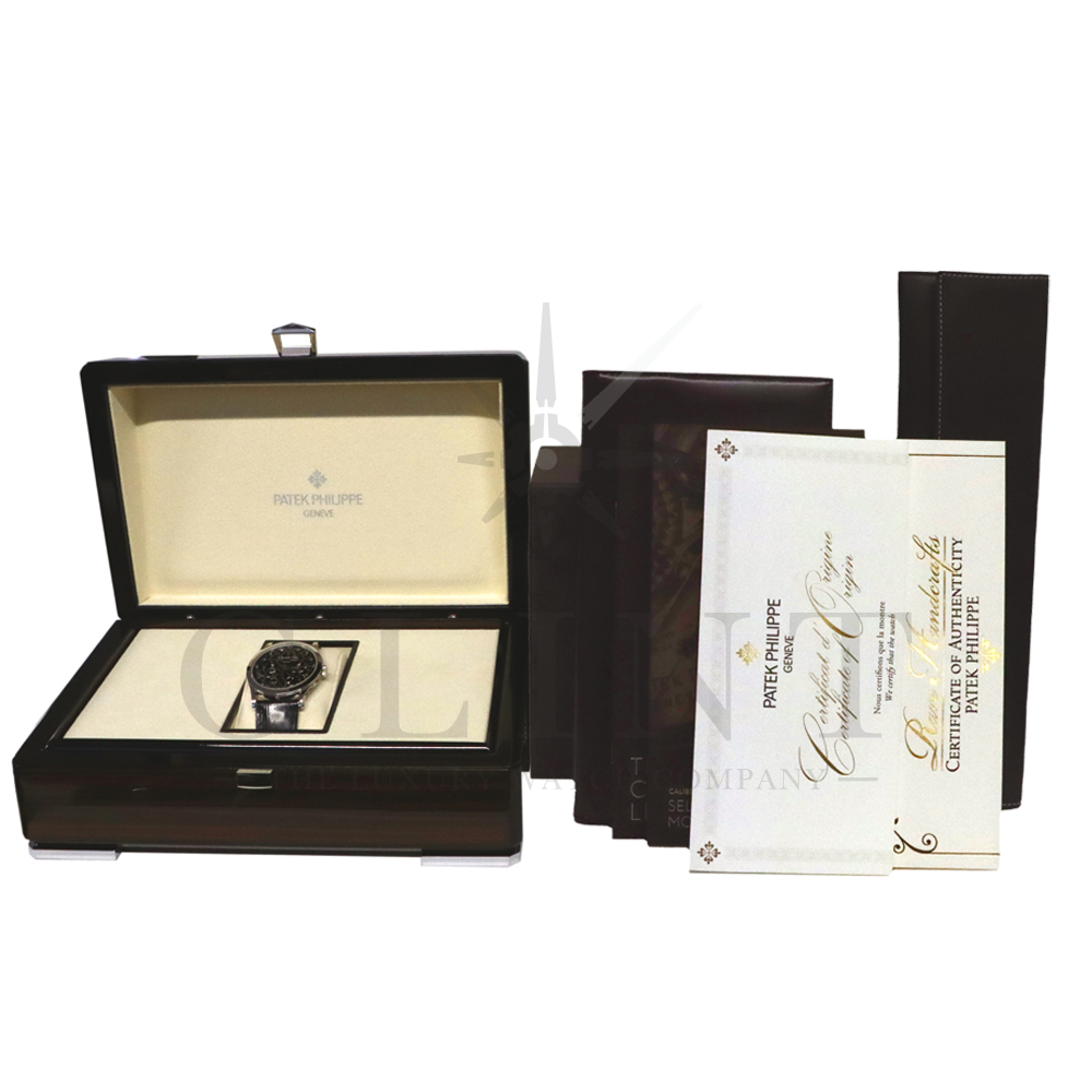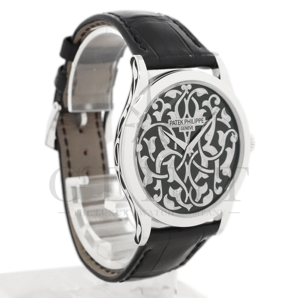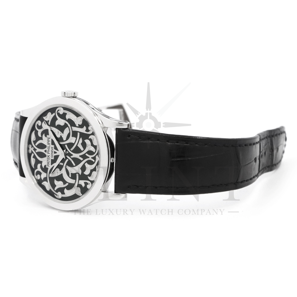 こちらはパテックフィリップ カラトラバ 5088/100P-001です。パテック フィリップを代表するドレスウォッチに、芸術的とも言える装飾を施した至高のタイムピース。プラチナ製ケースには、ブランドを象徴するクルー・ド・パリ装飾をベースに、熟練職人の手作業によるハンドエングレービングとエナメル装飾を融合し、圧倒的な存在感を放ちます。ダイヤルには深みのあるブラックエナメルを採用し、繊細な装飾と完璧なバランスで調和。シンプルな2針仕様ながら、細部に至るまで妥協のない仕上がりは、パテック フィリップならではの美学と技術力を物語ります。搭載されているCal.240は、パテック フィリップが誇る超薄型自動巻ムーブメント。マイクロローター(偏心ローター)方式を採用することで、ムーブメント全体の薄さを保ちながらも安定した巻き上げ効率を実現しています。地板・ブリッジには入念な面取りやコート・ド・ジュネーブ装飾が施され、ジュネーブ・シール(現行ではパテック フィリップ・シール)に準拠した最高水準の仕上げと精度を確保。薄型でありながらも高い耐久性と信頼性を兼ね備えています。量産とは一線を画す極めて希少なモデルであり、単なる腕時計の枠を超えた“身に着ける芸術品”として、コレクターからも高い評価を受ける一本です。