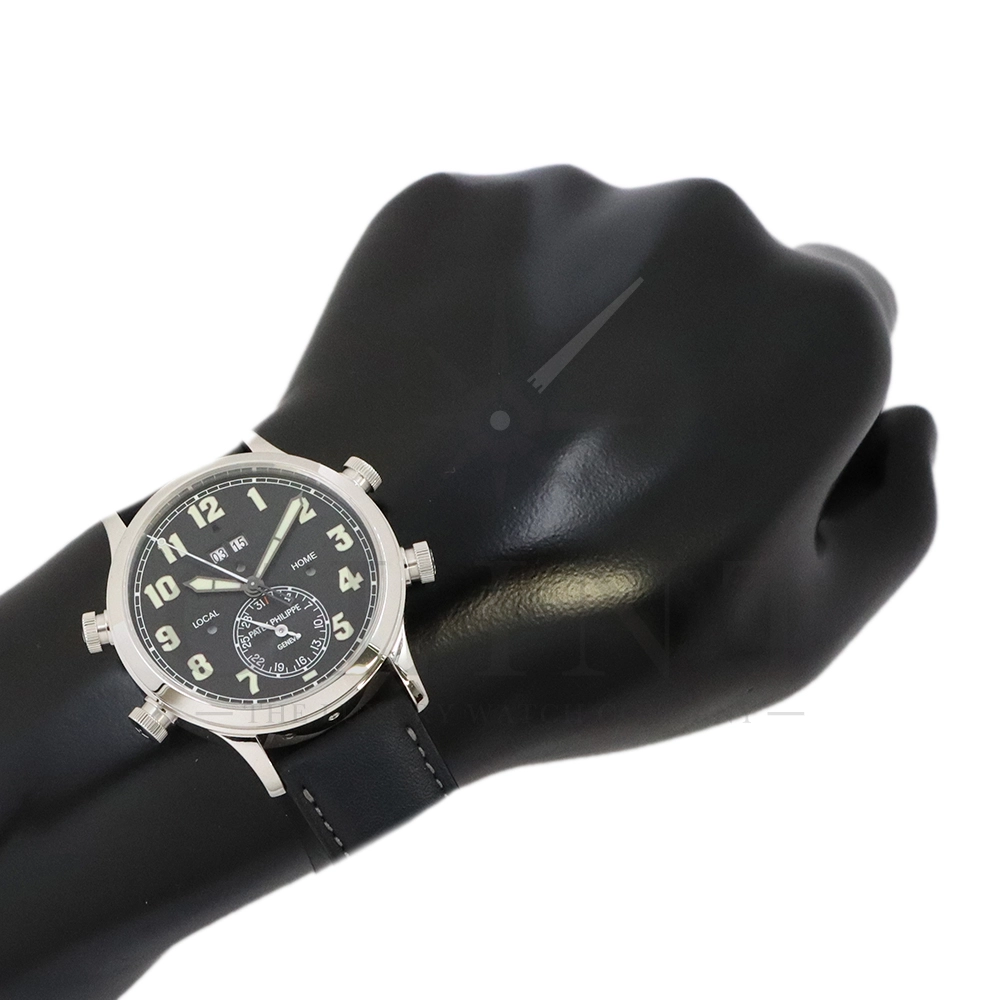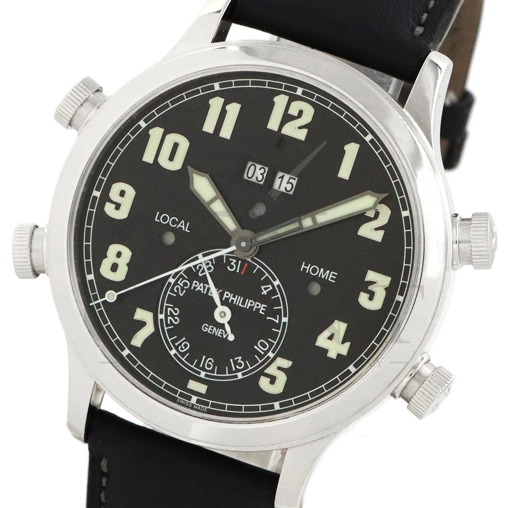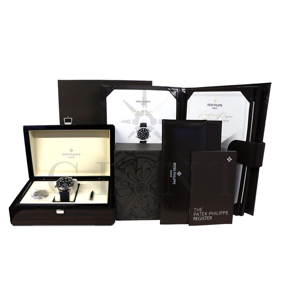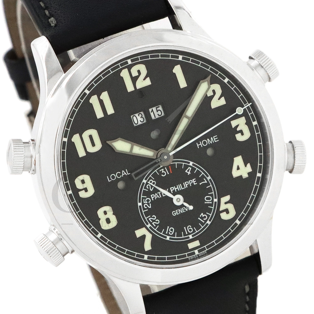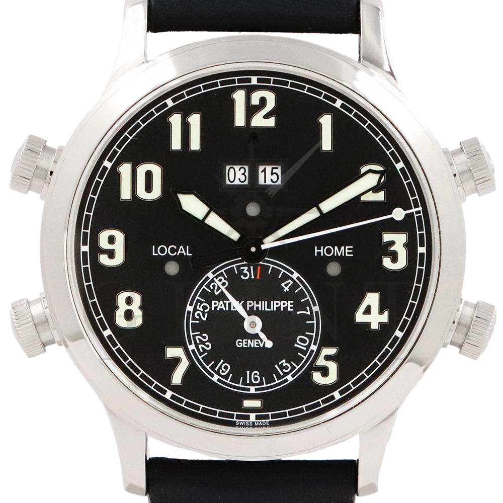 こちらはパテックフィリップ グランドコンプリケーション アラーム・トラベルタイム5520P-001です。トラベルタイムのエクスクルーシブなデュアル・タイムゾーン機構に、24時間表示アラームを組み合わせたパテックフィリップの歴史上にも例のない新機構を搭載したグランドコンプリケーション。パイロット・トラベルタイムのデザインを反映した、エレガントなプラチナケースに収められています。テクニカルでエレガントな魅力に溢れた文字盤は、最高の視認性を誇ると共に、アヴィエーター・ウォッチとしての出自を強調。大型の植字アラビア数字と幅広のバトン型指針(いずれもスーパールミノヴァ夜光付ホワイトゴールド製)は、エボニーブラック・ソレイユ文字盤と完璧なコントラストをなしております。ストラップには文字盤カラーにマッチしたマット・ブラックに反対色のステッチが入ったカーフスキン・バンドを装着。採用されたプラチナ製のネジ止めピンバックルは、アヴィエーター・タイムピースのために特別にデザインされたものです。ムーブメントには5年にわたる開発努力の賜物である、アラーム機構に関する4件の技術特許を取得した新キャリバーAL 30-660 S C FUSを搭載。574個の部品から構成されたムーブメントは中央ローターを備え、直径31mm、厚さは6.6 mm。Gyromax®テンプに加え、シリコン・ベースのハイテク素材Silinvar®製Spiromax® 髭ぜんまいが採用されています。サファイヤクリスタル・バックを通してムーブメントの洗練されたアーキテクチャーと、面取りとポリッシュ仕上げを施した受け(ブリッジ)、サーキュラー・コート・ド・ジュネーブを施し、新しい丸い凹みを備えた21金中央ローターなどの精緻な仕上がりを鑑賞することができるでしょう。世界に飛翔するトラベラーに最適な究極のタイムピースは、革新的なアラーム機構とデュアル・タイムゾーン機構を備え、タイムピースの時を超越した美しさと共に機能性と信頼性の向上を絶え間なく追究するという、パテック フィリップにおける技術革新の伝統を完璧に体現している史上初の防水性を備えたチャイムウォッチです。