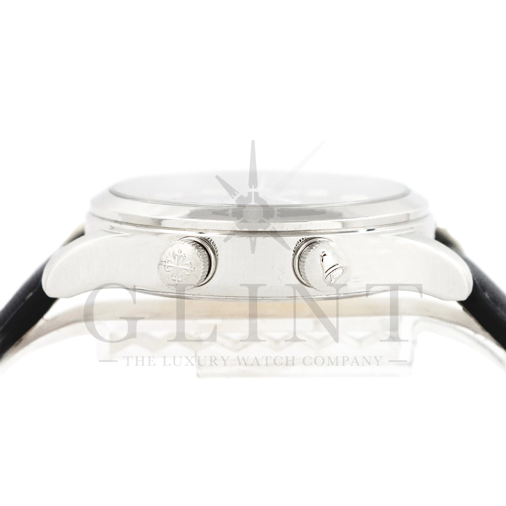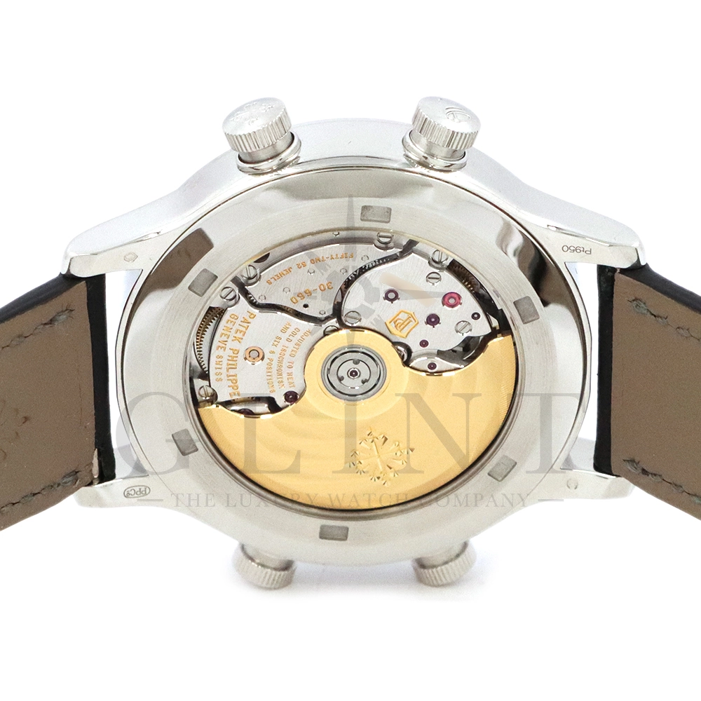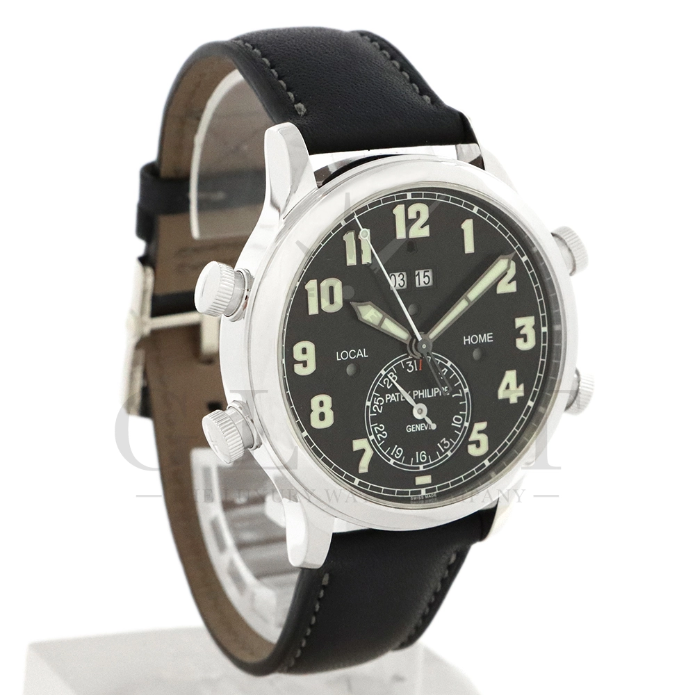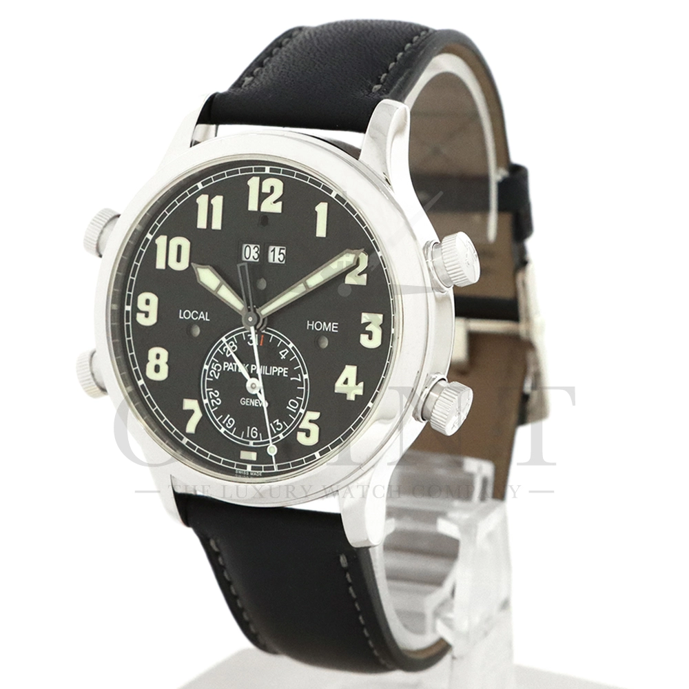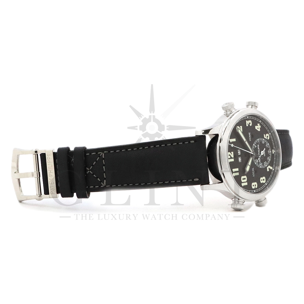 こちらはパテックフィリップ グランドコンプリケーション アラーム・トラベルタイム5520P-001です。トラベルタイムのエクスクルーシブなデュアル・タイムゾーン機構に、24時間表示アラームを組み合わせたパテックフィリップの歴史上にも例のない新機構を搭載したグランドコンプリケーション。パイロット・トラベルタイムのデザインを反映した、エレガントなプラチナケースに収められています。テクニカルでエレガントな魅力に溢れた文字盤は、最高の視認性を誇ると共に、アヴィエーター・ウォッチとしての出自を強調。大型の植字アラビア数字と幅広のバトン型指針(いずれもスーパールミノヴァ夜光付ホワイトゴールド製)は、エボニーブラック・ソレイユ文字盤と完璧なコントラストをなしております。ストラップには文字盤カラーにマッチしたマット・ブラックに反対色のステッチが入ったカーフスキン・バンドを装着。採用されたプラチナ製のネジ止めピンバックルは、アヴィエーター・タイムピースのために特別にデザインされたものです。ムーブメントには5年にわたる開発努力の賜物である、アラーム機構に関する4件の技術特許を取得した新キャリバーAL 30-660 S C FUSを搭載。574個の部品から構成されたムーブメントは中央ローターを備え、直径31mm、厚さは6.6 mm。Gyromax®テンプに加え、シリコン・ベースのハイテク素材Silinvar®製Spiromax® 髭ぜんまいが採用されています。サファイヤクリスタル・バックを通してムーブメントの洗練されたアーキテクチャーと、面取りとポリッシュ仕上げを施した受け(ブリッジ)、サーキュラー・コート・ド・ジュネーブを施し、新しい丸い凹みを備えた21金中央ローターなどの精緻な仕上がりを鑑賞することができるでしょう。世界に飛翔するトラベラーに最適な究極のタイムピースは、革新的なアラーム機構とデュアル・タイムゾーン機構を備え、タイムピースの時を超越した美しさと共に機能性と信頼性の向上を絶え間なく追究するという、パテック フィリップにおける技術革新の伝統を完璧に体現している史上初の防水性を備えたチャイムウォッチです。