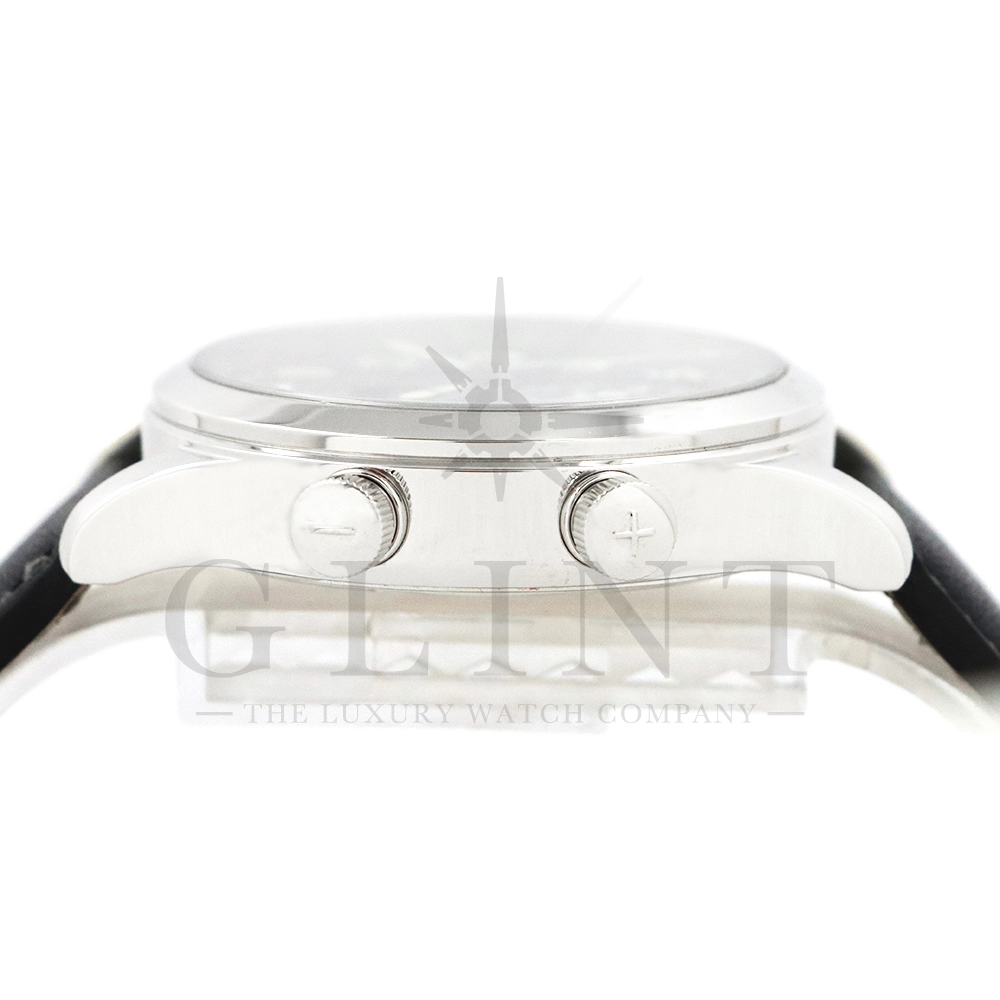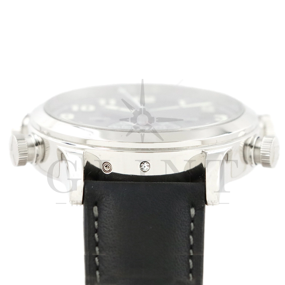 ベルト:マット・ブラックに反対色のステッチが入ったカーフスキン、プラチナ製ネジ止めピンバックル