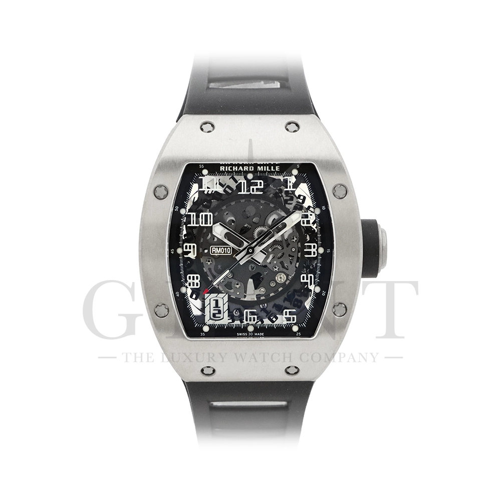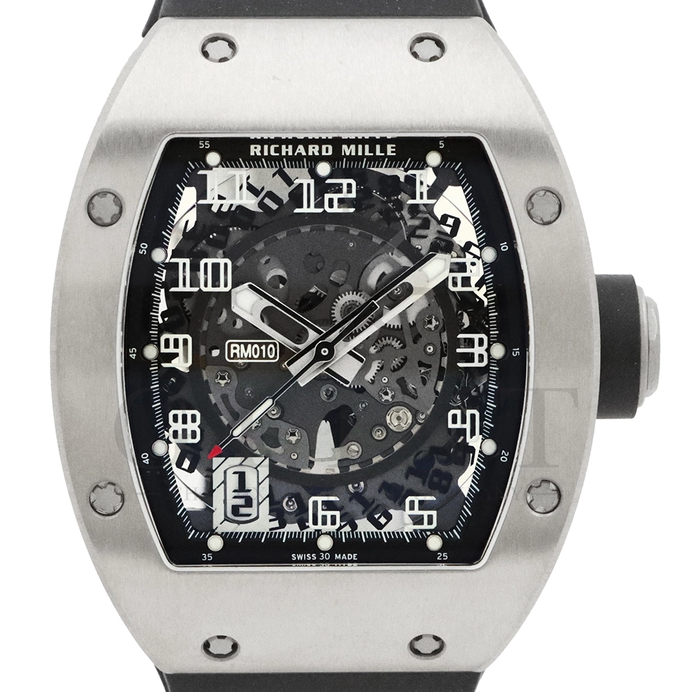 こちらはリシャール ミル RM010 オートマティックです。ブランドの哲学である「究極の実用高級時計」を体現する自動巻きモデル。先進素材と革新的な機構を融合し、ラグジュアリーでありながら日常使用にも耐えうる性能を備えています。ケースには航空宇宙分野でも採用されるグレード5チタンを使用。軽量でありながら非常に高い強度と耐腐食性を誇り、長時間の着用でも快適な装着感を実現します。リシャール・ミルを象徴する立体的なトノー型ケースは、人間工学に基づき設計され、手首に自然にフィット。サファイアクリスタル風防とシースルーバック仕様により、外装の美しさと内部機構の精緻さの両方を堪能できます。ムーブメントには自社開発の自動巻きキャリバー「RMAS7」を搭載。スケルトン構造により、精密に組み上げられた機械の鼓動を視覚的に楽しむことができます。地板やブリッジにもグレード5チタンを採用し、軽量化と高い耐久性を両立。約55時間のパワーリザーブ、時・分・秒表示に加え日付表示を備え、実用性にも優れています。さらに特筆すべきは、リシャール・ミル独自の可変慣性モーメントローターです。着用者の活動量に合わせて巻き上げ効率を最適化できるこの革新的機構により、常に安定したパフォーマンスを発揮。単なる高級時計ではなく、「機能する機械」としての完成度を追求しています。RM010 TIは、スポーツウォッチとしての堅牢性と、芸術品のような機械美を兼ね備えた一本です。洗練された存在感と先進技術が融合したこのモデルは、ビジネスシーンからプライベートまであらゆる場面で圧倒的な個性を演出します。リシャール・ミルの世界観を体現する代表的な自動巻きモデルとして、確かな価値を放ち続けるモデルです。