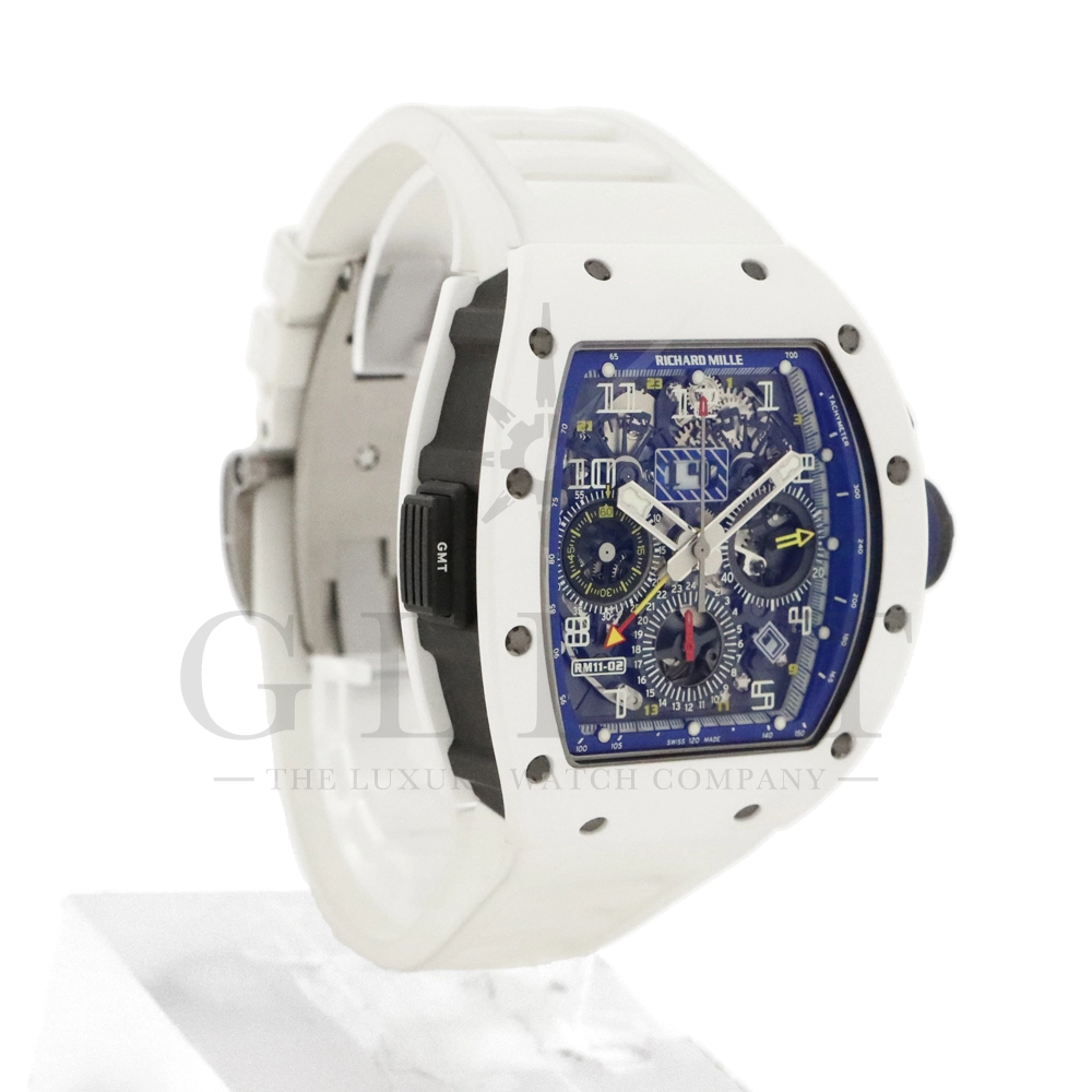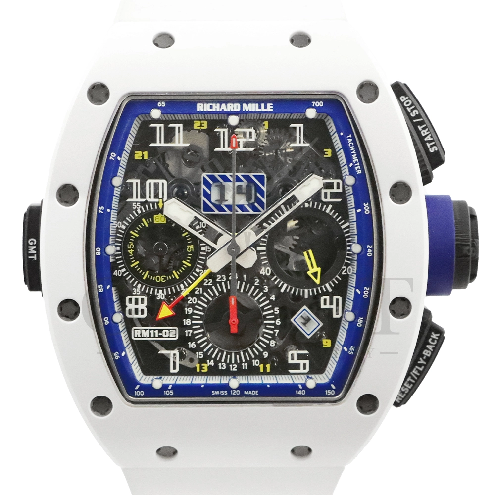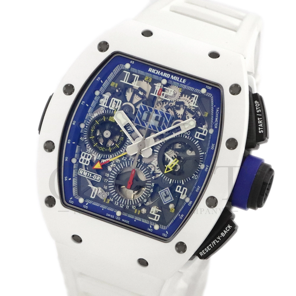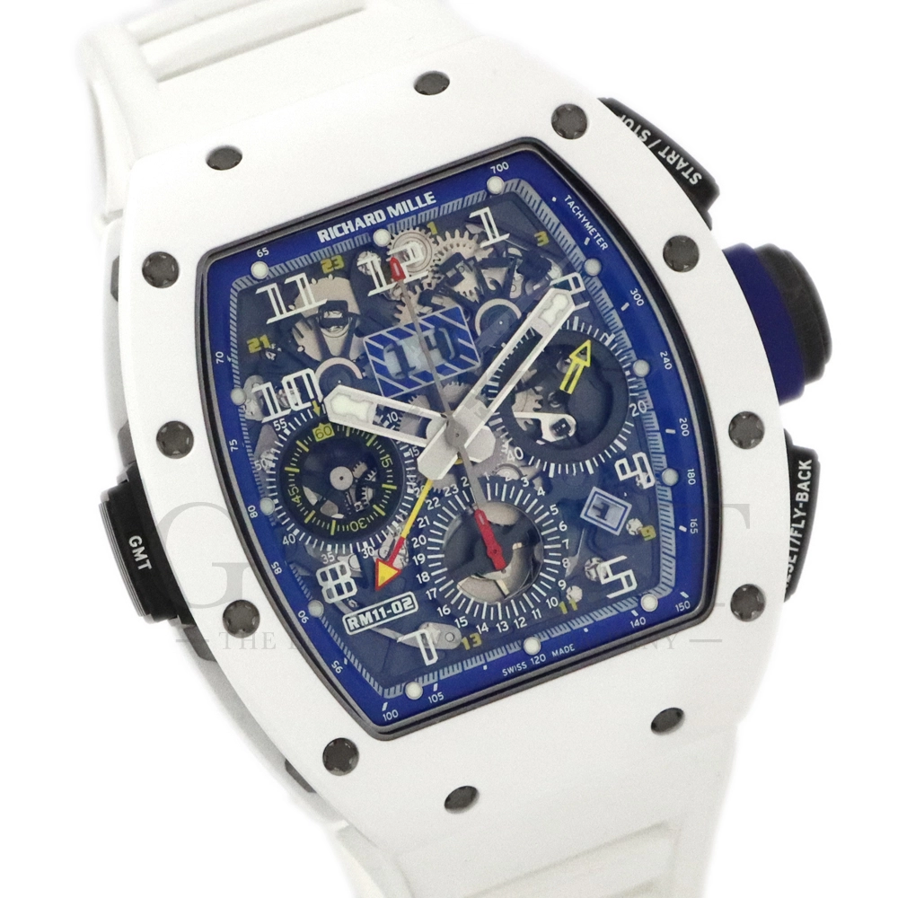 こちらはリシャールミル RM11-02 ジャパン ブルー 日本限定モデルです。ケースはホワイトセラミックス製のベゼルとTPTカーボン、リューズなどはチタン製の組み合わせ。ケースサイズは 42.7mm(W) × 50mm(H) のビッグサイズながら、軽量な複合素材を生かした装着感です。インナーベゼルとリューズにはブルーカラーを配色しております。搭載されるムーブメントCal.RMAC2はフライバック・クロノグラフ、アニュアル(年次)カレンダー機能を持ったビッグデイト表示、デュアルタイムゾーンを表示するUTC(世界標準時)表示機能、60分カウントダウンタイマー、24時間積算計を備え、約55時間のロングパワーリザーブを誇ります。僅か30本のみ生産された特別なタイムピースです。