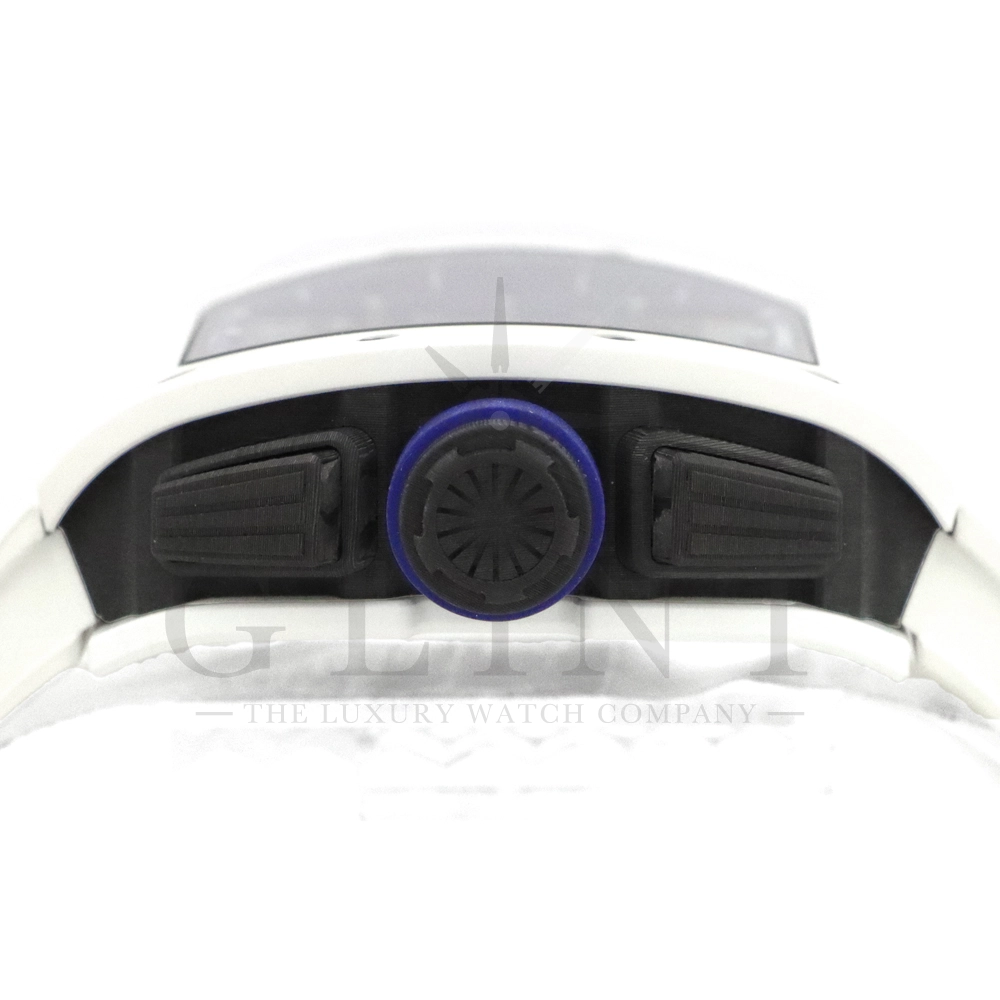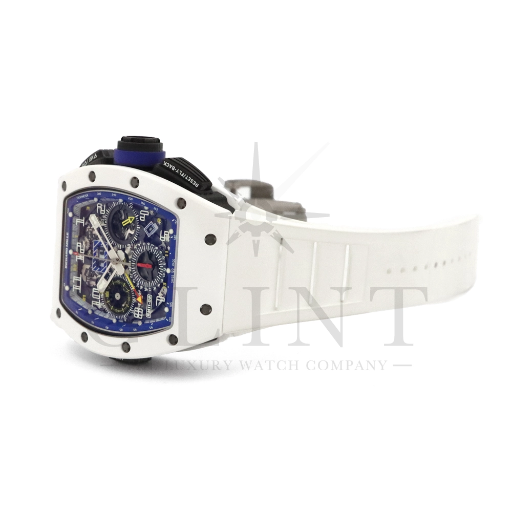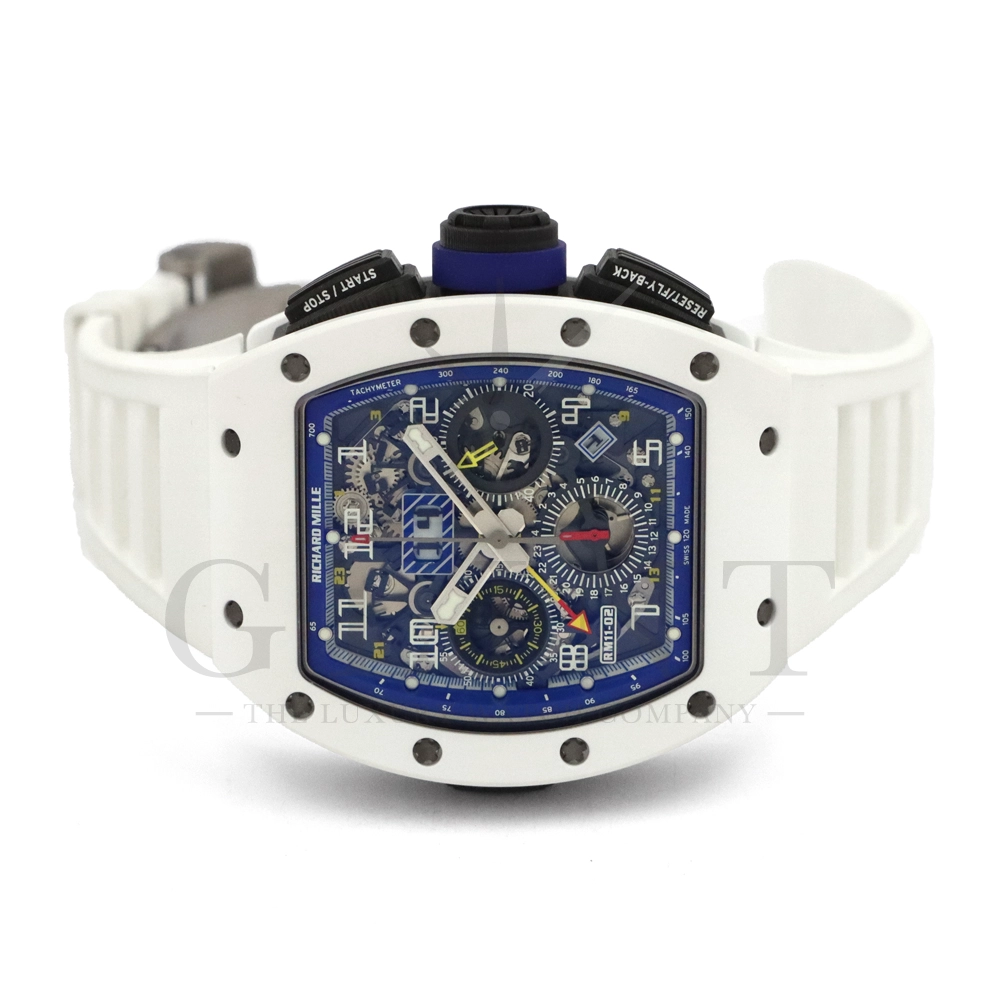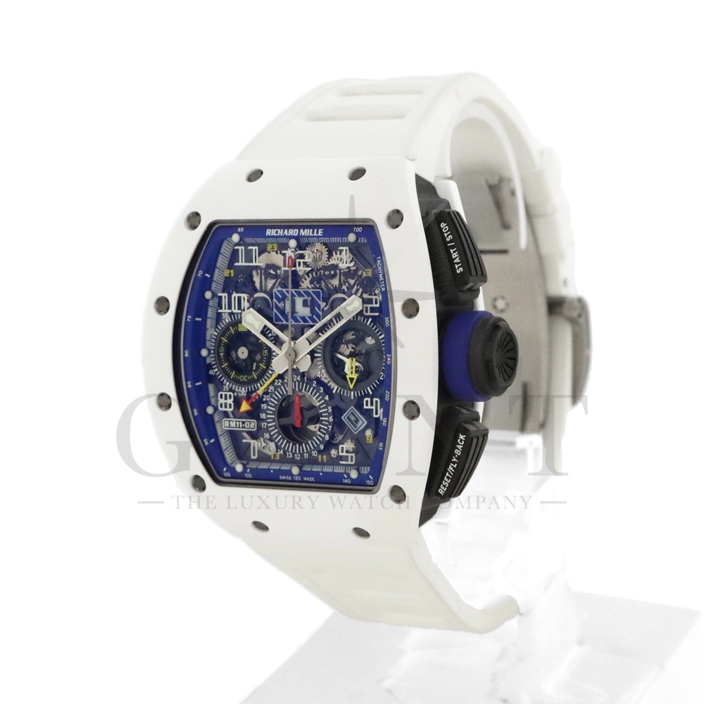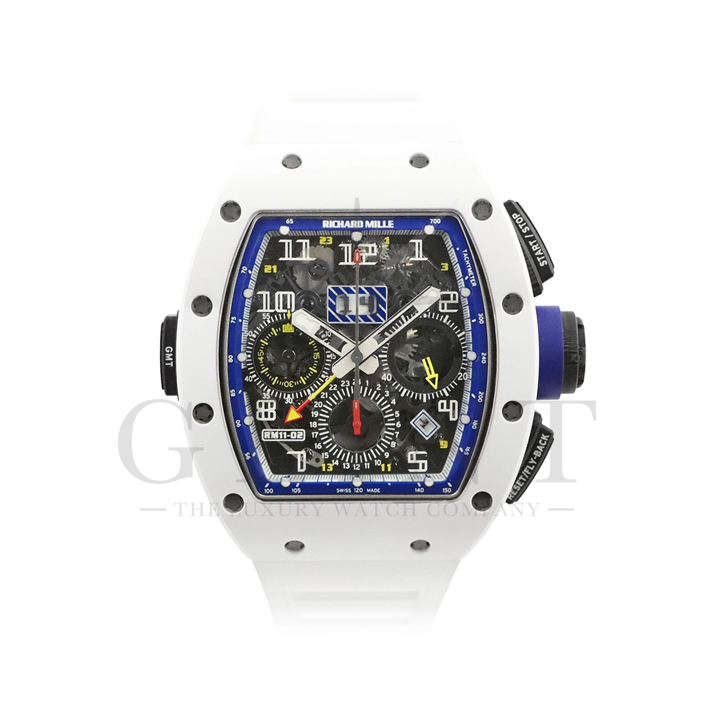こちらはリシャールミル RM11-02 ジャパン ブルー 日本限定モデルです。ケースはホワイトセラミックス製のベゼルとTPTカーボン、リューズなどはチタン製の組み合わせ。ケースサイズは 42.7mm(W) × 50mm(H) のビッグサイズながら、軽量な複合素材を生かした装着感です。インナーベゼルとリューズにはブルーカラーを配色しております。搭載されるムーブメントCal.RMAC2はフライバック・クロノグラフ、アニュアル(年次)カレンダー機能を持ったビッグデイト表示、デュアルタイムゾーンを表示するUTC(世界標準時)表示機能、60分カウントダウンタイマー、24時間積算計を備え、約55時間のロングパワーリザーブを誇ります。僅か30本のみ生産された特別なタイムピースです。