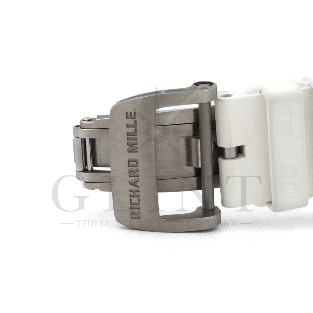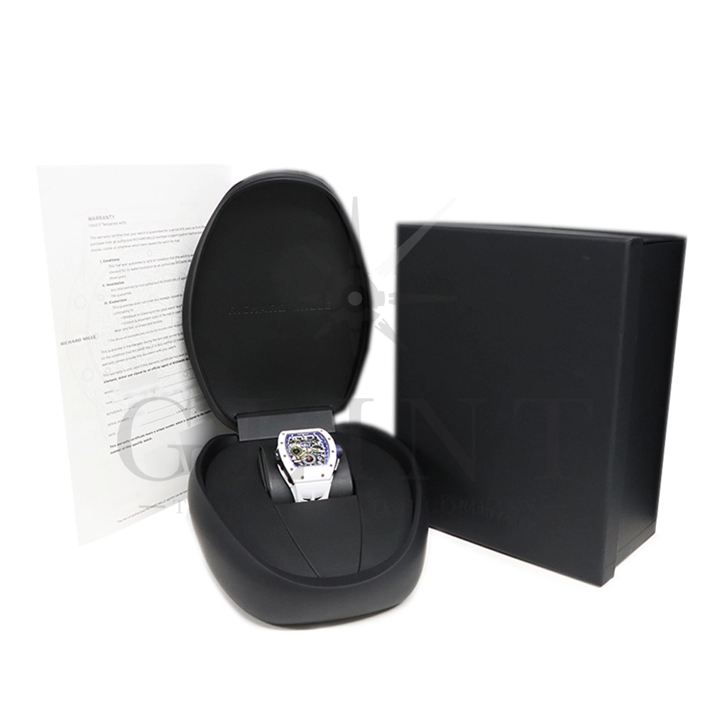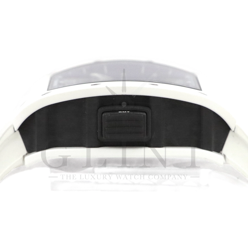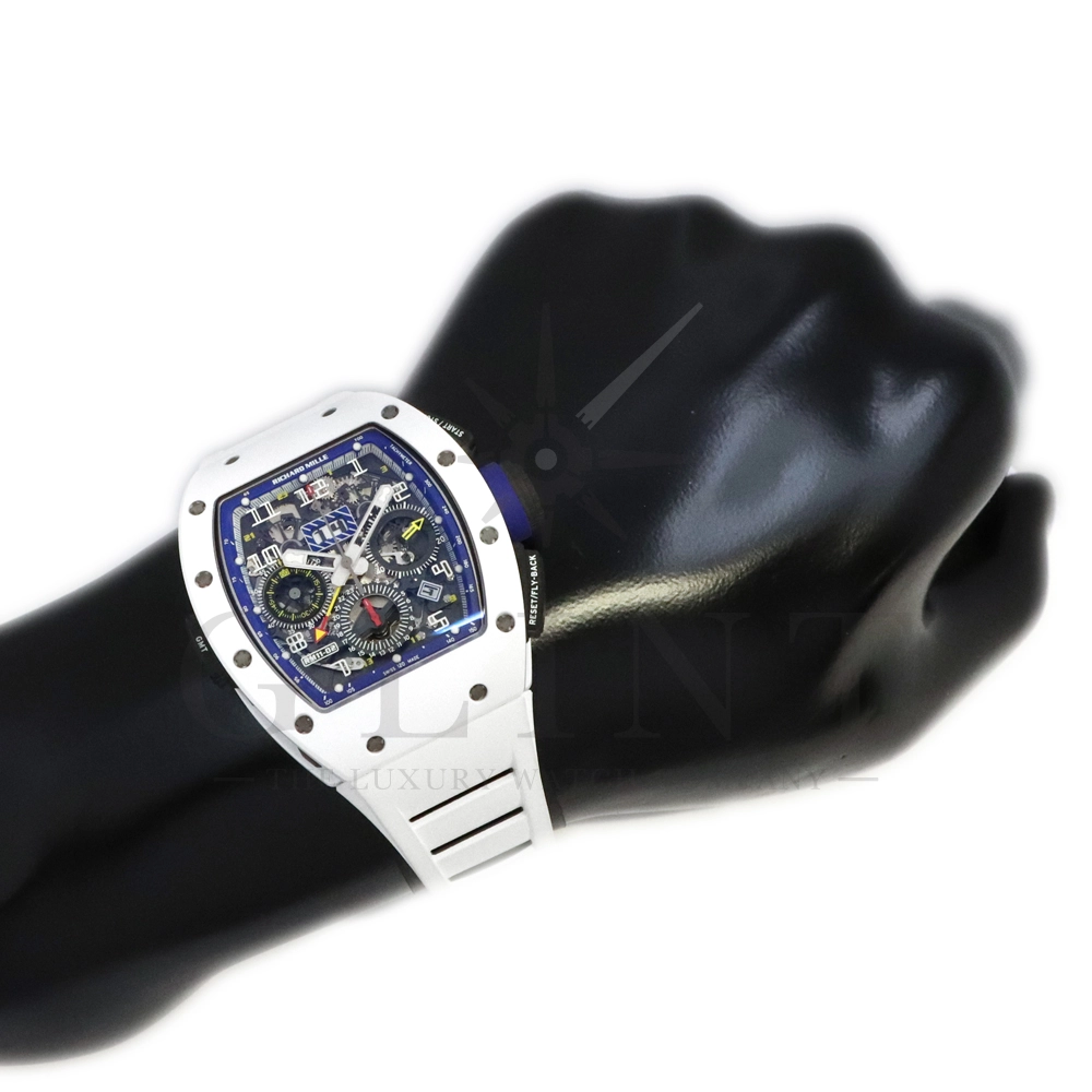 こちらはリシャールミル RM11-02 ジャパン ブルー 日本限定モデルです。ケースはホワイトセラミックス製のベゼルとTPTカーボン、リューズなどはチタン製の組み合わせ。ケースサイズは 42.7mm(W) × 50mm(H) のビッグサイズながら、軽量な複合素材を生かした装着感です。インナーベゼルとリューズにはブルーカラーを配色しております。搭載されるムーブメントCal.RMAC2はフライバック・クロノグラフ、アニュアル(年次)カレンダー機能を持ったビッグデイト表示、デュアルタイムゾーンを表示するUTC(世界標準時)表示機能、60分カウントダウンタイマー、24時間積算計を備え、約55時間のロングパワーリザーブを誇ります。僅か30本のみ生産された特別なタイムピースです。