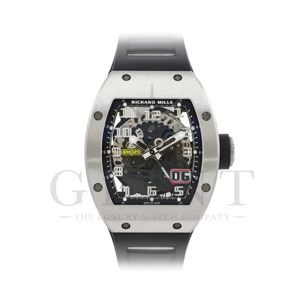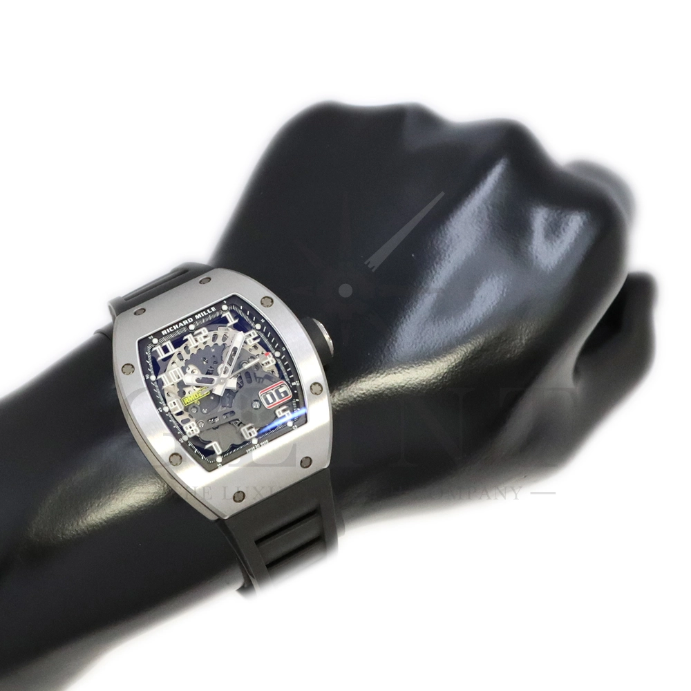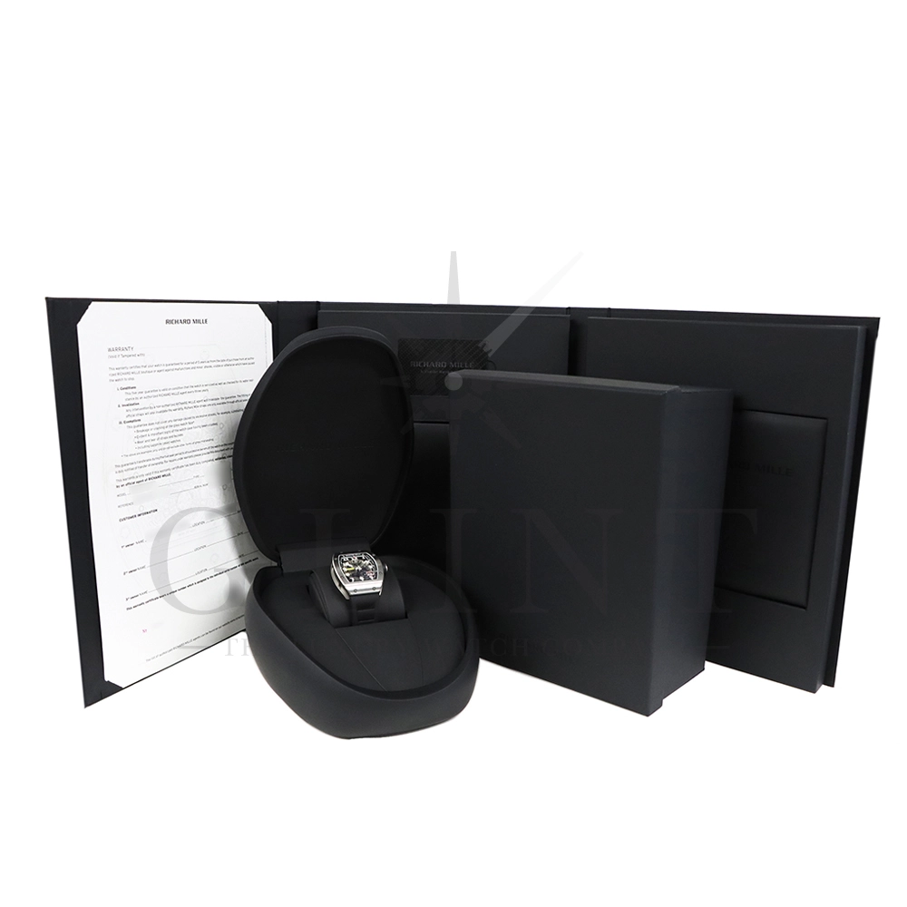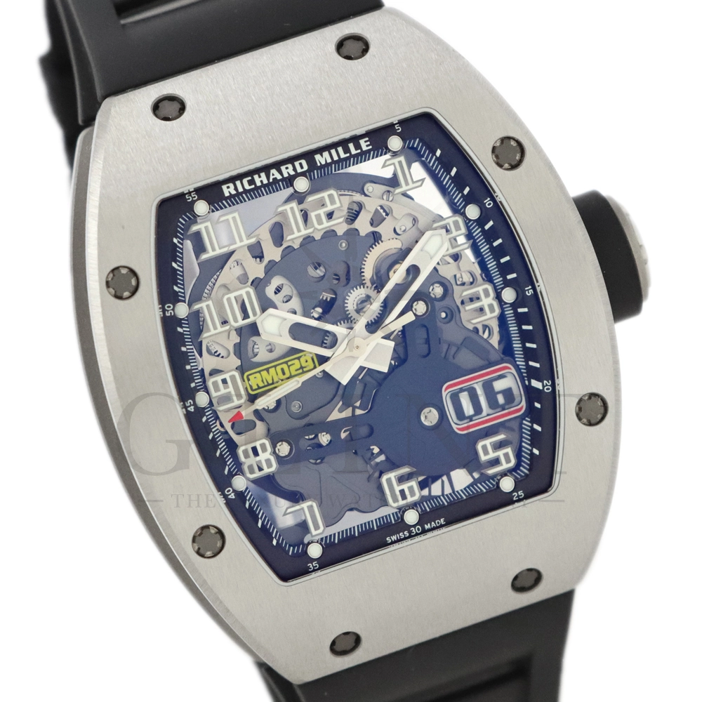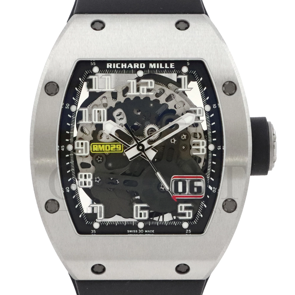 こちらはリシャールミル M029 Tiです。2011年に発表された本モデルは、同ブランドの自動巻きモデル「RM010」をベースに、実用性と視認性をさらに高めた進化系として誕生。4時位置に配置された2枚ディスクによるビッグデイト表示が特徴で、瞬時に日付を読み取ることが可能です。ケースには軽量かつ高強度なグレード5チタンを採用。トノー型ケース(約48.0mm × 39.7mm)は手首へのフィット感に優れ、見た目の存在感と装着性を両立しています。ムーブメントには自社開発の自動巻きキャリバーRMAS7を搭載し、約55時間のパワーリザーブを確保。さらに、着用者の動きに応じて巻き上げ効率を調整する可変慣性モーメントローターを備え、実用性と機械美を兼ね備えています。スケルトンダイヤルからは精緻なムーブメントの動きを楽しむことができ、リシャールミルならではの近未来的デザインと高度な技術力を体現した一本です。