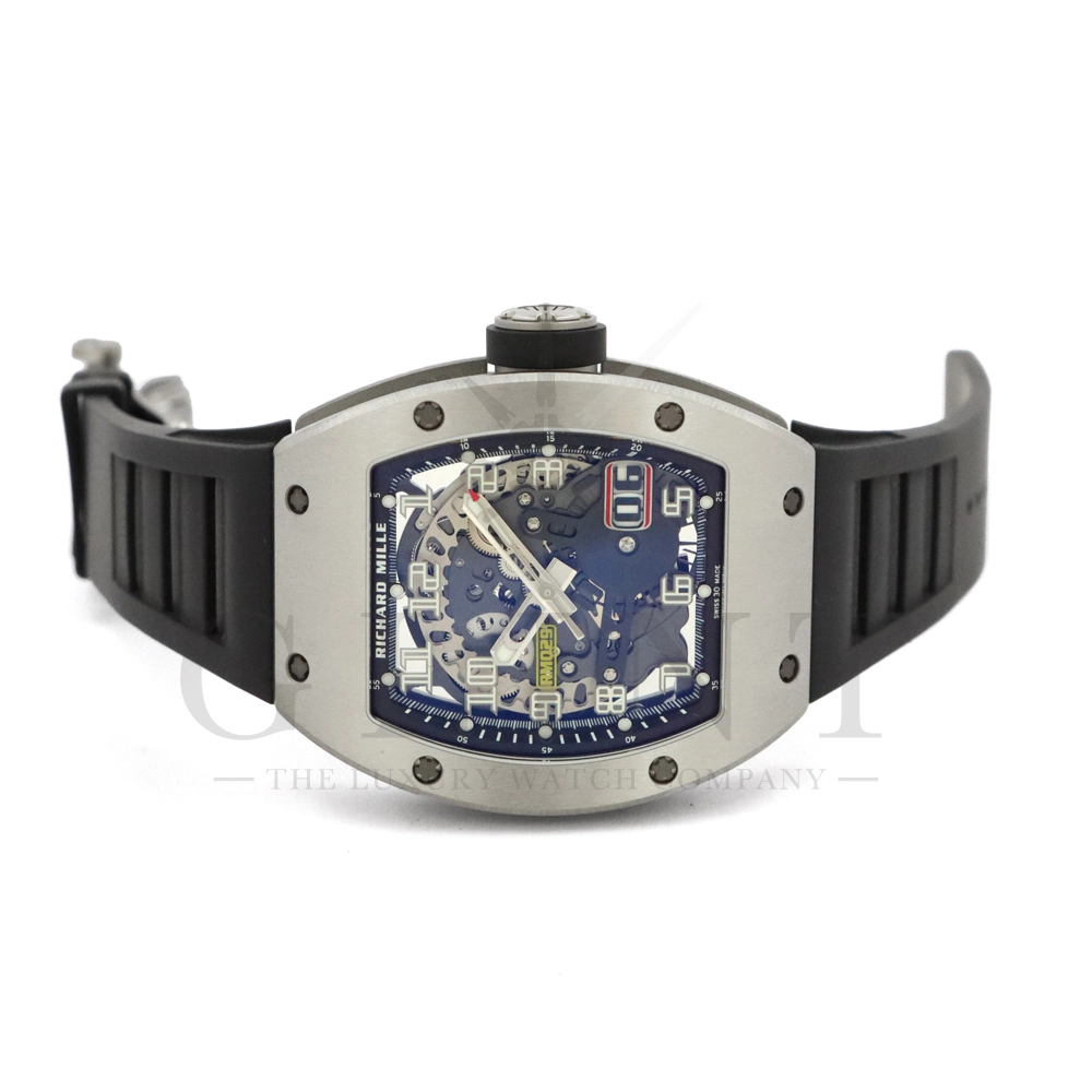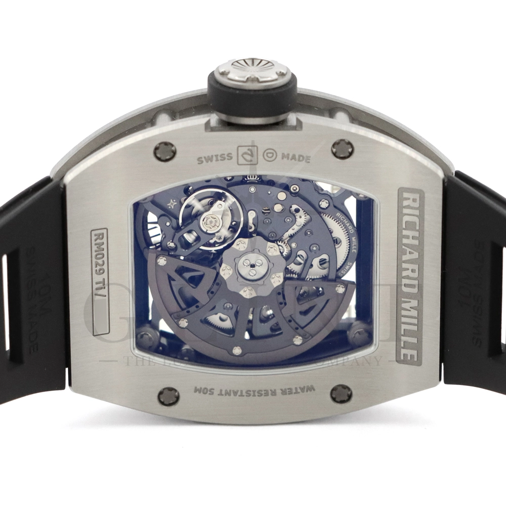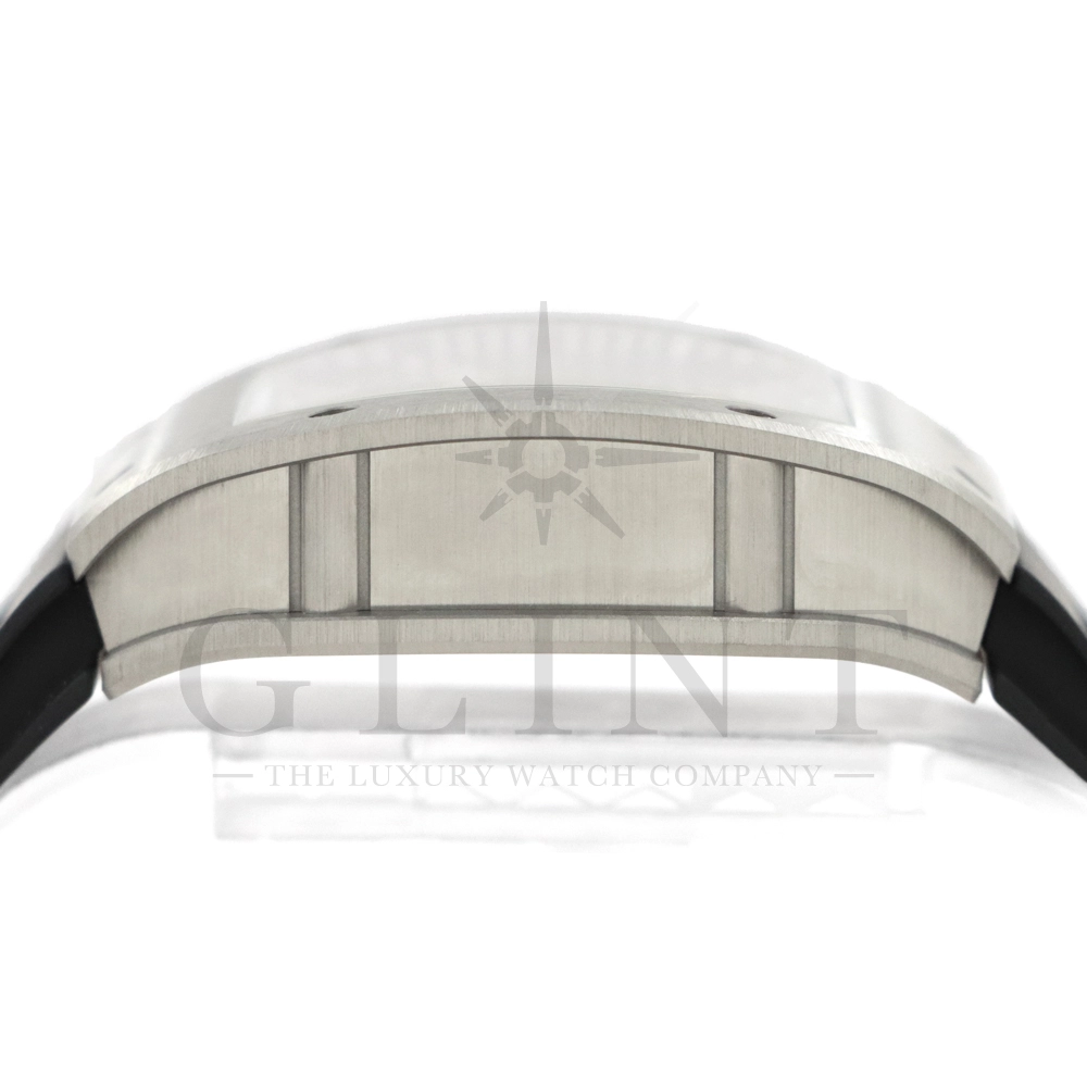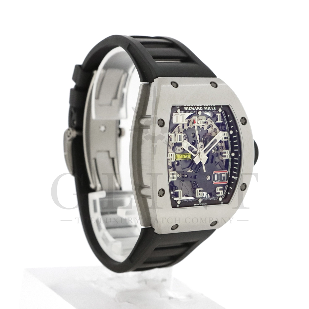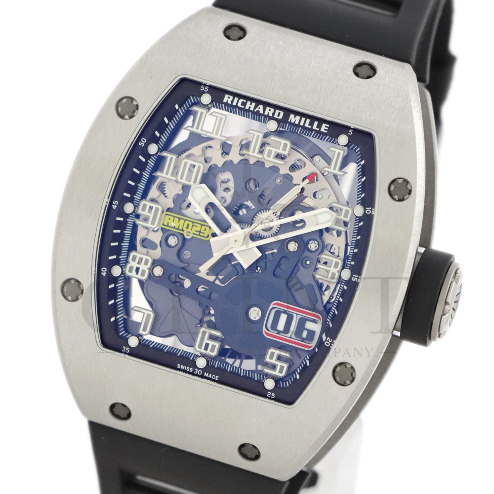 こちらはリシャールミル M029 Tiです。2011年に発表された本モデルは、同ブランドの自動巻きモデル「RM010」をベースに、実用性と視認性をさらに高めた進化系として誕生。4時位置に配置された2枚ディスクによるビッグデイト表示が特徴で、瞬時に日付を読み取ることが可能です。ケースには軽量かつ高強度なグレード5チタンを採用。トノー型ケース(約48.0mm × 39.7mm)は手首へのフィット感に優れ、見た目の存在感と装着性を両立しています。ムーブメントには自社開発の自動巻きキャリバーRMAS7を搭載し、約55時間のパワーリザーブを確保。さらに、着用者の動きに応じて巻き上げ効率を調整する可変慣性モーメントローターを備え、実用性と機械美を兼ね備えています。スケルトンダイヤルからは精緻なムーブメントの動きを楽しむことができ、リシャールミルならではの近未来的デザインと高度な技術力を体現した一本です。