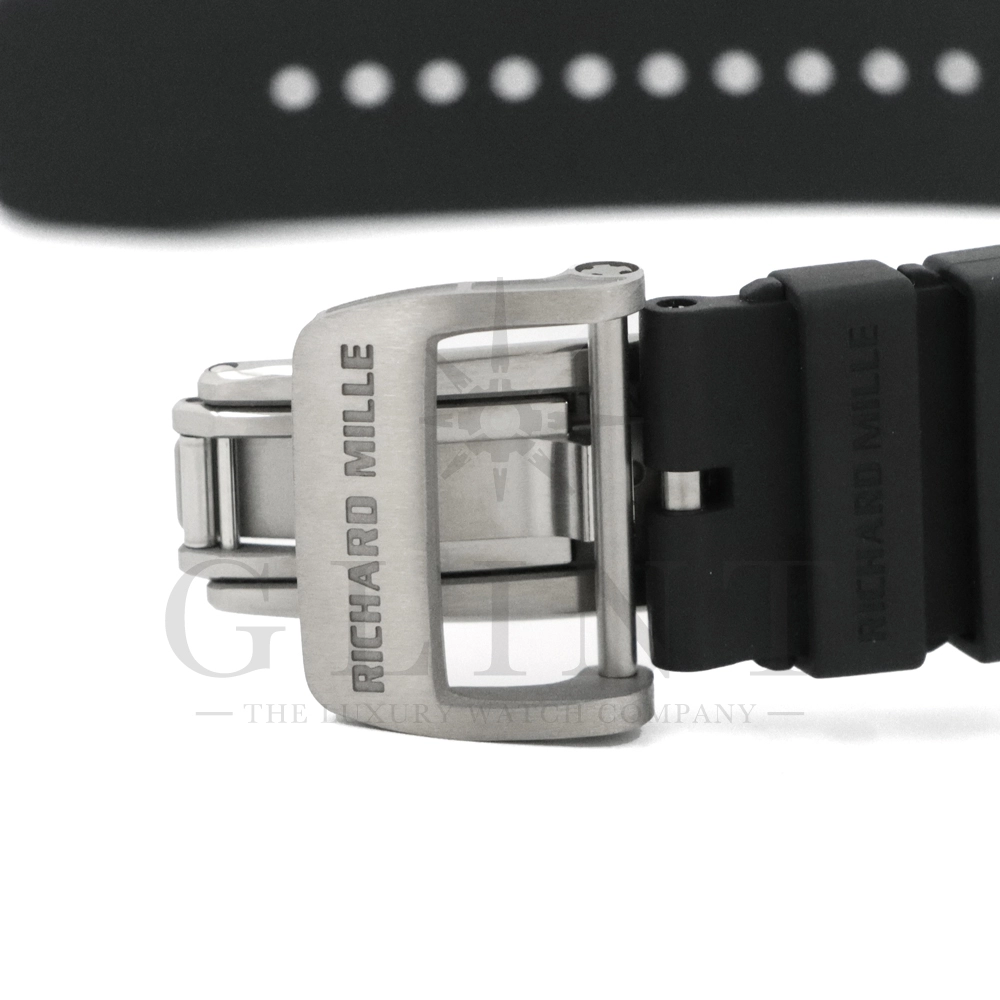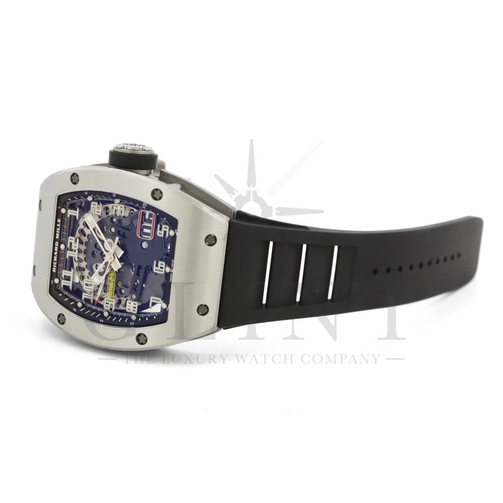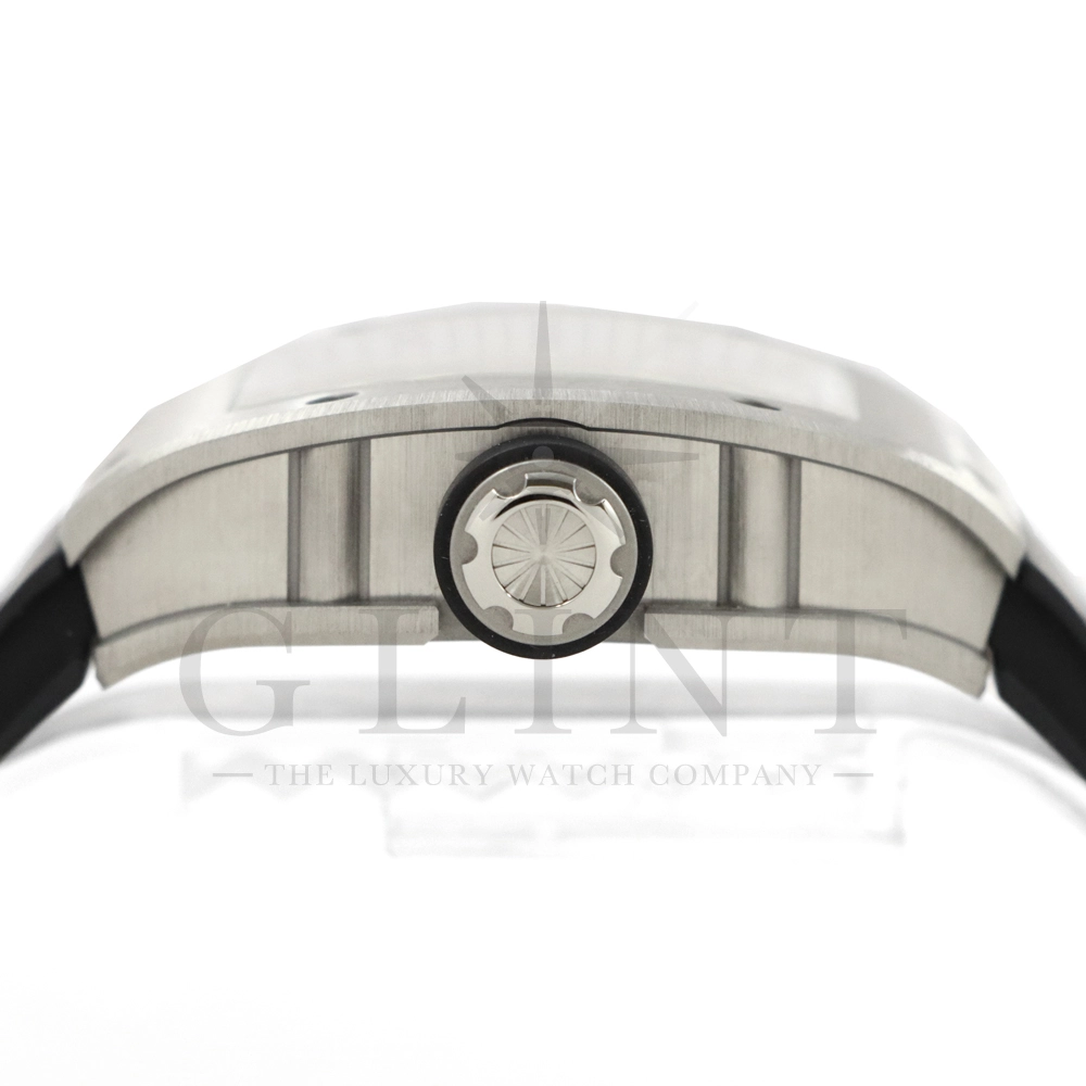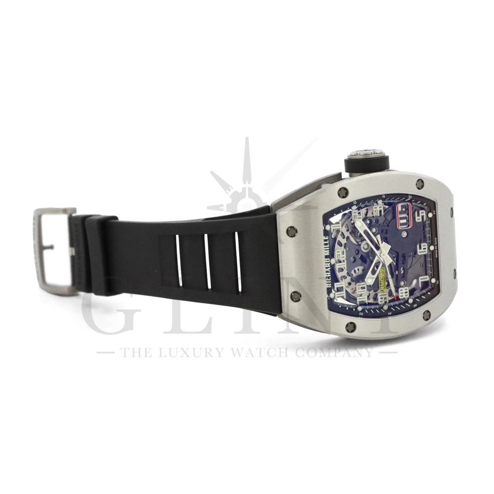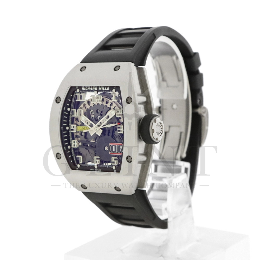 こちらはリシャールミル M029 Tiです。2011年に発表された本モデルは、同ブランドの自動巻きモデル「RM010」をベースに、実用性と視認性をさらに高めた進化系として誕生。4時位置に配置された2枚ディスクによるビッグデイト表示が特徴で、瞬時に日付を読み取ることが可能です。ケースには軽量かつ高強度なグレード5チタンを採用。トノー型ケース(約48.0mm × 39.7mm)は手首へのフィット感に優れ、見た目の存在感と装着性を両立しています。ムーブメントには自社開発の自動巻きキャリバーRMAS7を搭載し、約55時間のパワーリザーブを確保。さらに、着用者の動きに応じて巻き上げ効率を調整する可変慣性モーメントローターを備え、実用性と機械美を兼ね備えています。スケルトンダイヤルからは精緻なムーブメントの動きを楽しむことができ、リシャールミルならではの近未来的デザインと高度な技術力を体現した一本です。