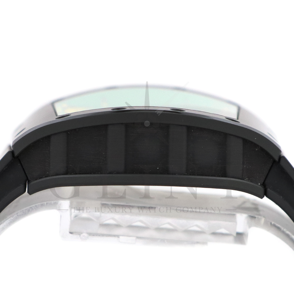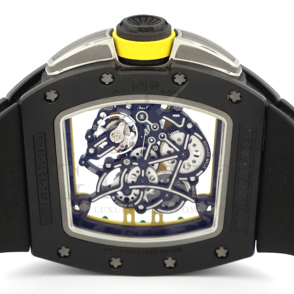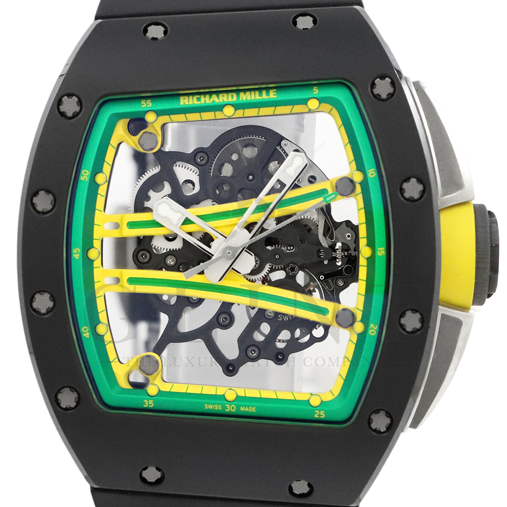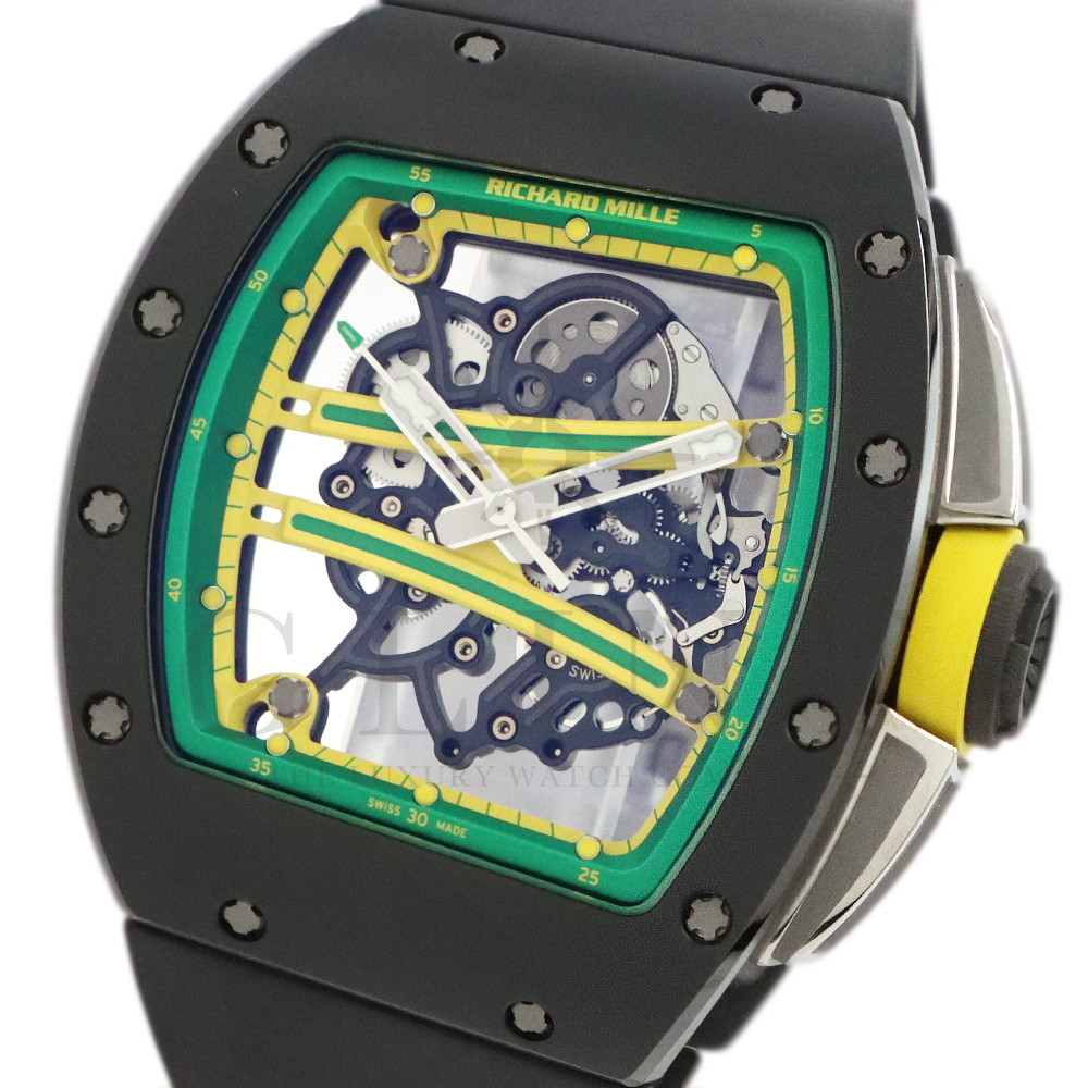 リシャール・ミルの「RM61-01」は、100mと200m短距離走において世界第2位の記録を持つオリンピックメダリスト、ヨハン・ブレイクのためにデザインされた「RM 59-01 トゥールビヨン」を原型にしたモデル。PVD処理とタイタリット処理を施し、高度にスケルトン化されたグレード5チタン製ムーブメントを備えるキャリバー RMUL2を搭載。ブリッジにはジャマイカ国旗のカラーがあしらわれています。アシンメトリーのケースにより、スポーツ時にリューズが手首に擦れることもなく、大きなリューズプロテクターでリューズを完全に保護。大変人気の高いモデルです。