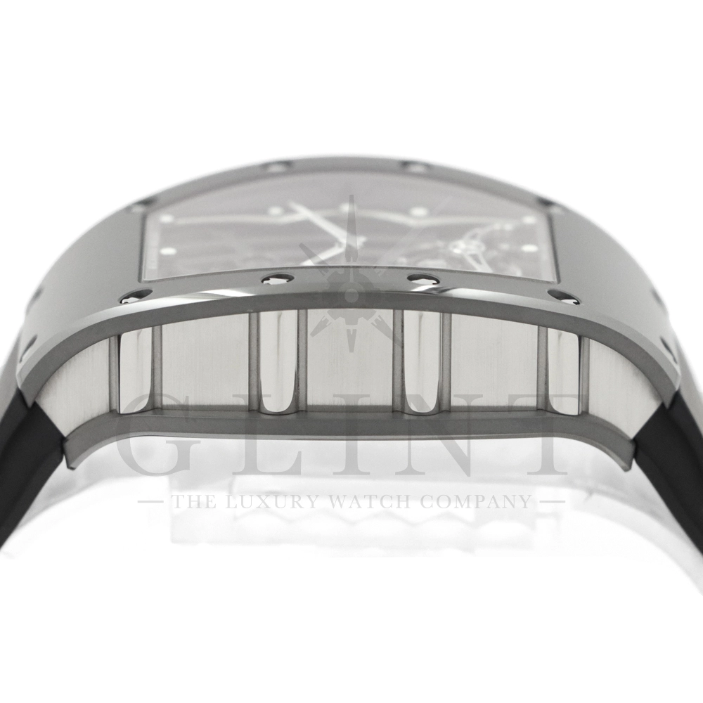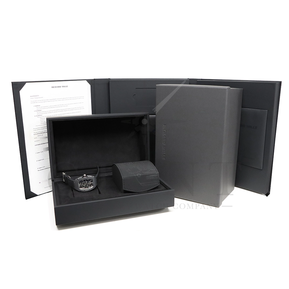こちらはリシャールミル RM 74-01 オートマティック トゥールビヨンです。素材に使用されているグレーサーメットは、優れた耐腐食性と耐傷性を有した素材です。チタンの軽量性とセラミックスの硬度を兼ね備えたグレーサーメットは、ジルコニウムの金属マトリックスと高性能セラミックスを組み合わせたもの。ダイヤモンドに匹敵する硬度を誇る素材で、独特のグレーの色合いを実現しました。一方、ミドルケース、ブリッジ、および地板はグレード5チタン製で、ケースのデザインと見事に調和しています。搭載する自社開発CRMT6 キャリバーは、地板とブリッジの素材にはPVD 加工とエレクトロプラズマ処理を施したグレード5チタンが採用。フリースプラングテンプを用いたトゥールビヨンレギュレーターが時を刻むこれらのタイムピースでは、高速巻き上げ式の香箱から絶えず得られる動力がインボリュート歯形の歯車によって供給されることで、50時間にわたって時計機構の優雅な動きが実演されます。可変慣性モーメントローターは、着用者のライフスタイルに合わせて時計に対する巻き上げ効率を調整してくれるでしょう。特徴的なスレンダーなラインは、6時位置に配されたトゥールビヨンの壮麗な姿を美しく引き立て、面取りされた縁取りに特別な仕上げが施されたインナーベゼルがムーブメントを際立たせており、エレガンスと究極の時計製造技術が融合された究極の一本と言えるでしょう。