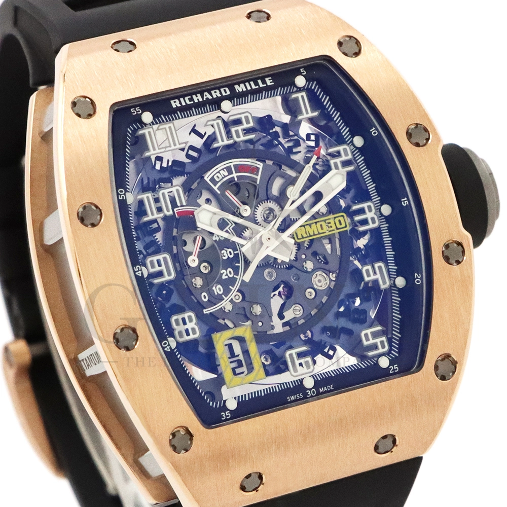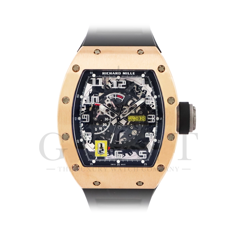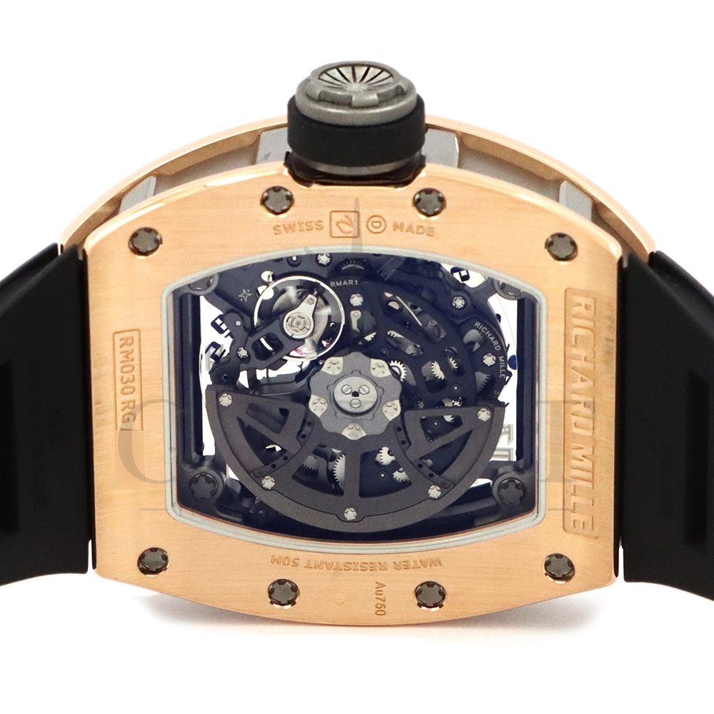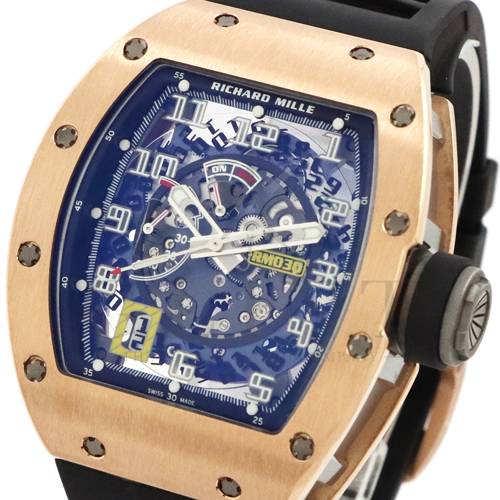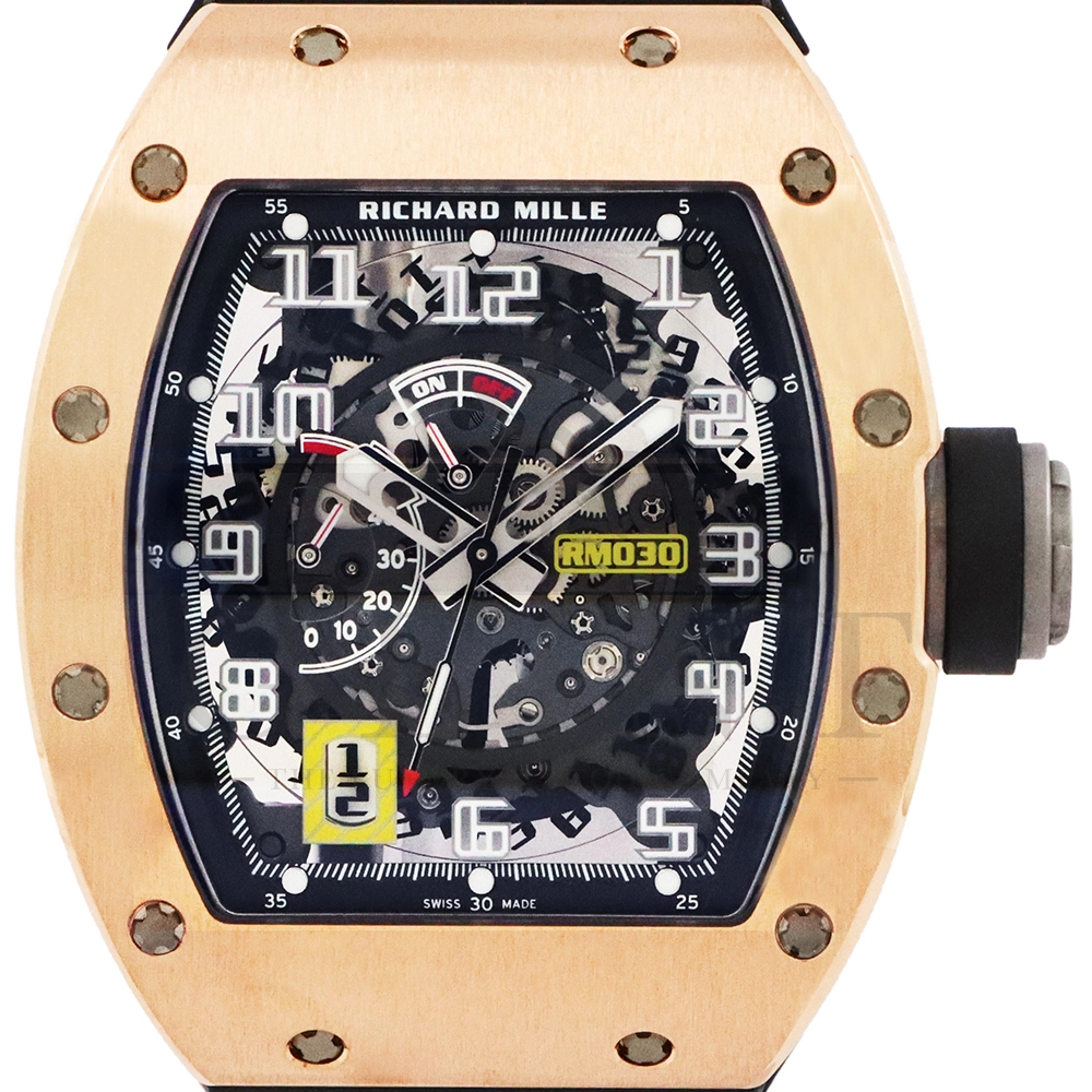 こちらはリシャールミル RM030 18Kレッドゴールドモデルです。腕時計の自動巻き機構は、従来メインスプリングが完全に巻き上げられると、香箱の中でスプリングがスリップすることで巻き上げ過ぎを防止しますが、リシャール・ミルは香箱とスプリングの摩擦で生じる微細な残屑が精度に悪影響を及ぼすことに着目し、それを排除する新機構を開発。それが4年の歳月を費やして完成させた「デクラッチャブル・ローター」と呼ばれる機構で、パワーリザーブが50時間以上になるとローターと香箱の連結を切り、巻き上げを完全に停止。そしてパワーリザーブが40時間を切ると自動的にクラッチが連結され巻き上げを再開。これによりメインスプリングの放出トルクを一定に保ち、精度を確保し、残屑も発生しません。巻き上げのオン・オフは、12時位置のインジケーターで確認可能。さらに、これまでにリシャール・ミルが開発した、使用者の運動量に合わせて巻き上げ効率を調整できる「可変慣性モーメント・ローター」やリューズによる巻き上げ過ぎを防ぐ「トルク制限リューズ」などとのコンビネーションで、最適なトルクを実現し、高精度化を実現しております。リシャールミルのこだわりが感じられる至極の一本です。