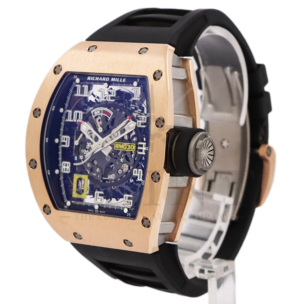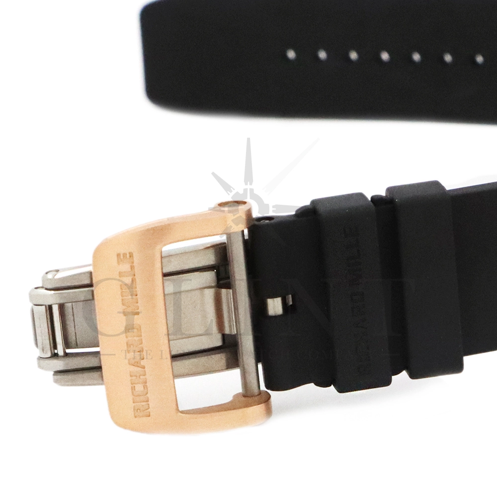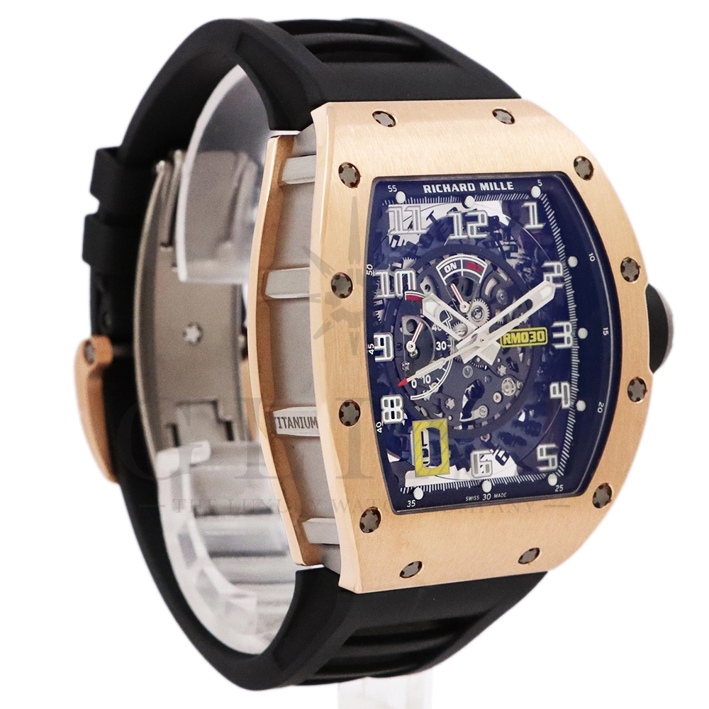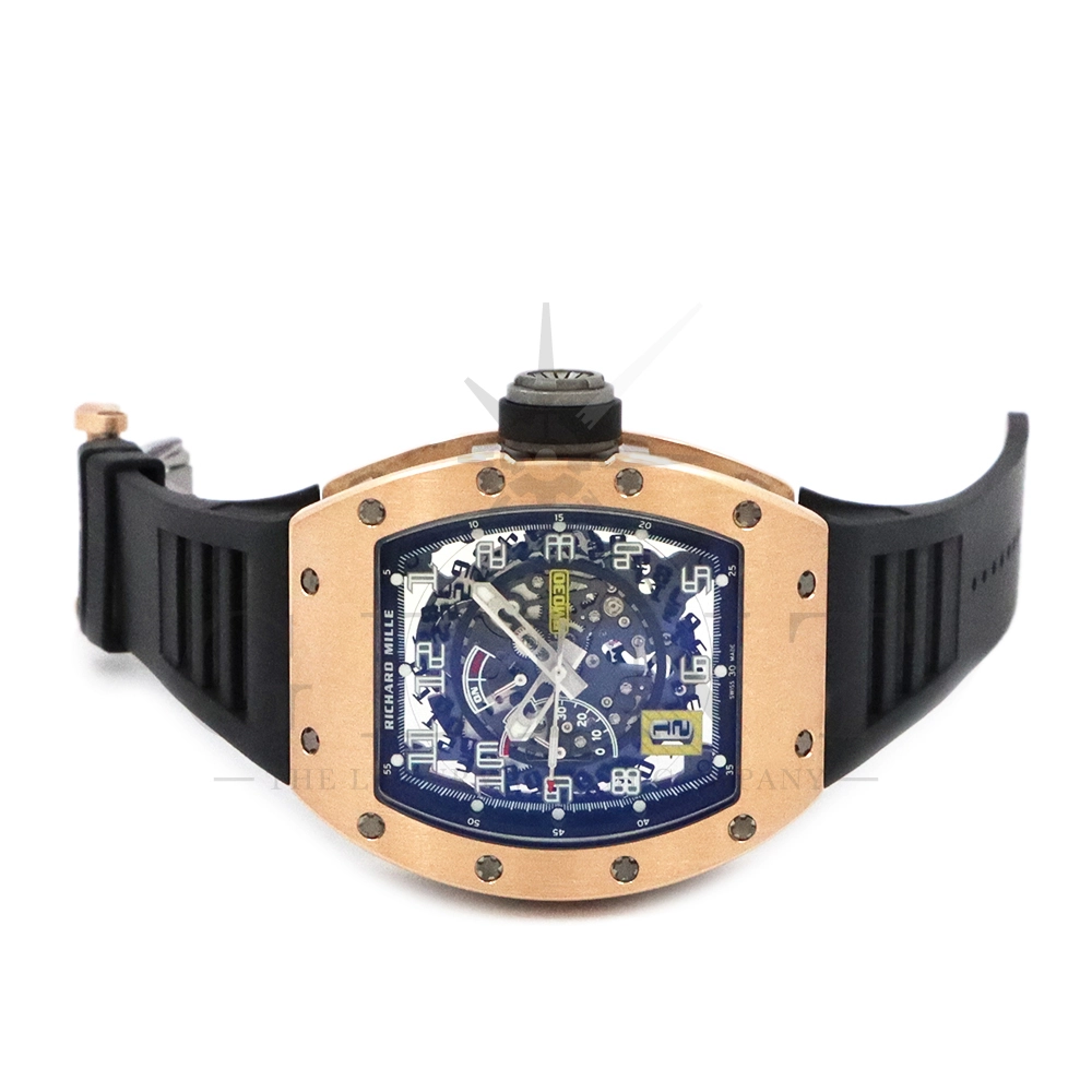 こちらはリシャールミル RM030 18Kレッドゴールドモデルです。腕時計の自動巻き機構は、従来メインスプリングが完全に巻き上げられると、香箱の中でスプリングがスリップすることで巻き上げ過ぎを防止しますが、リシャール・ミルは香箱とスプリングの摩擦で生じる微細な残屑が精度に悪影響を及ぼすことに着目し、それを排除する新機構を開発。それが4年の歳月を費やして完成させた「デクラッチャブル・ローター」と呼ばれる機構で、パワーリザーブが50時間以上になるとローターと香箱の連結を切り、巻き上げを完全に停止。そしてパワーリザーブが40時間を切ると自動的にクラッチが連結され巻き上げを再開。これによりメインスプリングの放出トルクを一定に保ち、精度を確保し、残屑も発生しません。巻き上げのオン・オフは、12時位置のインジケーターで確認可能。さらに、これまでにリシャール・ミルが開発した、使用者の運動量に合わせて巻き上げ効率を調整できる「可変慣性モーメント・ローター」やリューズによる巻き上げ過ぎを防ぐ「トルク制限リューズ」などとのコンビネーションで、最適なトルクを実現し、高精度化を実現しております。リシャールミルのこだわりが感じられる至極の一本です。