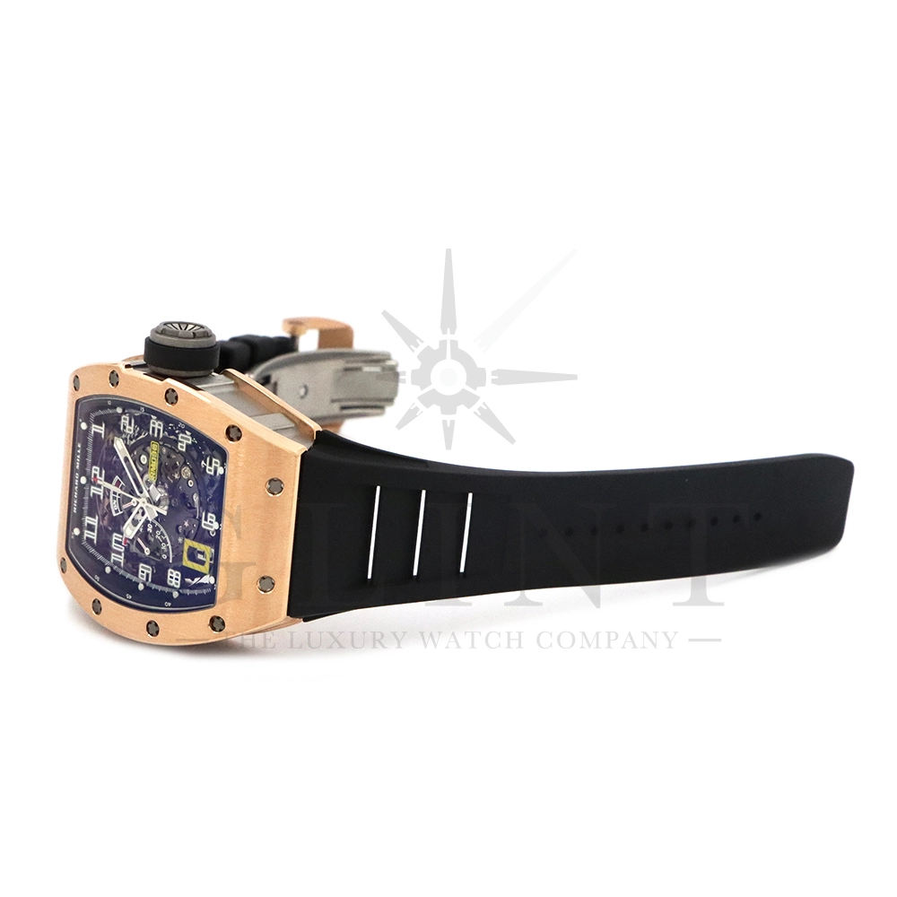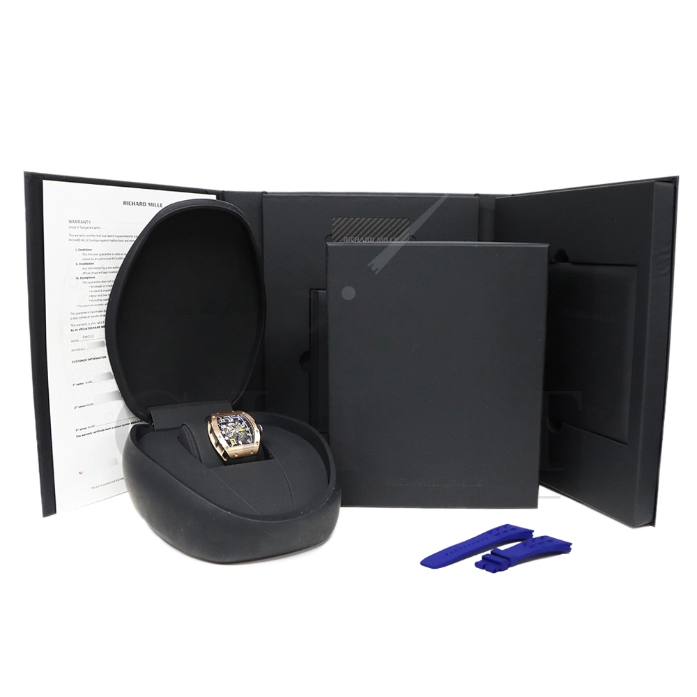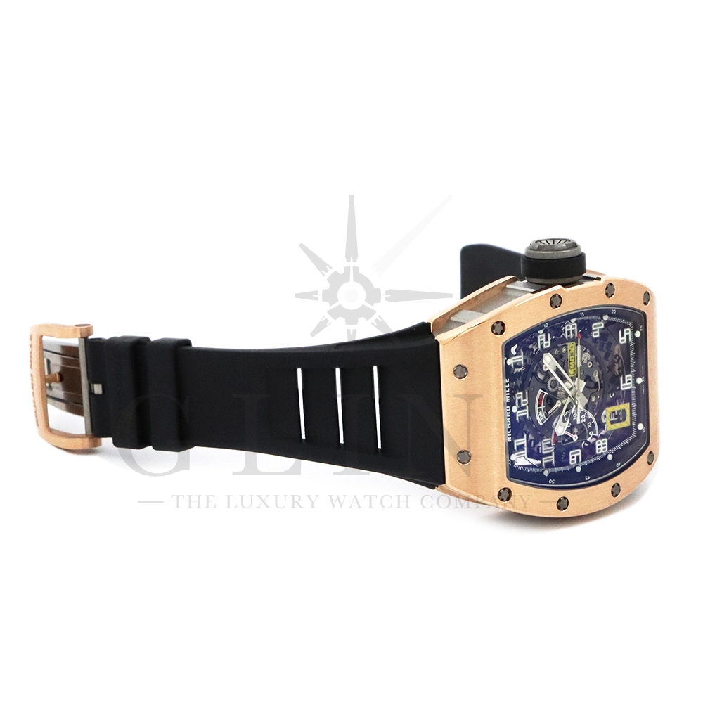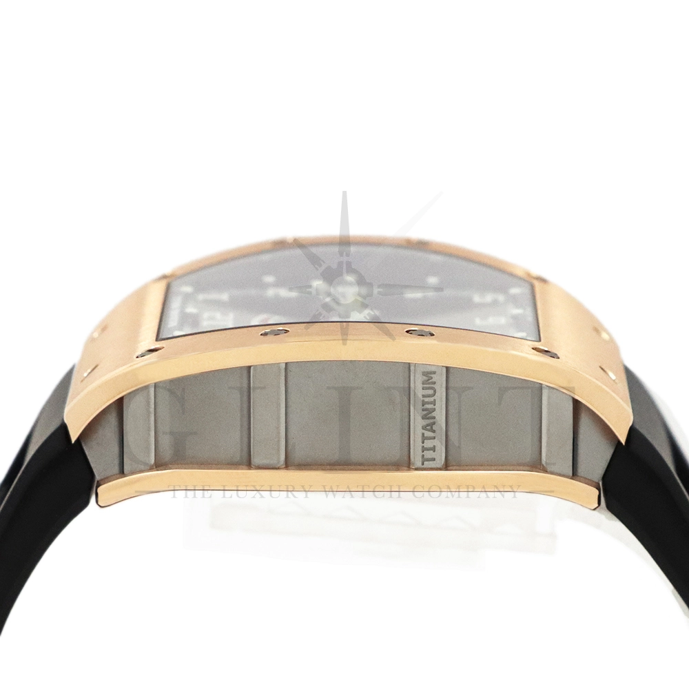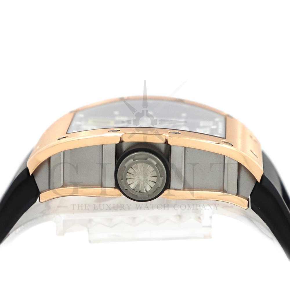 こちらはリシャールミル RM030 18Kレッドゴールドモデルです。腕時計の自動巻き機構は、従来メインスプリングが完全に巻き上げられると、香箱の中でスプリングがスリップすることで巻き上げ過ぎを防止しますが、リシャール・ミルは香箱とスプリングの摩擦で生じる微細な残屑が精度に悪影響を及ぼすことに着目し、それを排除する新機構を開発。それが4年の歳月を費やして完成させた「デクラッチャブル・ローター」と呼ばれる機構で、パワーリザーブが50時間以上になるとローターと香箱の連結を切り、巻き上げを完全に停止。そしてパワーリザーブが40時間を切ると自動的にクラッチが連結され巻き上げを再開。これによりメインスプリングの放出トルクを一定に保ち、精度を確保し、残屑も発生しません。巻き上げのオン・オフは、12時位置のインジケーターで確認可能。さらに、これまでにリシャール・ミルが開発した、使用者の運動量に合わせて巻き上げ効率を調整できる「可変慣性モーメント・ローター」やリューズによる巻き上げ過ぎを防ぐ「トルク制限リューズ」などとのコンビネーションで、最適なトルクを実現し、高精度化を実現しております。リシャールミルのこだわりが感じられる至極の一本です。