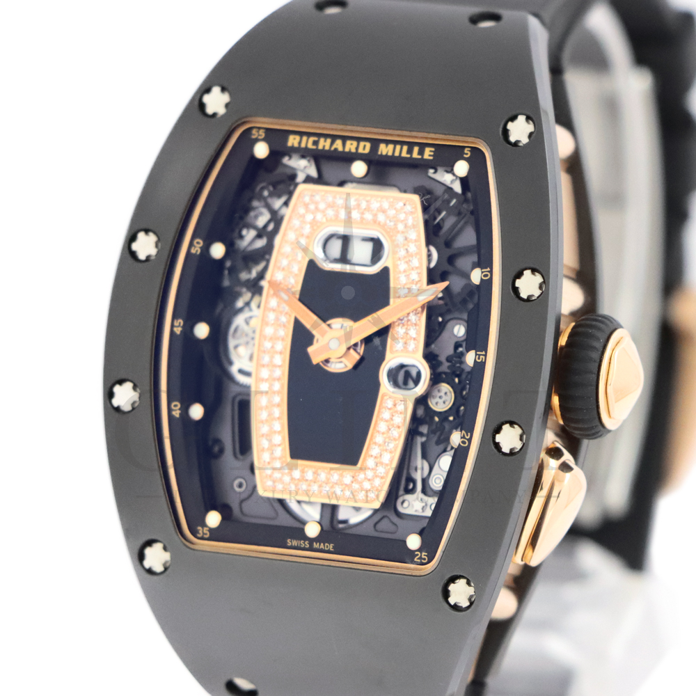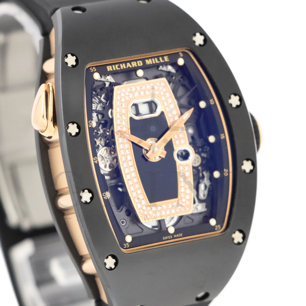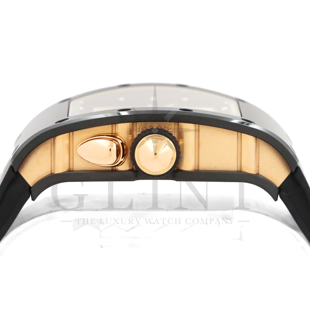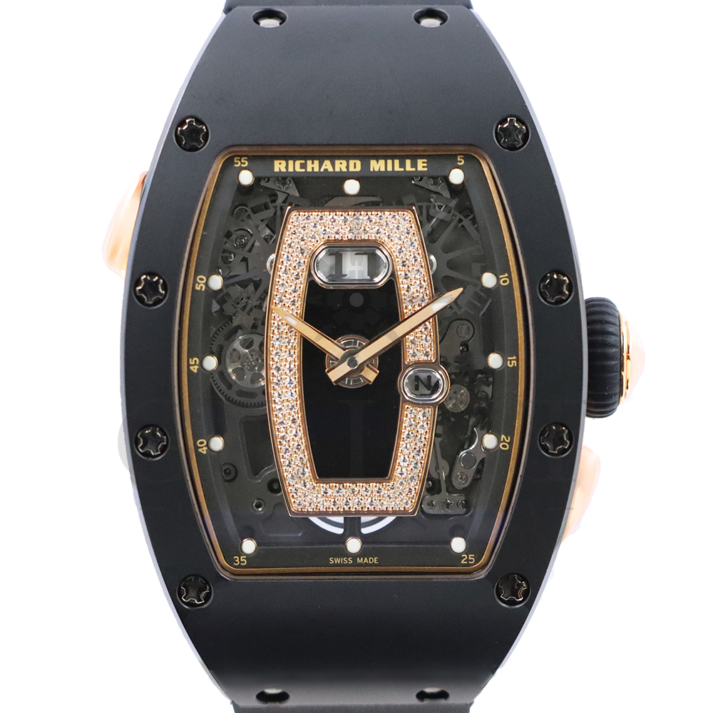 こちらはRM037 RG-TZPです。素材にブラックセラミックと18Kレッドゴールドを組み合わせたこちらのモデルは文字盤にオニキスとダイヤモンドがあしらわれた非常にエレガントなユニセックスウォッチ。特許を取得した巻き芯・リューズ機構はムーブメントの心臓部にまで伸びる従来のリューズ用アタッチメントを使用していないため、ムーブメントを完全な状態に保ち、外部の影響からメカニズムを守ります。ファンクションセレクターは、 プッシュボタンを押すと、巻き上げ、ニュートラル、時刻設定のいずれかの機能を選択できます。 W(巻き上げ)-N(ニュートラル)-H(時刻設定)を針によって表示。この特殊なギアシステムにより、リューズにかかる力が最小限に抑えられ、リューズの機能がムーブメントに影響を及ぼす可能性がなくなりました。日付は12時位置の窓に横長に設置され、スケルトン仕様の2枚のカレンダーディスクによって白地の背景に日付を表示。日付が変わる際は、ほぼ瞬間的に切り替わります。リシャールミル初の自社製ムーブメント Cal.CRMA1はパワーリザーブ約50時間を誇り、所有者の腕元の動きに合わせて事前にローターの振り具合を調整できる可変慣性モーメントローターを装備。ユニセックスモデルとして、どんなシチュエーションにもマッチする洗練された美しさと快適な着け心地のモデルです。