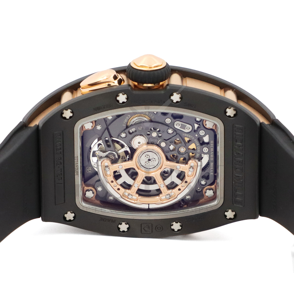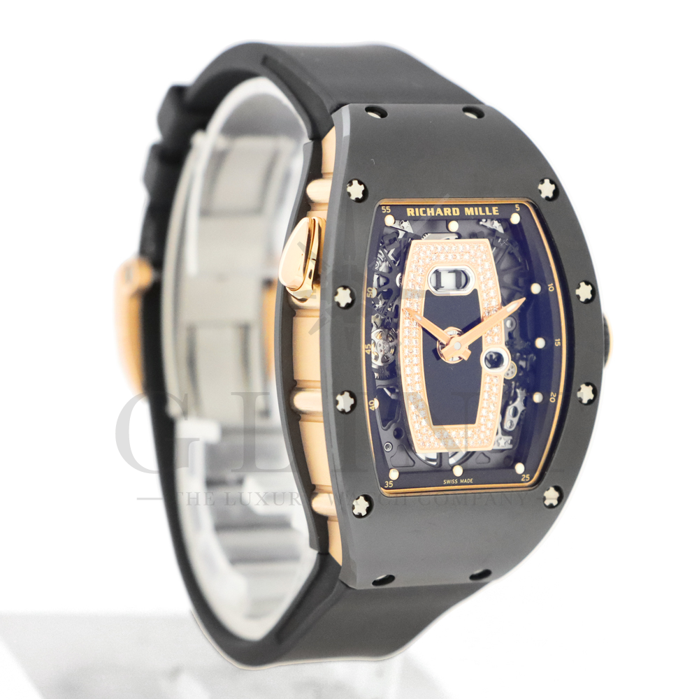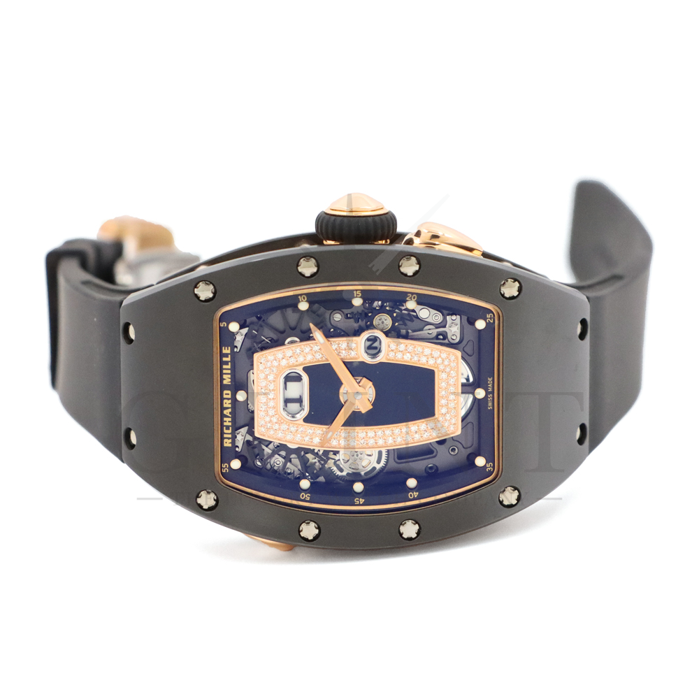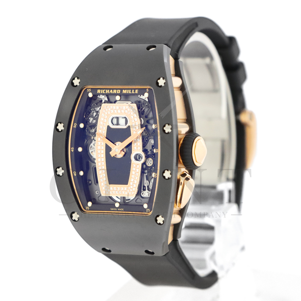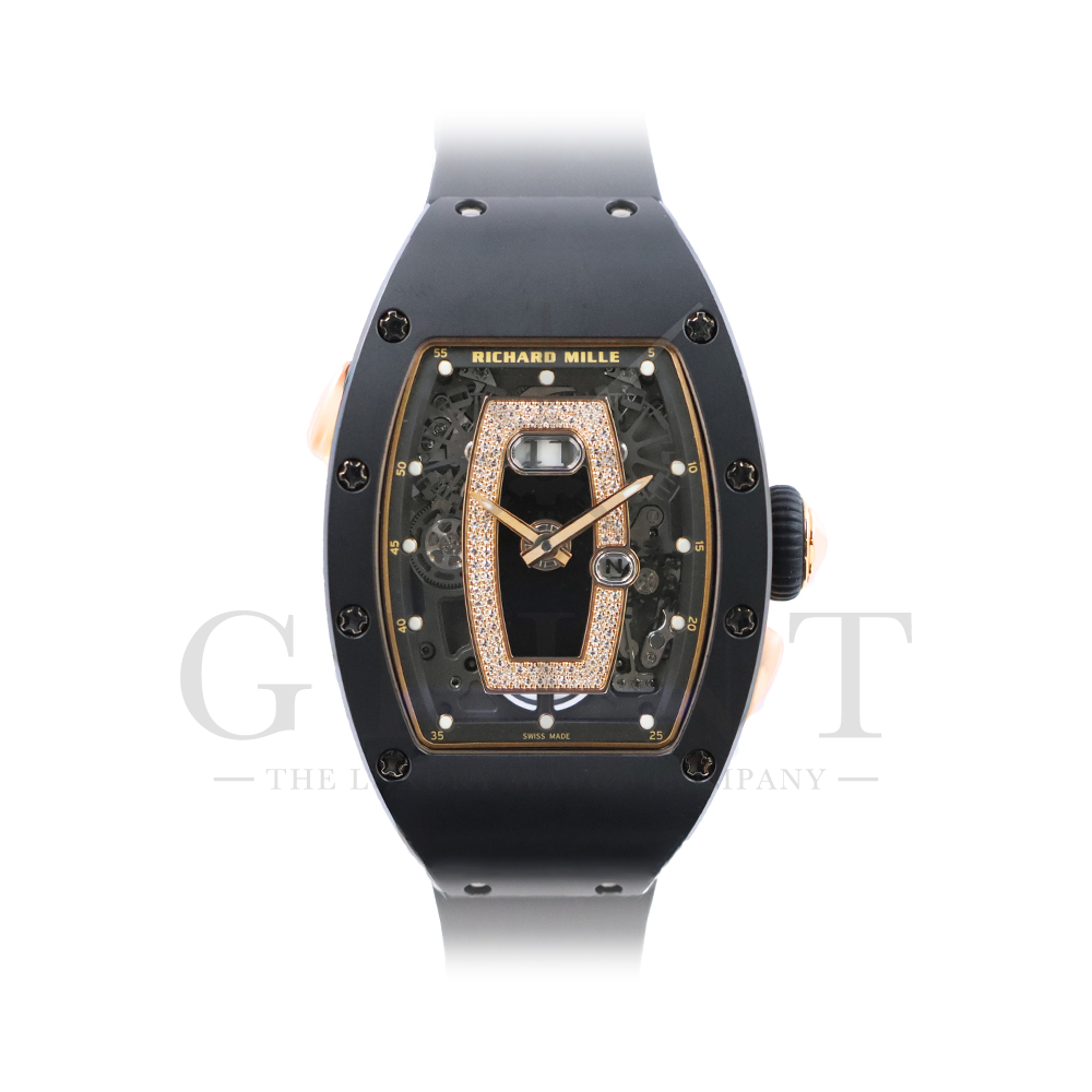 こちらはRM037 RG-TZPです。素材にブラックセラミックと18Kレッドゴールドを組み合わせたこちらのモデルは文字盤にオニキスとダイヤモンドがあしらわれた非常にエレガントなユニセックスウォッチ。特許を取得した巻き芯・リューズ機構はムーブメントの心臓部にまで伸びる従来のリューズ用アタッチメントを使用していないため、ムーブメントを完全な状態に保ち、外部の影響からメカニズムを守ります。ファンクションセレクターは、 プッシュボタンを押すと、巻き上げ、ニュートラル、時刻設定のいずれかの機能を選択できます。 W(巻き上げ)-N(ニュートラル)-H(時刻設定)を針によって表示。この特殊なギアシステムにより、リューズにかかる力が最小限に抑えられ、リューズの機能がムーブメントに影響を及ぼす可能性がなくなりました。日付は12時位置の窓に横長に設置され、スケルトン仕様の2枚のカレンダーディスクによって白地の背景に日付を表示。日付が変わる際は、ほぼ瞬間的に切り替わります。リシャールミル初の自社製ムーブメント Cal.CRMA1はパワーリザーブ約50時間を誇り、所有者の腕元の動きに合わせて事前にローターの振り具合を調整できる可変慣性モーメントローターを装備。ユニセックスモデルとして、どんなシチュエーションにもマッチする洗練された美しさと快適な着け心地のモデルです。