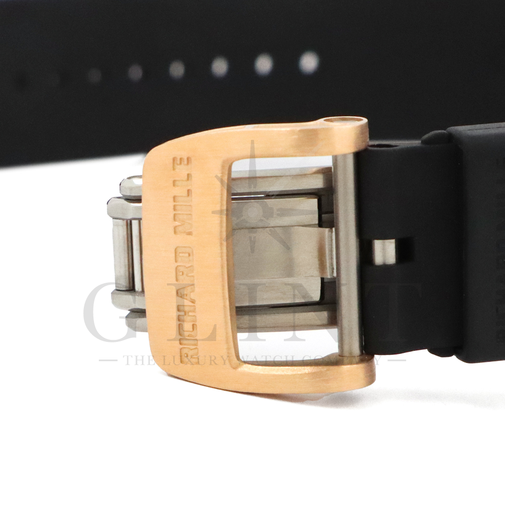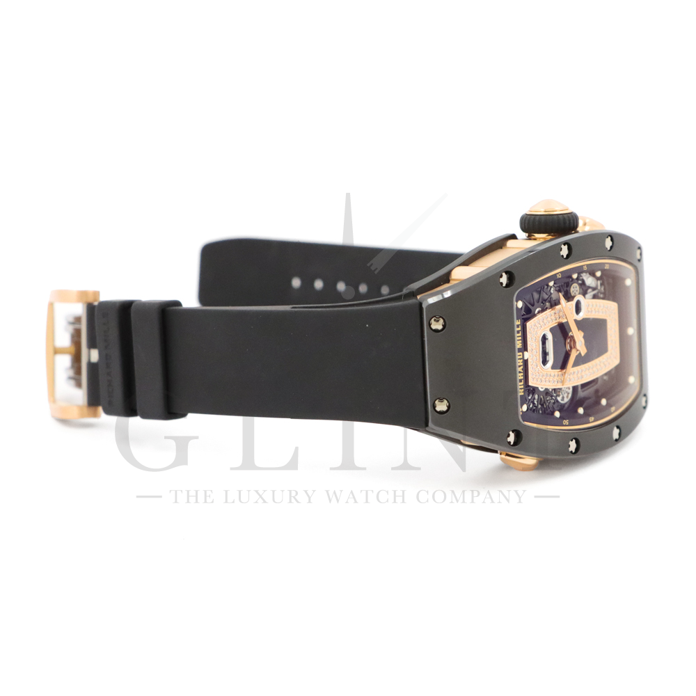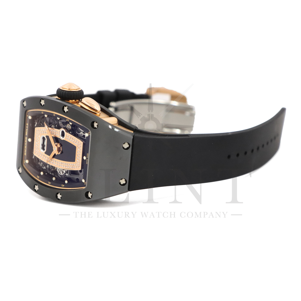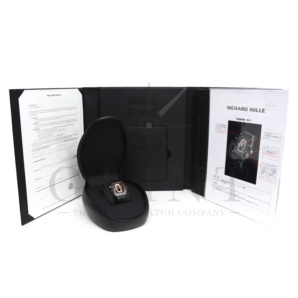 こちらはRM037 RG-TZPです。素材にブラックセラミックと18Kレッドゴールドを組み合わせたこちらのモデルは文字盤にオニキスとダイヤモンドがあしらわれた非常にエレガントなユニセックスウォッチ。特許を取得した巻き芯・リューズ機構はムーブメントの心臓部にまで伸びる従来のリューズ用アタッチメントを使用していないため、ムーブメントを完全な状態に保ち、外部の影響からメカニズムを守ります。ファンクションセレクターは、 プッシュボタンを押すと、巻き上げ、ニュートラル、時刻設定のいずれかの機能を選択できます。 W(巻き上げ)-N(ニュートラル)-H(時刻設定)を針によって表示。この特殊なギアシステムにより、リューズにかかる力が最小限に抑えられ、リューズの機能がムーブメントに影響を及ぼす可能性がなくなりました。日付は12時位置の窓に横長に設置され、スケルトン仕様の2枚のカレンダーディスクによって白地の背景に日付を表示。日付が変わる際は、ほぼ瞬間的に切り替わります。リシャールミル初の自社製ムーブメント Cal.CRMA1はパワーリザーブ約50時間を誇り、所有者の腕元の動きに合わせて事前にローターの振り具合を調整できる可変慣性モーメントローターを装備。ユニセックスモデルとして、どんなシチュエーションにもマッチする洗練された美しさと快適な着け心地のモデルです。