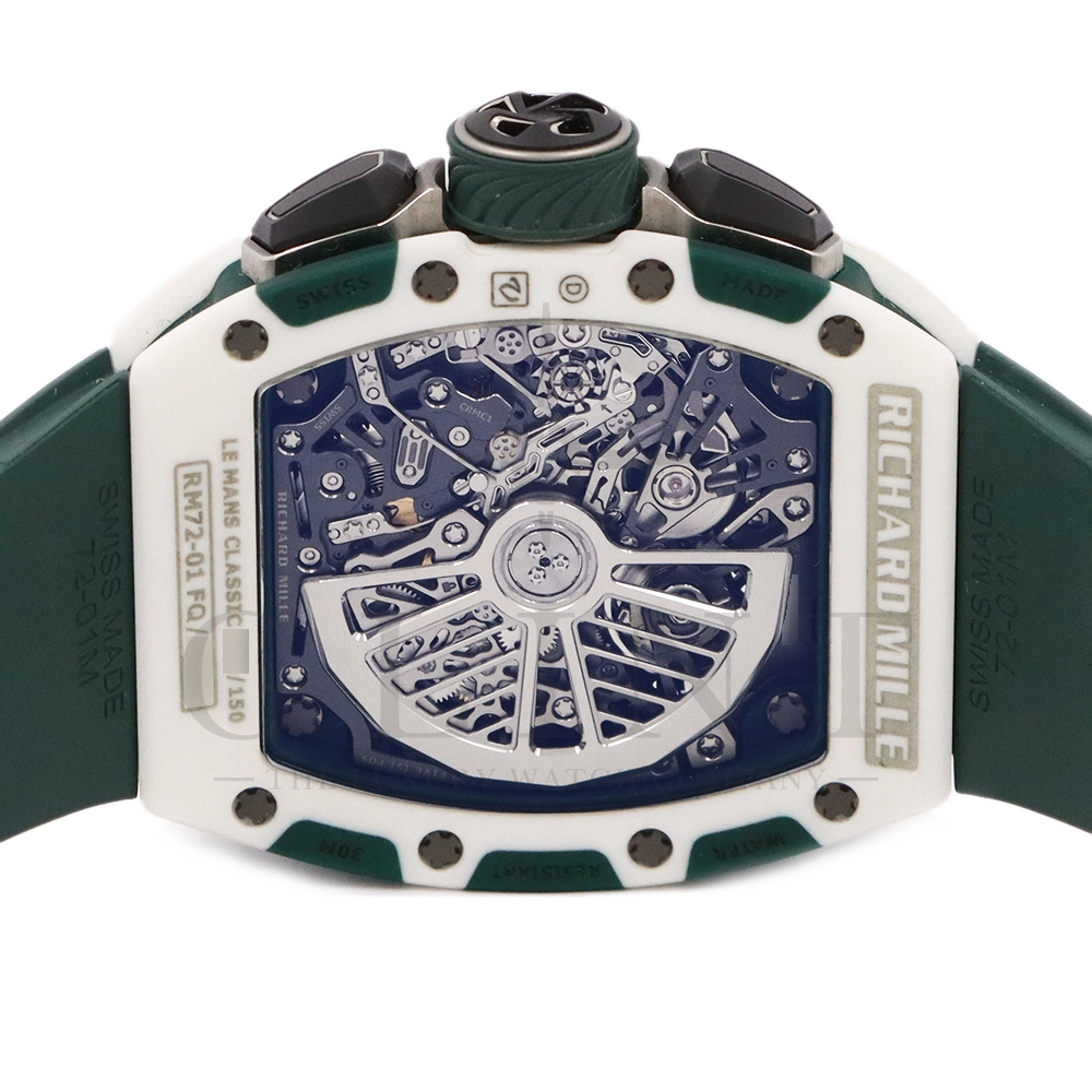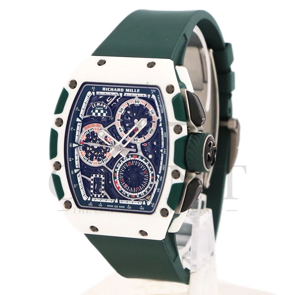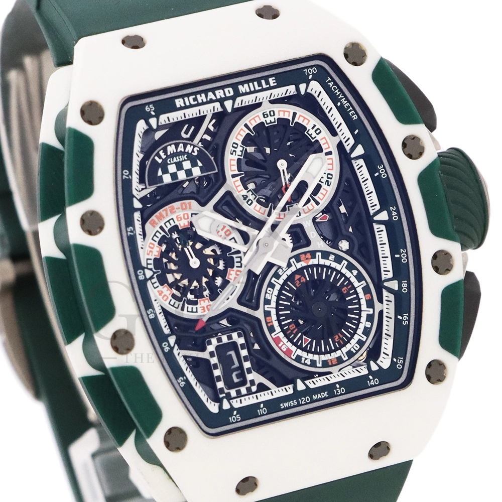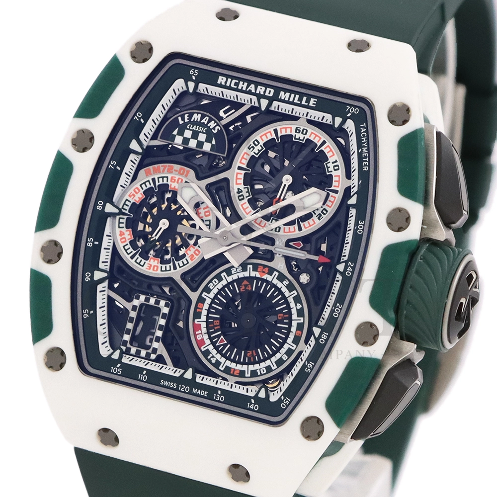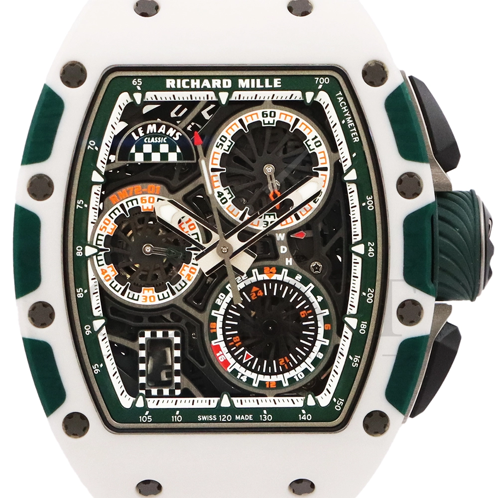 こちらはRM72-01 ル・マン クラシック 世界限定150本です。リシャールミルがフランスの伝統的耐久レース「ル・マン・クラシック」に捧げた特別限定モデル。ブランドのスポーツスピリットと、ル・マンに息づくモータースポーツの栄光を象徴する一本です。ケースはグリーンとホワイトのクォーツTPTによる2層構造で、レースの象徴カラーを鮮やかに表現。自社製自動巻きフライバッククロノグラフムーブメント Cal.CRMC1 を搭載し、シングルバレルながらも高いトルク伝達効率と60時間のパワーリザーブを実現しています。また、時・分・秒・クロノグラフ・デイトを巧みに配置したダイアルは、リシャール・ミルならではの立体構造と視認性を兼備。6時位置にはル・マンを象徴する「16」の数字が赤く刻まれ、24時間耐久レースへのオマージュを表現しています。技術美とスピードのロマンを凝縮した、リシャール・ミルらしい究極のタイムピースです。