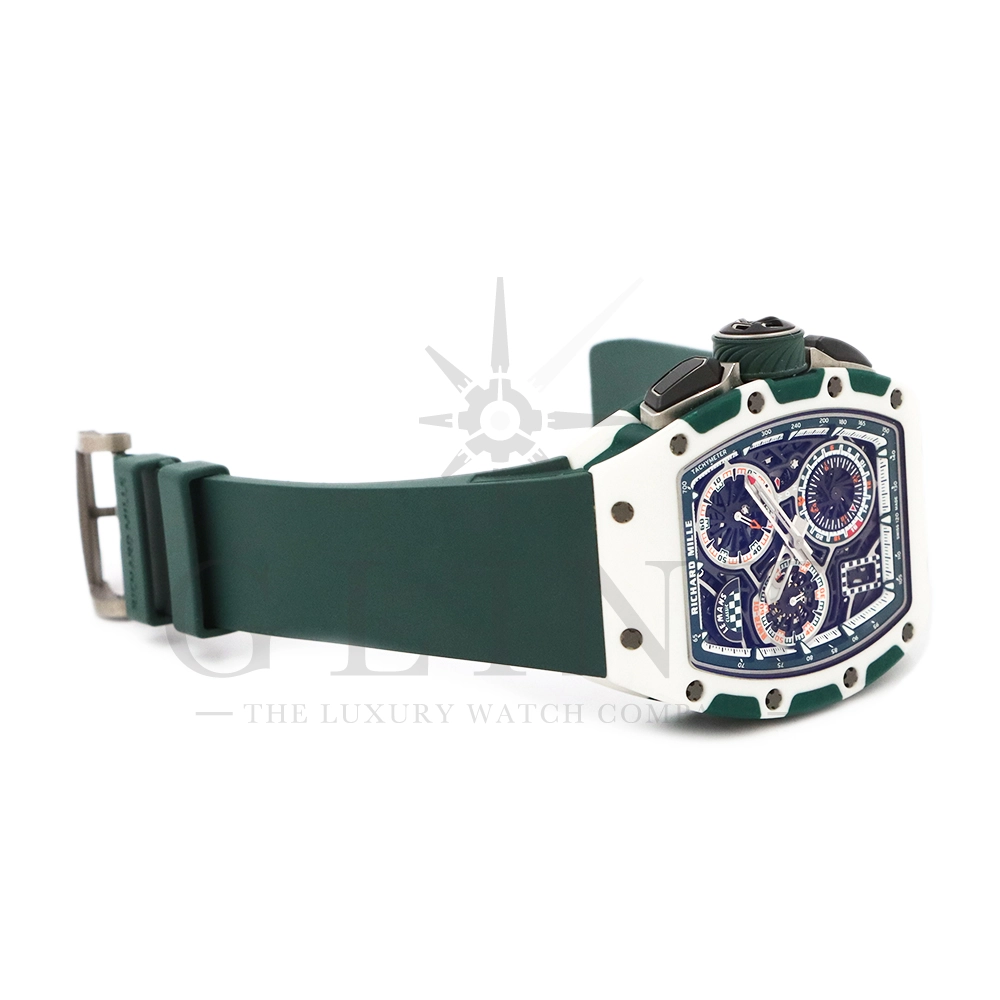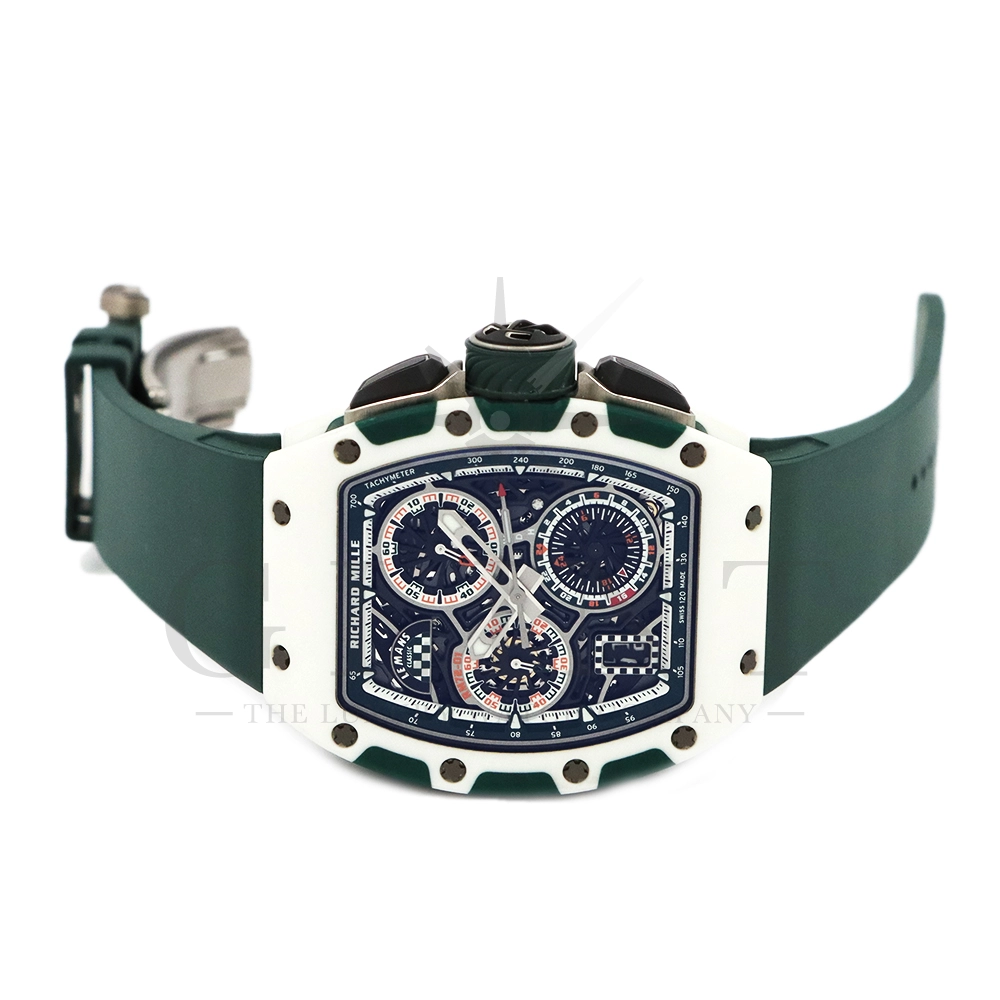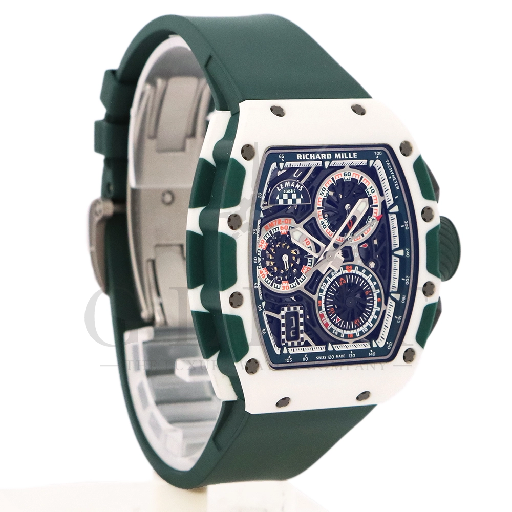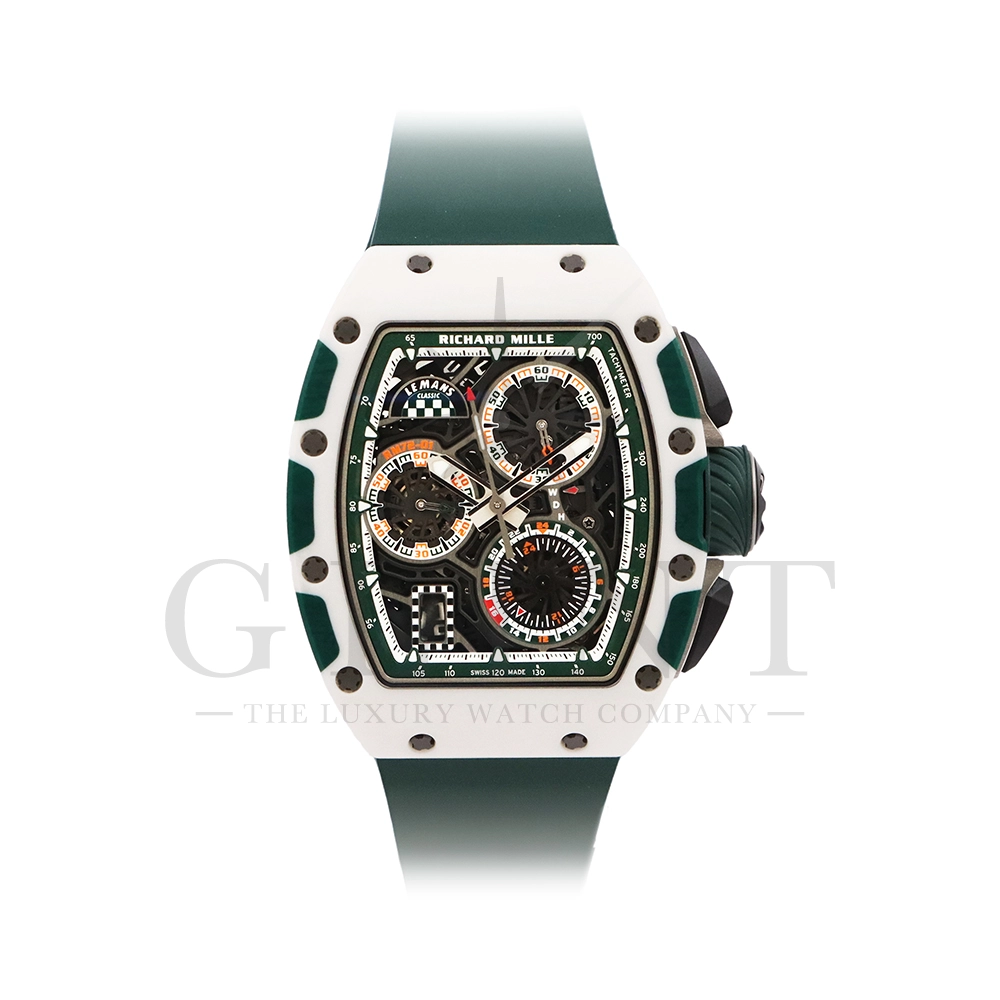 こちらはRM72-01 ル・マン クラシック 世界限定150本です。リシャールミルがフランスの伝統的耐久レース「ル・マン・クラシック」に捧げた特別限定モデル。ブランドのスポーツスピリットと、ル・マンに息づくモータースポーツの栄光を象徴する一本です。ケースはグリーンとホワイトのクォーツTPTによる2層構造で、レースの象徴カラーを鮮やかに表現。自社製自動巻きフライバッククロノグラフムーブメント Cal.CRMC1 を搭載し、シングルバレルながらも高いトルク伝達効率と60時間のパワーリザーブを実現しています。また、時・分・秒・クロノグラフ・デイトを巧みに配置したダイアルは、リシャール・ミルならではの立体構造と視認性を兼備。6時位置にはル・マンを象徴する「16」の数字が赤く刻まれ、24時間耐久レースへのオマージュを表現しています。技術美とスピードのロマンを凝縮した、リシャール・ミルらしい究極のタイムピースです。