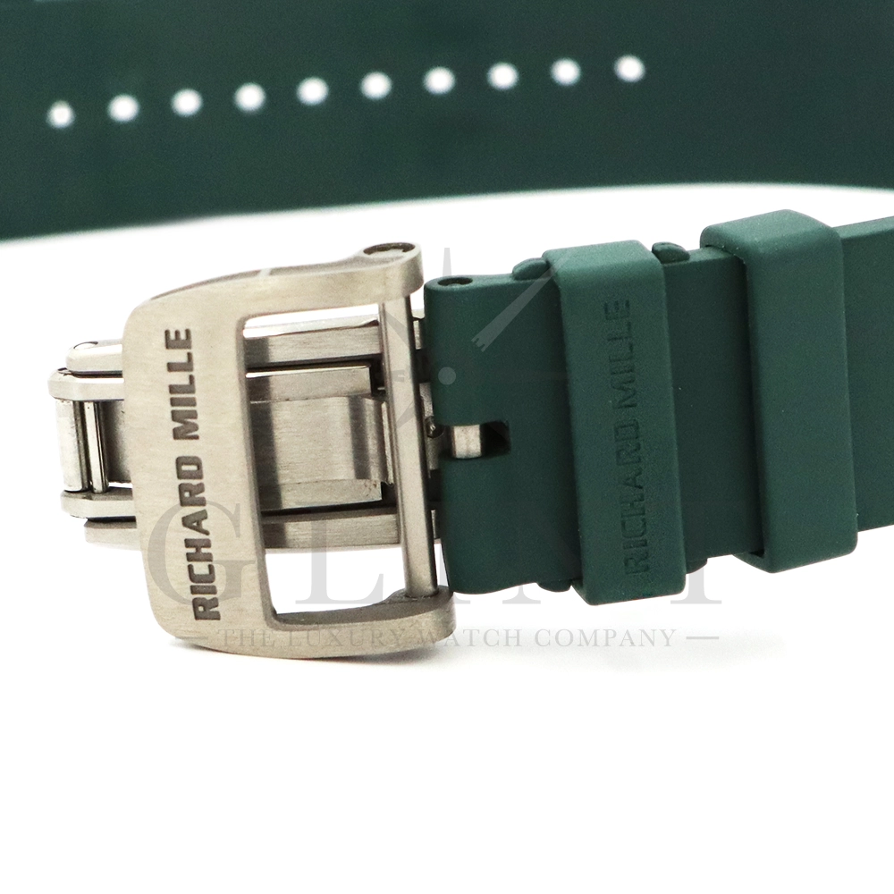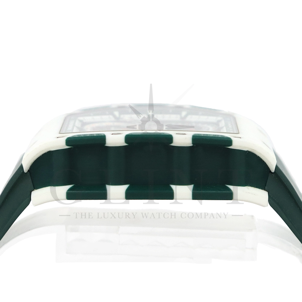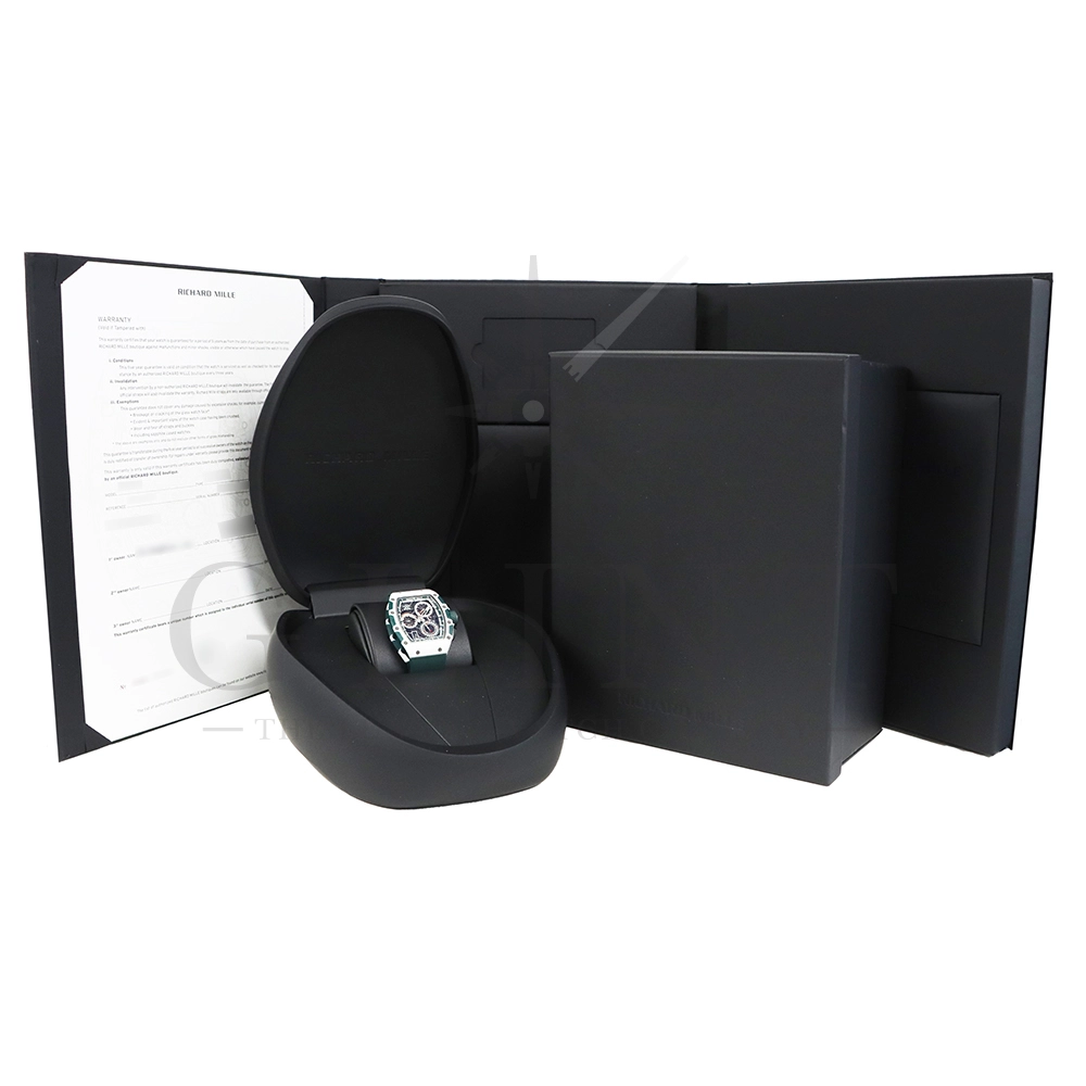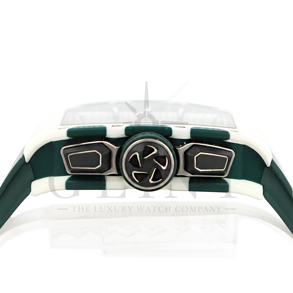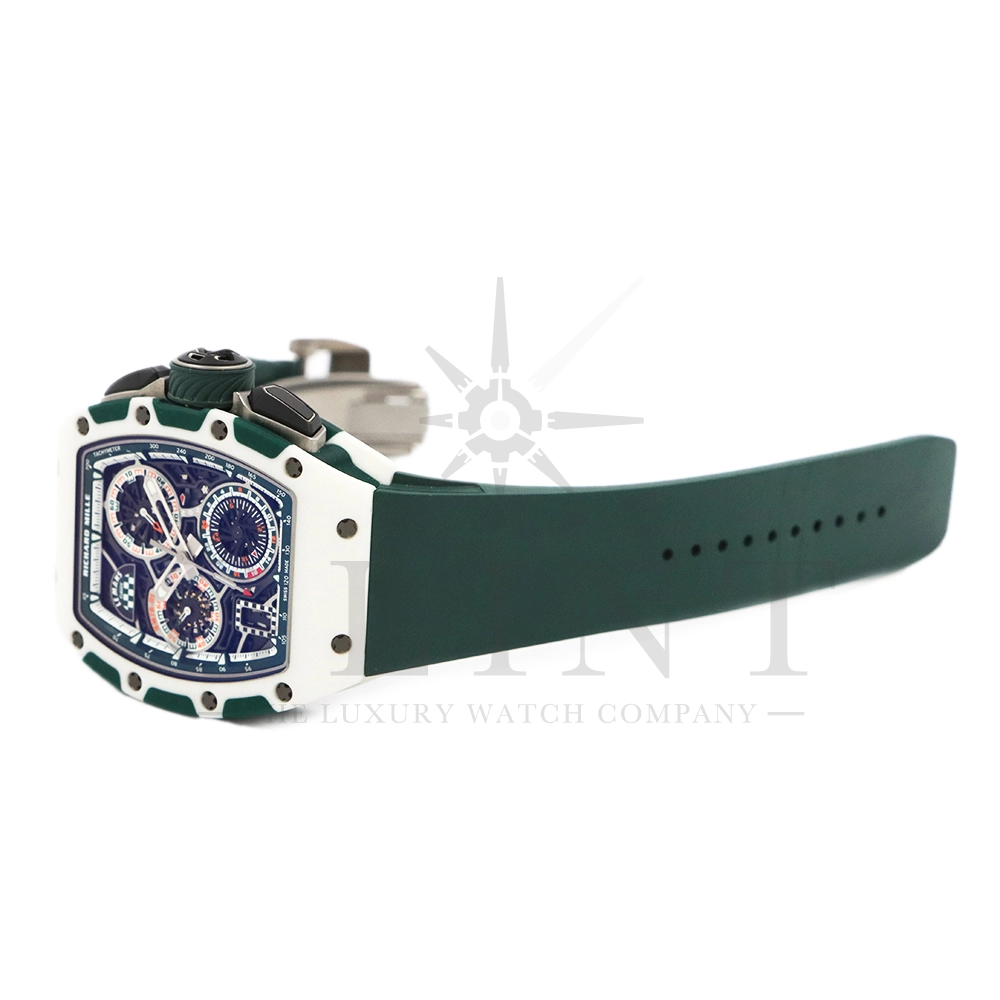こちらはRM72-01 ル・マン クラシック 世界限定150本です。リシャールミルがフランスの伝統的耐久レース「ル・マン・クラシック」に捧げた特別限定モデル。ブランドのスポーツスピリットと、ル・マンに息づくモータースポーツの栄光を象徴する一本です。ケースはグリーンとホワイトのクォーツTPTによる2層構造で、レースの象徴カラーを鮮やかに表現。自社製自動巻きフライバッククロノグラフムーブメント Cal.CRMC1 を搭載し、シングルバレルながらも高いトルク伝達効率と60時間のパワーリザーブを実現しています。また、時・分・秒・クロノグラフ・デイトを巧みに配置したダイアルは、リシャール・ミルならではの立体構造と視認性を兼備。6時位置にはル・マンを象徴する「16」の数字が赤く刻まれ、24時間耐久レースへのオマージュを表現しています。技術美とスピードのロマンを凝縮した、リシャール・ミルらしい究極のタイムピースです。