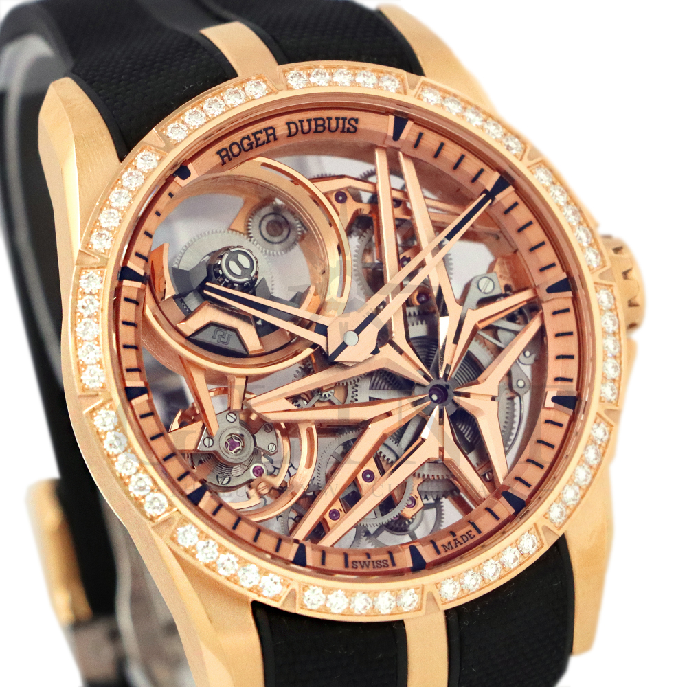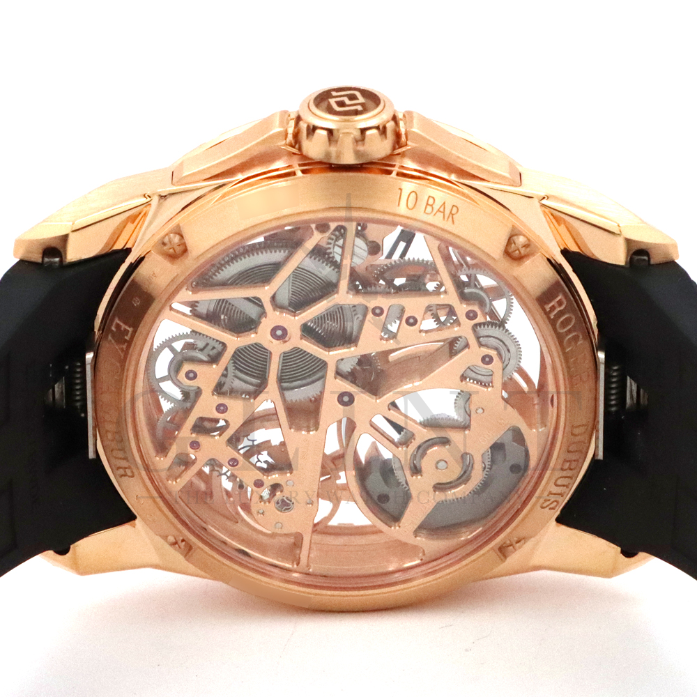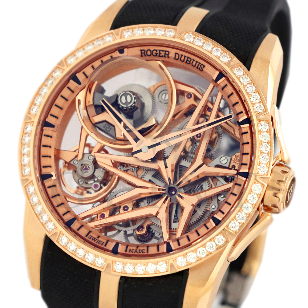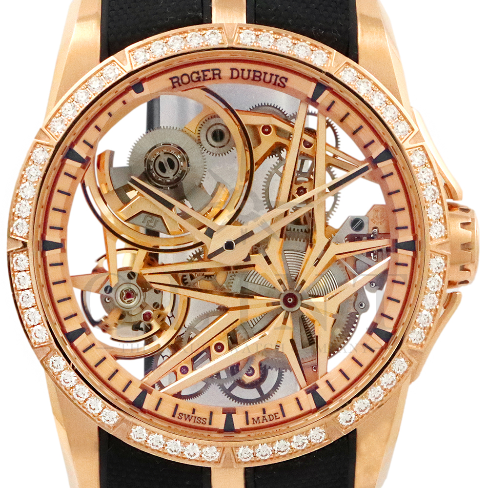 こちらはエクスカリバー モノバランシエ イーオンゴールド オートマティック スケルトンです。ロジェ・デュブイが特許を取得した“イーオンゴールド(EON GOLD)”合金製の42mmケースを採用し、「過酷な環境にさらされても変色しにくい」改良型の18Kピンクゴールド(5N)を使用。シャープに刻まれたベゼルにはダイヤモンドがセッティングされ、ケースは主にサンドブラスト仕上げとなっております。ムーブメントには高いパフォーマンス力を誇るCal.RD720SQを搭載。振動と騒音を最小限に抑えるためにマイクロローターは最適化され、テンプの慣性モーメントを2倍にアップすることで、安全性と耐衝撃性も大きく強化しております。同じく脱進機の形状も最適化し、シリコン製のガンギ車、調整可能のシリコン製のアンクル爪、さらに新しい潤滑油の採用によって、優れた効率とエネルギー伝達を達成。最大で72時間のパワーリザーブとなっております。ケースバックはサファイアクリスタル仕様となっており、機能性に加え、デザイン性も意識されたムーブメントの姿を存分に堪能することができるでしょう。ロジェ・デュブイというブランドのユニークな個性を見事に体現した一本です。