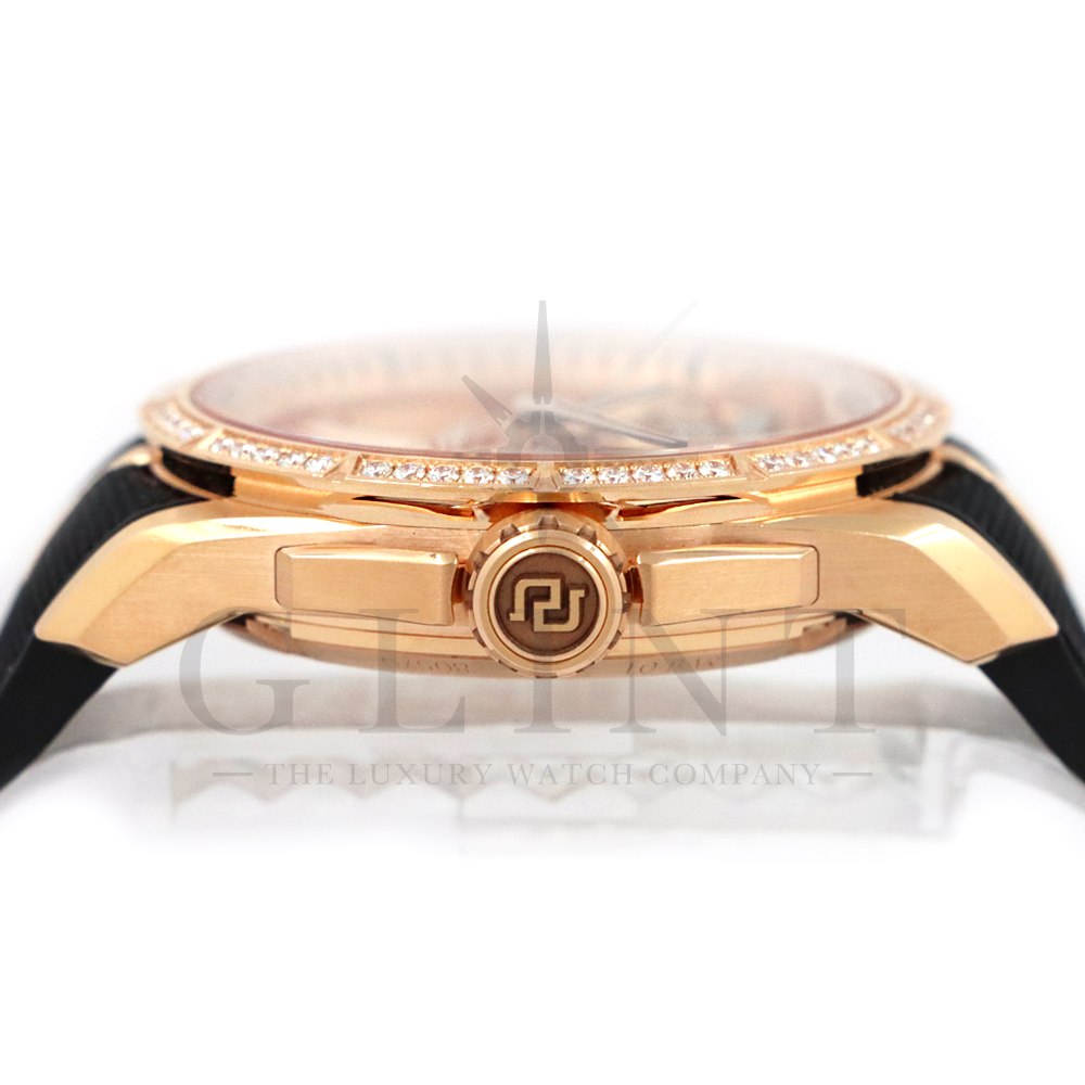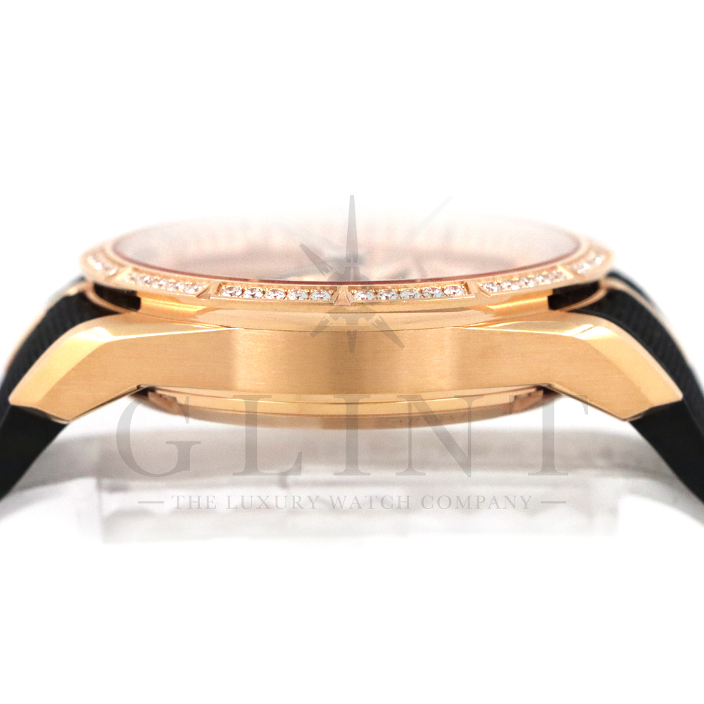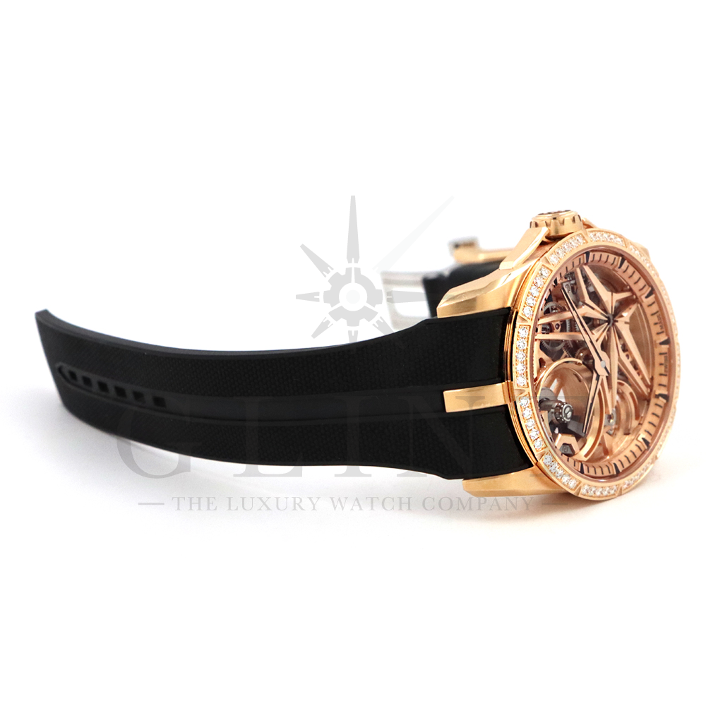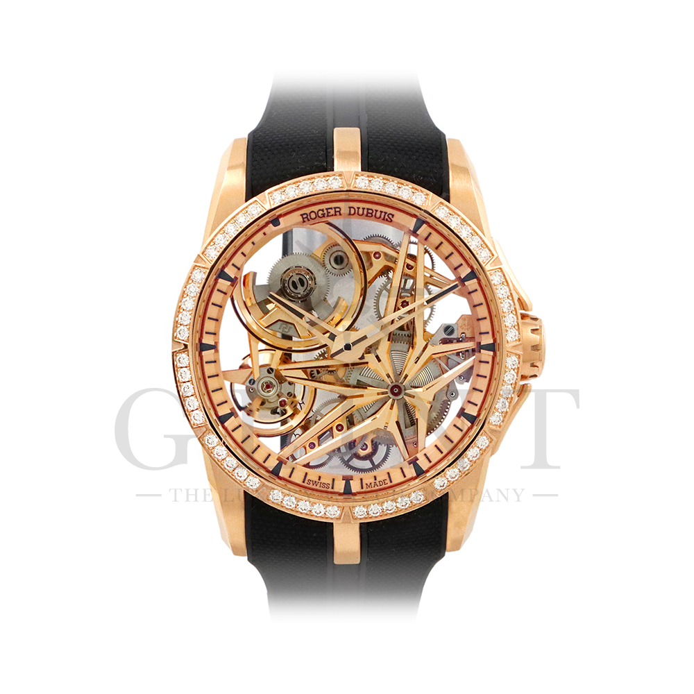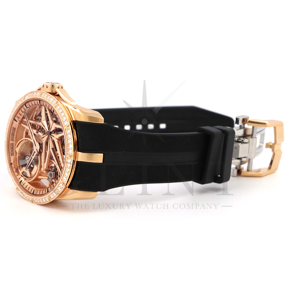 こちらはエクスカリバー モノバランシエ イーオンゴールド オートマティック スケルトンです。ロジェ・デュブイが特許を取得した“イーオンゴールド(EON GOLD)”合金製の42mmケースを採用し、「過酷な環境にさらされても変色しにくい」改良型の18Kピンクゴールド(5N)を使用。シャープに刻まれたベゼルにはダイヤモンドがセッティングされ、ケースは主にサンドブラスト仕上げとなっております。ムーブメントには高いパフォーマンス力を誇るCal.RD720SQを搭載。振動と騒音を最小限に抑えるためにマイクロローターは最適化され、テンプの慣性モーメントを2倍にアップすることで、安全性と耐衝撃性も大きく強化しております。同じく脱進機の形状も最適化し、シリコン製のガンギ車、調整可能のシリコン製のアンクル爪、さらに新しい潤滑油の採用によって、優れた効率とエネルギー伝達を達成。最大で72時間のパワーリザーブとなっております。ケースバックはサファイアクリスタル仕様となっており、機能性に加え、デザイン性も意識されたムーブメントの姿を存分に堪能することができるでしょう。ロジェ・デュブイというブランドのユニークな個性を見事に体現した一本です。