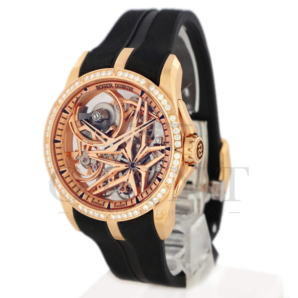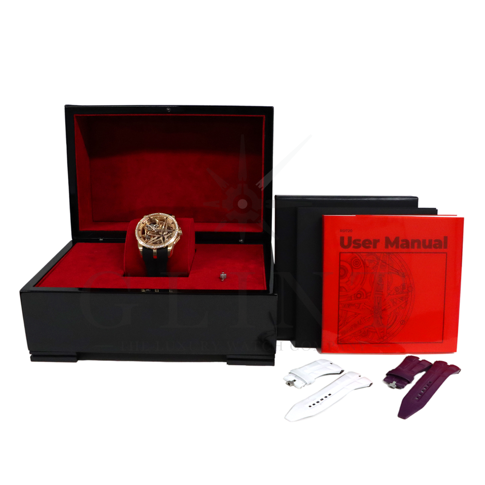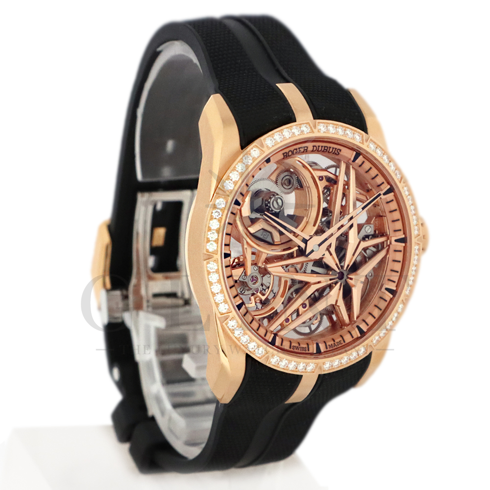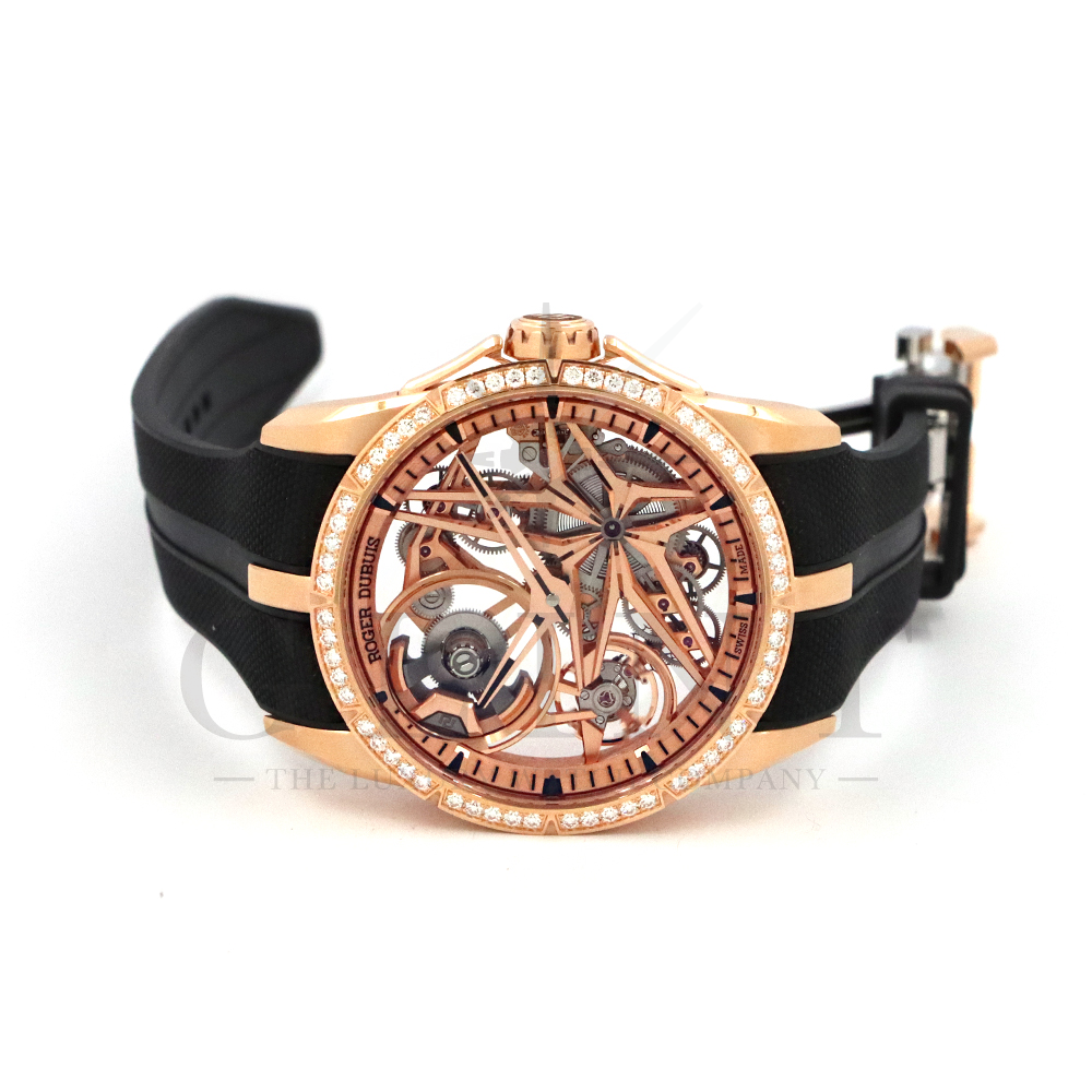こちらはエクスカリバー モノバランシエ イーオンゴールド オートマティック スケルトンです。ロジェ・デュブイが特許を取得した“イーオンゴールド(EON GOLD)”合金製の42mmケースを採用し、「過酷な環境にさらされても変色しにくい」改良型の18Kピンクゴールド(5N)を使用。シャープに刻まれたベゼルにはダイヤモンドがセッティングされ、ケースは主にサンドブラスト仕上げとなっております。ムーブメントには高いパフォーマンス力を誇るCal.RD720SQを搭載。振動と騒音を最小限に抑えるためにマイクロローターは最適化され、テンプの慣性モーメントを2倍にアップすることで、安全性と耐衝撃性も大きく強化しております。同じく脱進機の形状も最適化し、シリコン製のガンギ車、調整可能のシリコン製のアンクル爪、さらに新しい潤滑油の採用によって、優れた効率とエネルギー伝達を達成。最大で72時間のパワーリザーブとなっております。ケースバックはサファイアクリスタル仕様となっており、機能性に加え、デザイン性も意識されたムーブメントの姿を存分に堪能することができるでしょう。ロジェ・デュブイというブランドのユニークな個性を見事に体現した一本です。