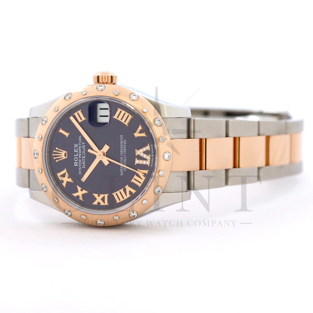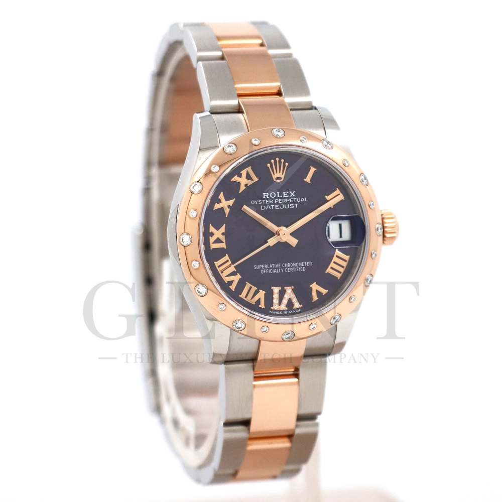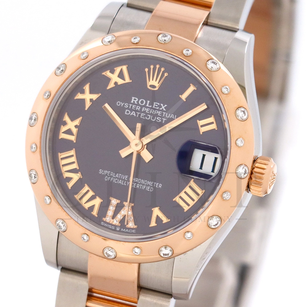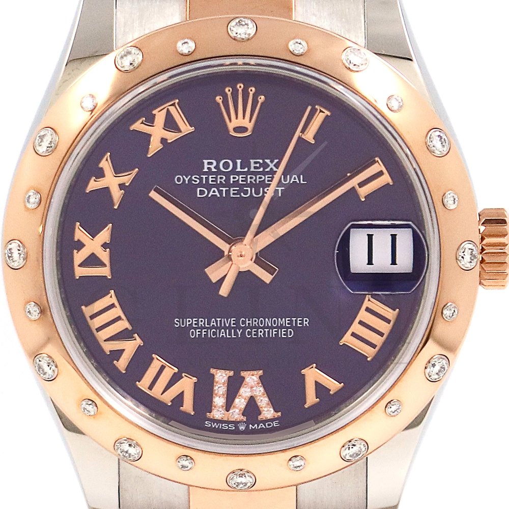 こちらはロレックス オイスターパーペチュアル デイトジャスト31です。素材にはステンレスとエバーローズゴールドを使用。妖艶な雰囲気を放つサンレイ仕上げのオーベルジーヌダイアルには大型のVIに11個のダイヤモンドがセッティングされており、上品な印象を与えてくれるでしょう。ムーブメントにはロレックスによる完全自社製造キャリバー2236を搭載し、パワーリザーブが55時間まで延長され、何時でも日付調整を可能とする事で実用性も上がりました。ブレスレットはオイスターブレスレットを採用しており、スポーティさも感じさながらも、高級感を演出する事を忘れない大人の女性に相応しい一本です。