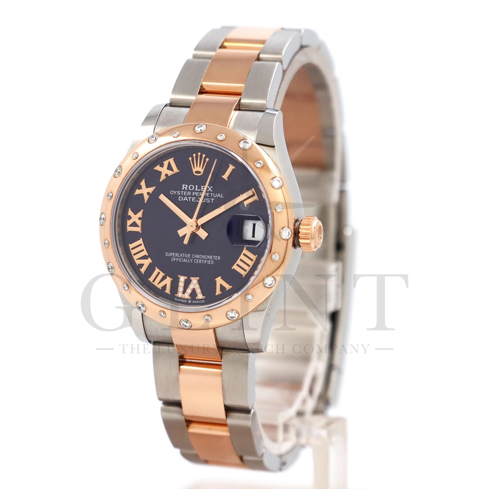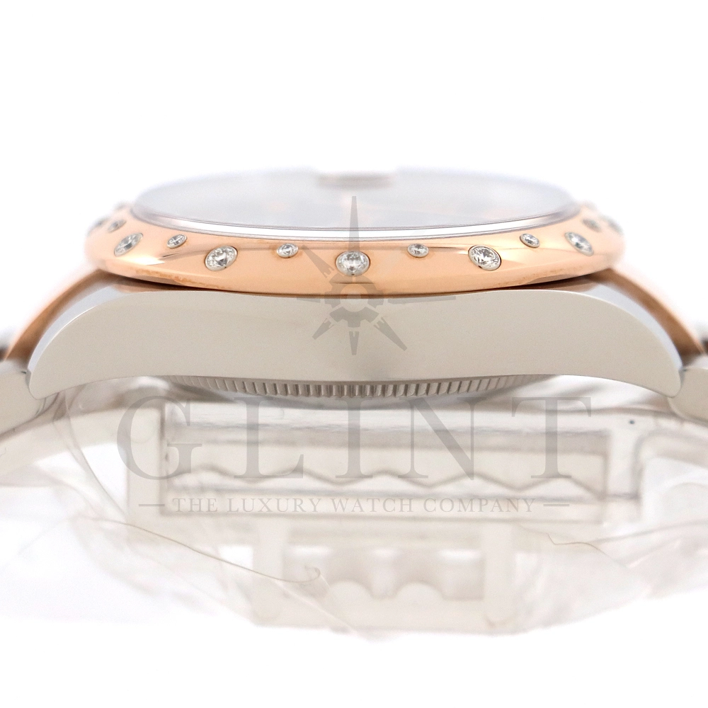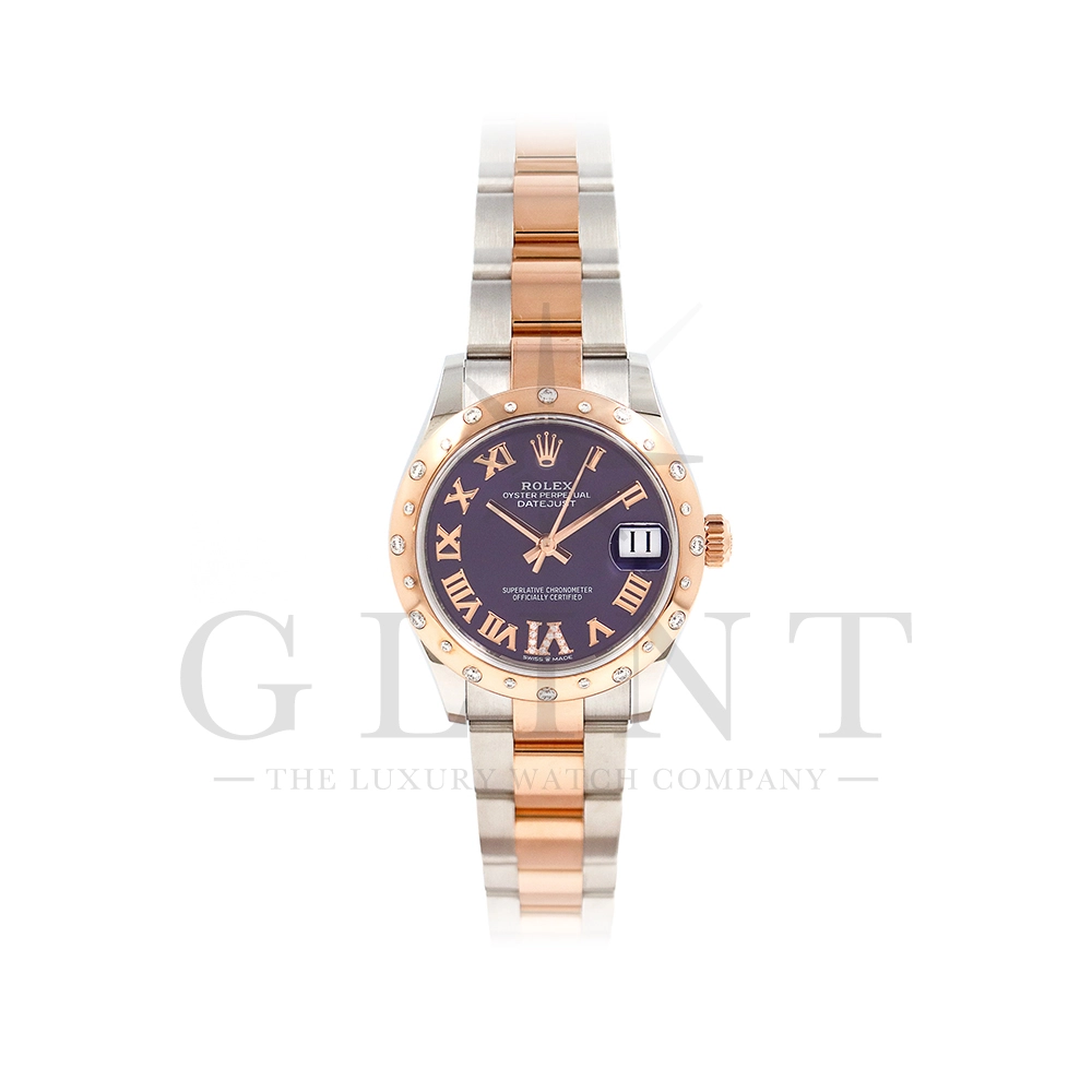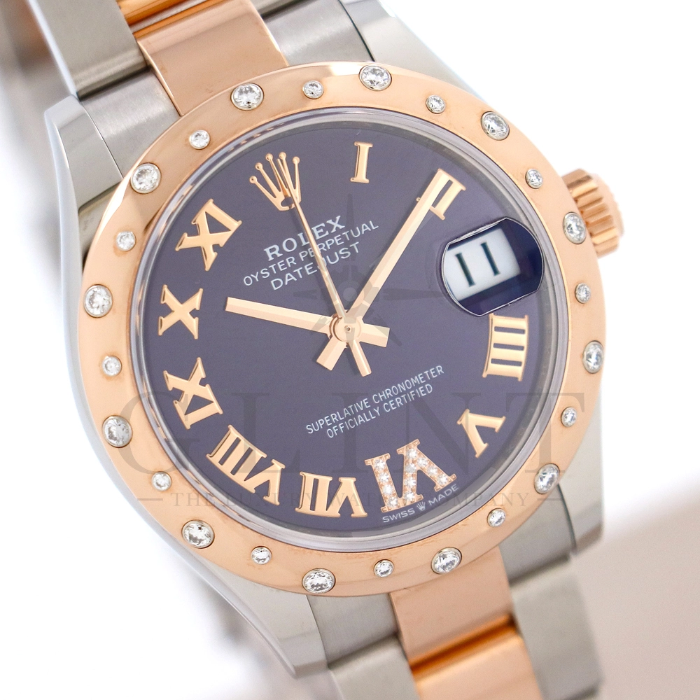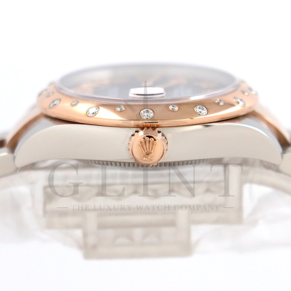 こちらはロレックス オイスターパーペチュアル デイトジャスト31です。素材にはステンレスとエバーローズゴールドを使用。妖艶な雰囲気を放つサンレイ仕上げのオーベルジーヌダイアルには大型のVIに11個のダイヤモンドがセッティングされており、上品な印象を与えてくれるでしょう。ムーブメントにはロレックスによる完全自社製造キャリバー2236を搭載し、パワーリザーブが55時間まで延長され、何時でも日付調整を可能とする事で実用性も上がりました。ブレスレットはオイスターブレスレットを採用しており、スポーティさも感じさながらも、高級感を演出する事を忘れない大人の女性に相応しい一本です。