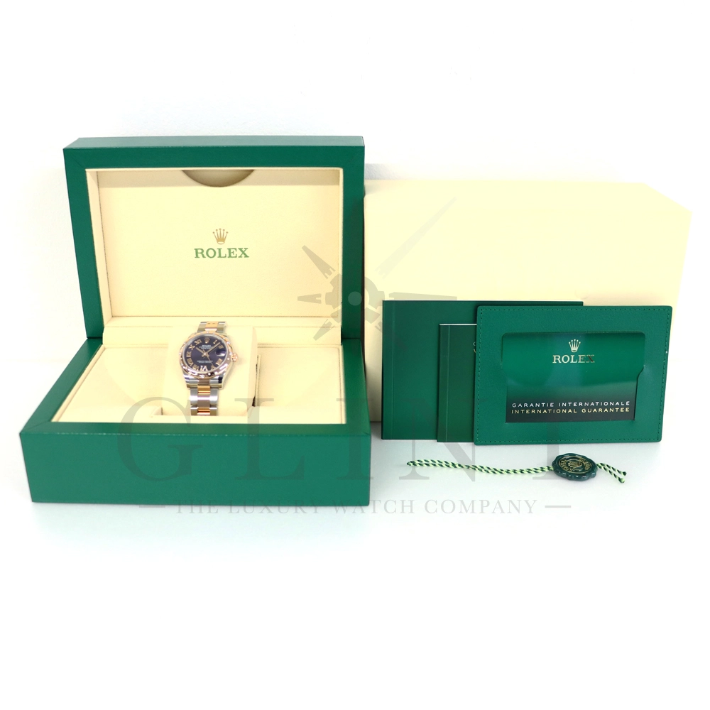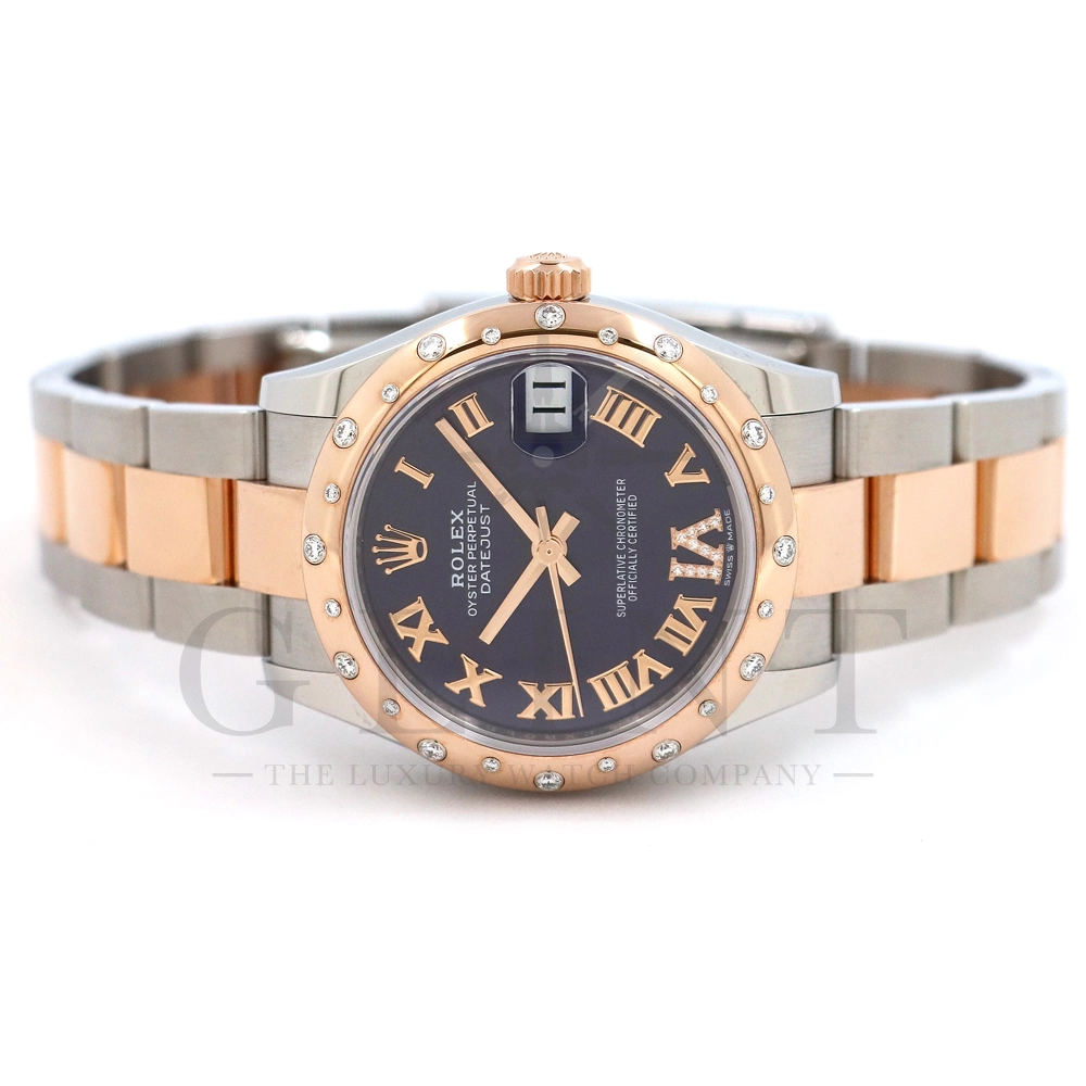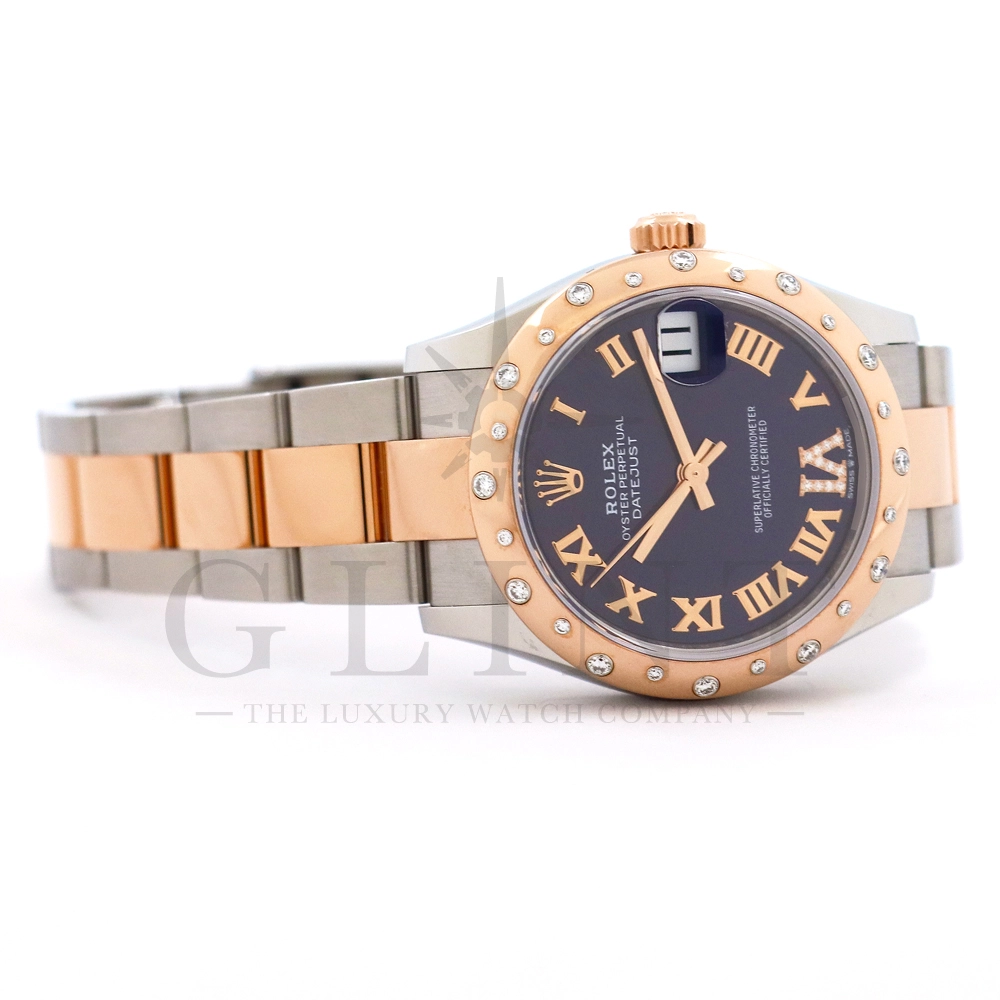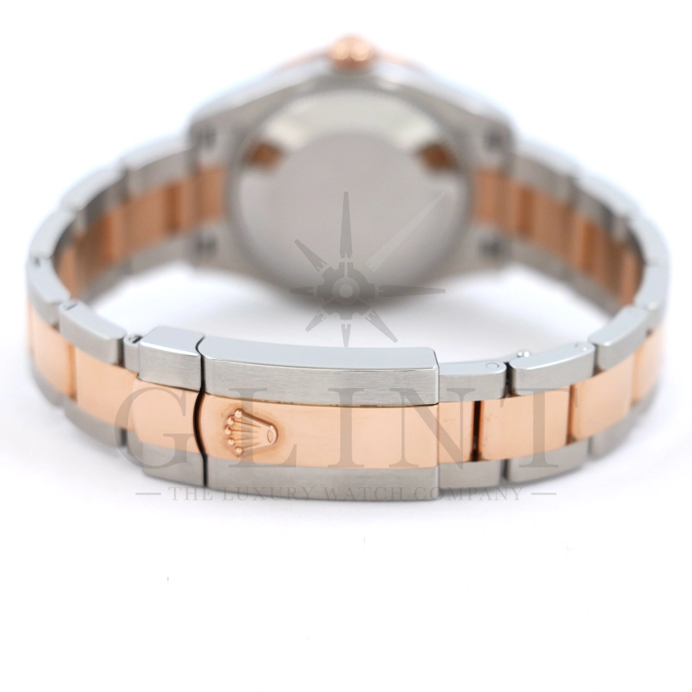 こちらはロレックス オイスターパーペチュアル デイトジャスト31です。素材にはステンレスとエバーローズゴールドを使用。妖艶な雰囲気を放つサンレイ仕上げのオーベルジーヌダイアルには大型のVIに11個のダイヤモンドがセッティングされており、上品な印象を与えてくれるでしょう。ムーブメントにはロレックスによる完全自社製造キャリバー2236を搭載し、パワーリザーブが55時間まで延長され、何時でも日付調整を可能とする事で実用性も上がりました。ブレスレットはオイスターブレスレットを採用しており、スポーティさも感じさながらも、高級感を演出する事を忘れない大人の女性に相応しい一本です。