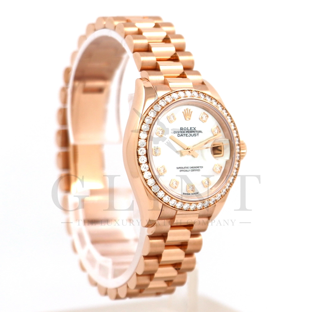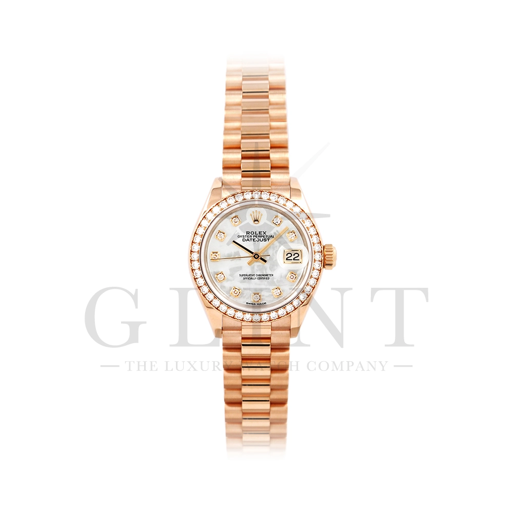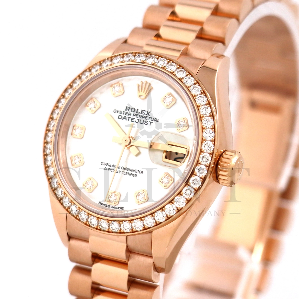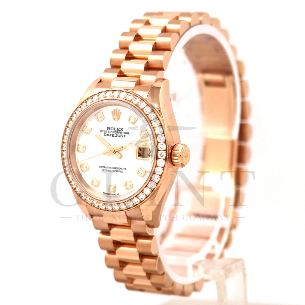 こちらはロレックス オイスターパーペチュアル レディ デイトジャスト 28mmです。素材にはエバーローズゴールドを使用。ホワイトマザーオブパールの文字盤には10ptのダイヤモンド、ベゼルにも大変美しいダイヤモンドがセッティングされ、非常にラグジュアリーな仕様となっております。搭載されているCal.2236は、ロレックスが再定義した高レベルなクロノメーター性能を提供し、従来のヘアスプリングの約10倍もの耐衝撃性が実現されました。プレジデントブレスレットにはバックルが見えないコンシールドクラスプを採用しており、それによってブレスレットの一体感が強調され、ジュエリーテイストが色濃く反映されております。プレジデントブレスとの絶妙なバランスから抜群の装着感を実感していただけることでしょう。女性の目線で考え抜かれた非常に豪華なタイムピースをご堪能ください。
