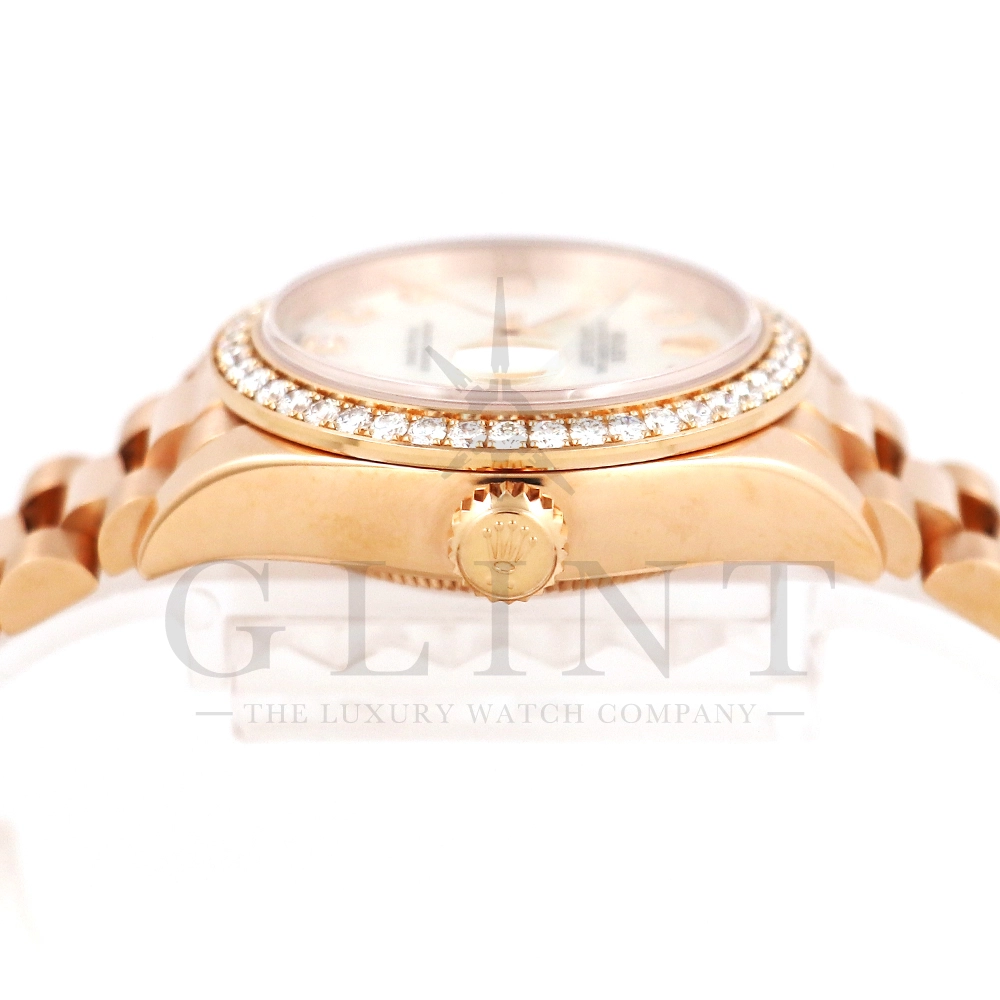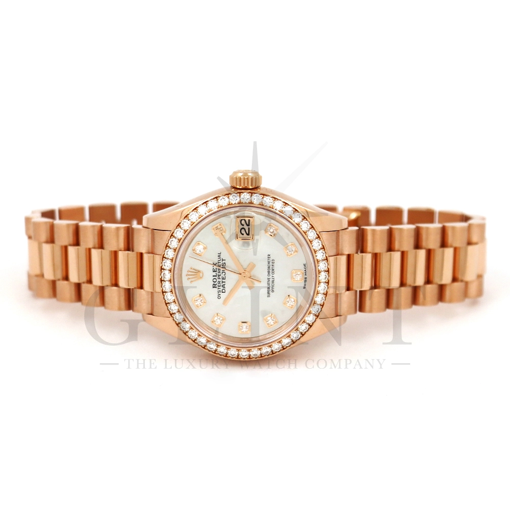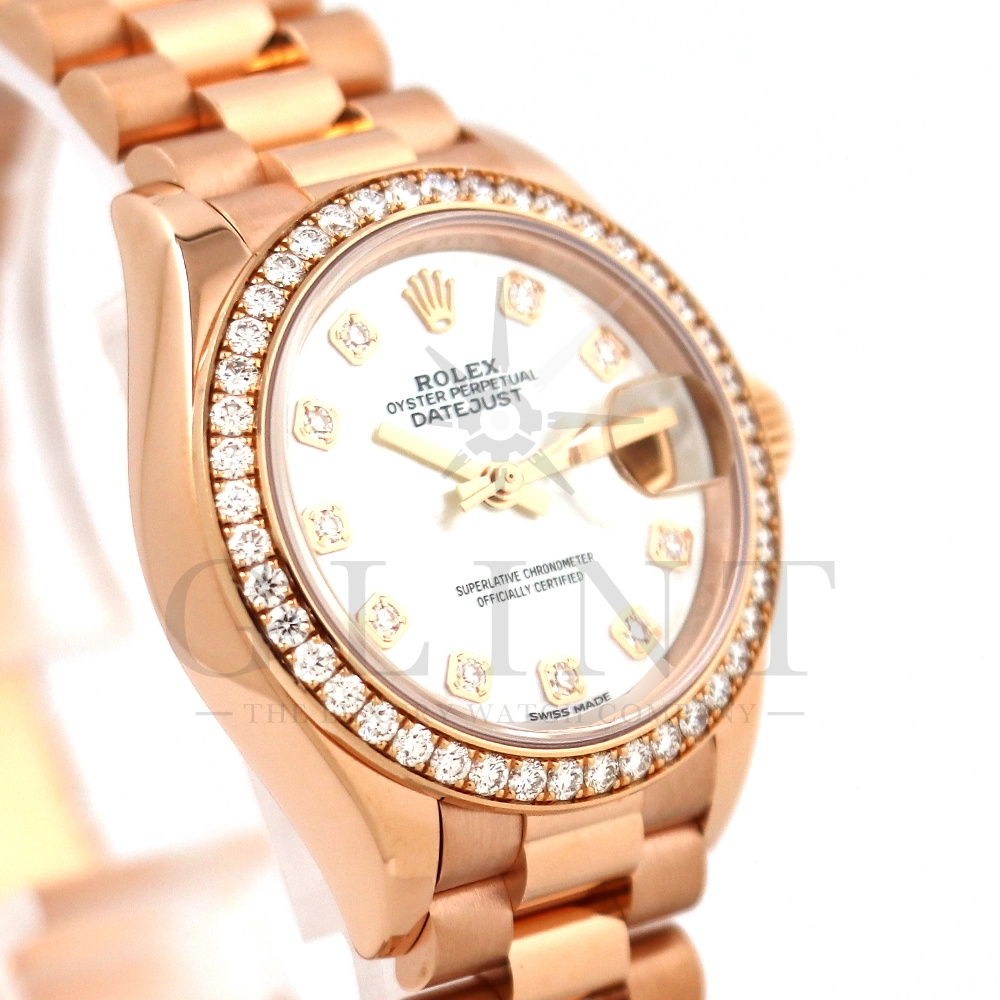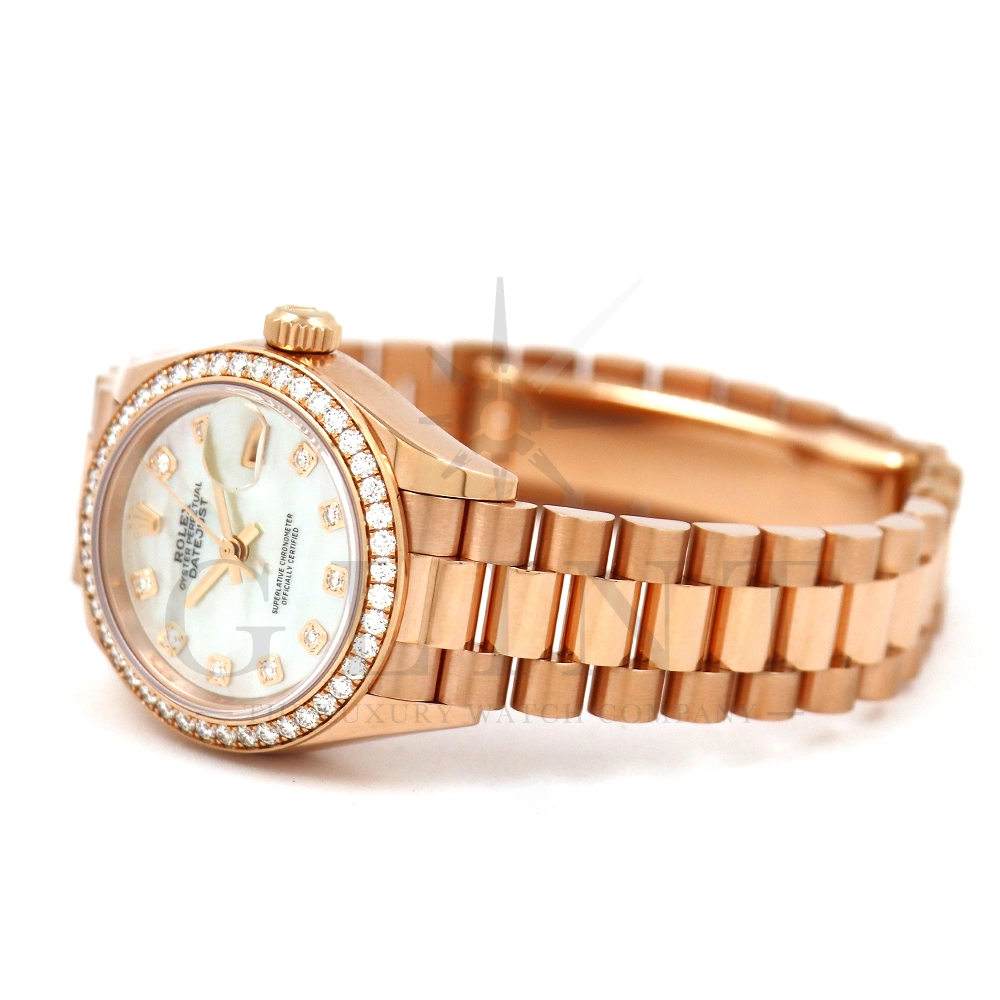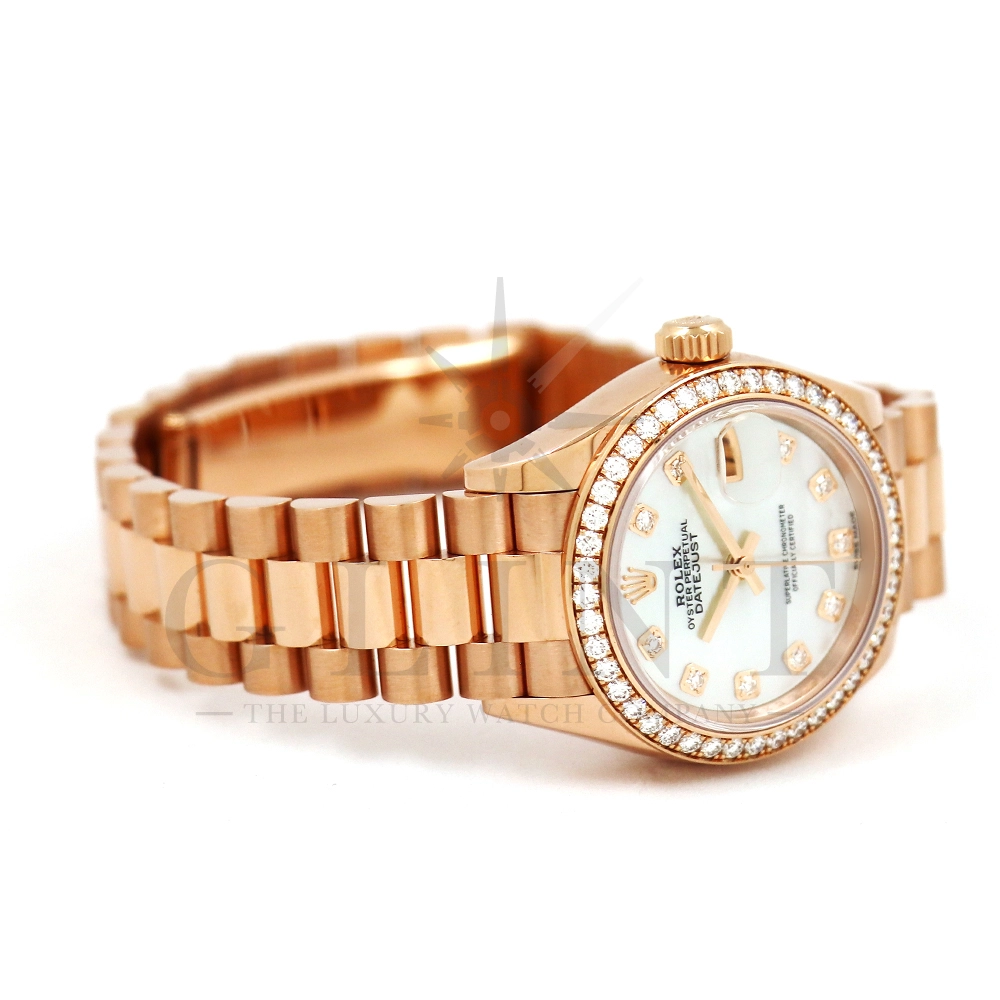 こちらはロレックス オイスターパーペチュアル レディ デイトジャスト 28mmです。素材にはエバーローズゴールドを使用。ホワイトマザーオブパールの文字盤には10ptのダイヤモンド、ベゼルにも大変美しいダイヤモンドがセッティングされ、非常にラグジュアリーな仕様となっております。搭載されているCal.2236は、ロレックスが再定義した高レベルなクロノメーター性能を提供し、従来のヘアスプリングの約10倍もの耐衝撃性が実現されました。プレジデントブレスレットにはバックルが見えないコンシールドクラスプを採用しており、それによってブレスレットの一体感が強調され、ジュエリーテイストが色濃く反映されております。プレジデントブレスとの絶妙なバランスから抜群の装着感を実感していただけることでしょう。女性の目線で考え抜かれた非常に豪華なタイムピースをご堪能ください。