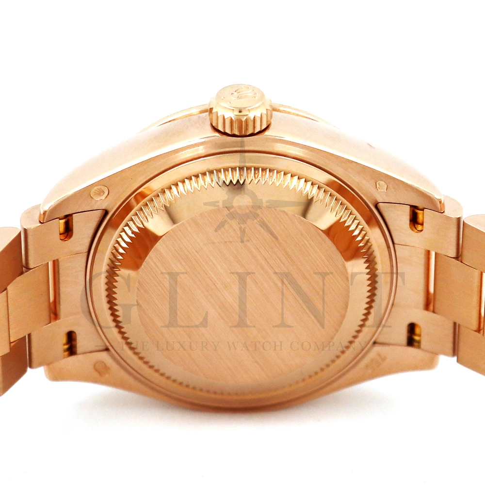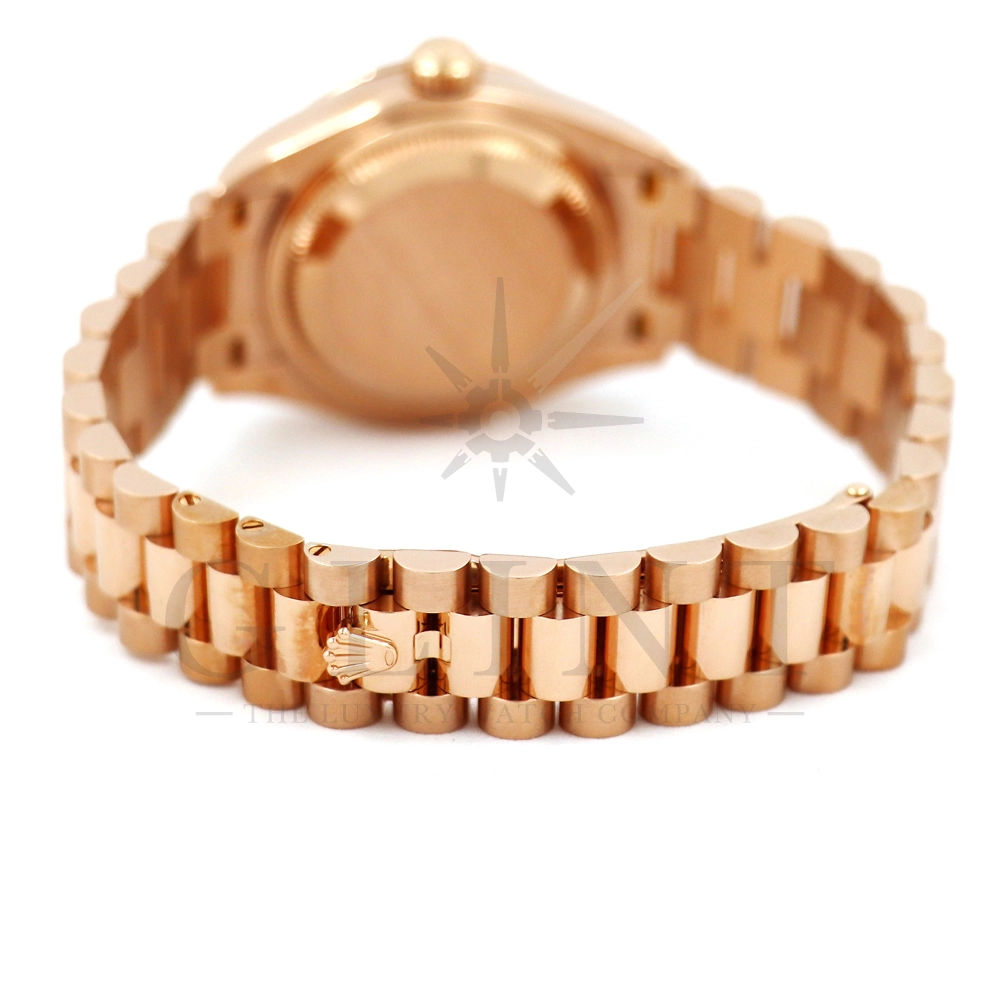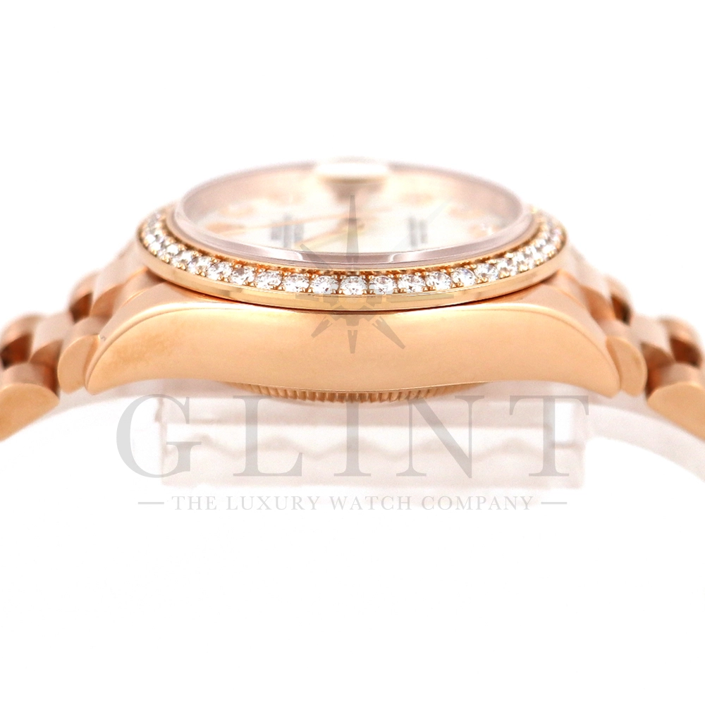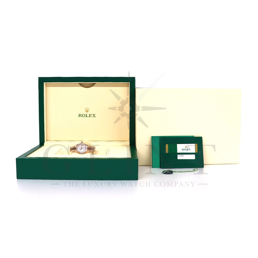 こちらはロレックス オイスターパーペチュアル レディ デイトジャスト 28mmです。素材にはエバーローズゴールドを使用。ホワイトマザーオブパールの文字盤には10ptのダイヤモンド、ベゼルにも大変美しいダイヤモンドがセッティングされ、非常にラグジュアリーな仕様となっております。搭載されているCal.2236は、ロレックスが再定義した高レベルなクロノメーター性能を提供し、従来のヘアスプリングの約10倍もの耐衝撃性が実現されました。プレジデントブレスレットにはバックルが見えないコンシールドクラスプを採用しており、それによってブレスレットの一体感が強調され、ジュエリーテイストが色濃く反映されております。プレジデントブレスとの絶妙なバランスから抜群の装着感を実感していただけることでしょう。女性の目線で考え抜かれた非常に豪華なタイムピースをご堪能ください。