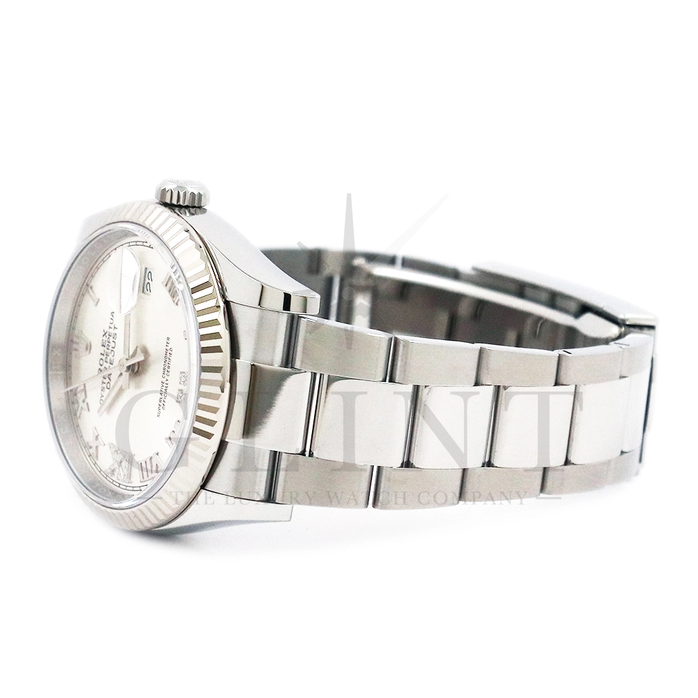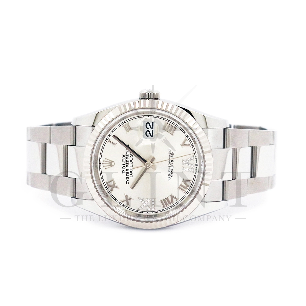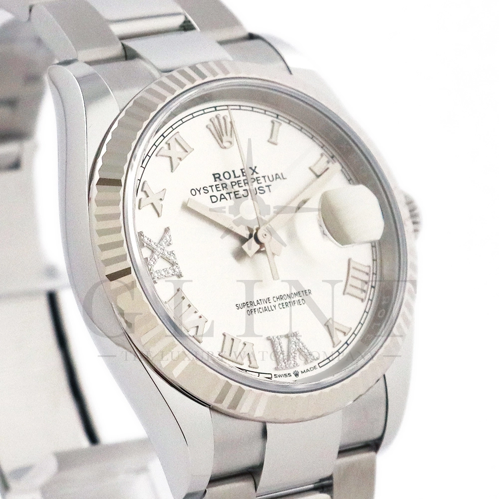 こちらはロレックス デイトジャスト36です。サンレイ仕上げとなるシルバーカラーの文字盤にローマ数字のVIとIXに24個のダイヤモンドがセッティングされたラグジュアリー仕様。シンプルな単色ダイヤルと比べると雰囲気がまるで違います。ムーブメントにはロレックスによる完全自社製造キャリバー3235を搭載し、パワーリザーブが70時間まで延長され、何時でも日付調整を可能とする事で実用性も上がりました。唯一無二の雰囲気を感じさせてくれる特別なデイトジャストです。