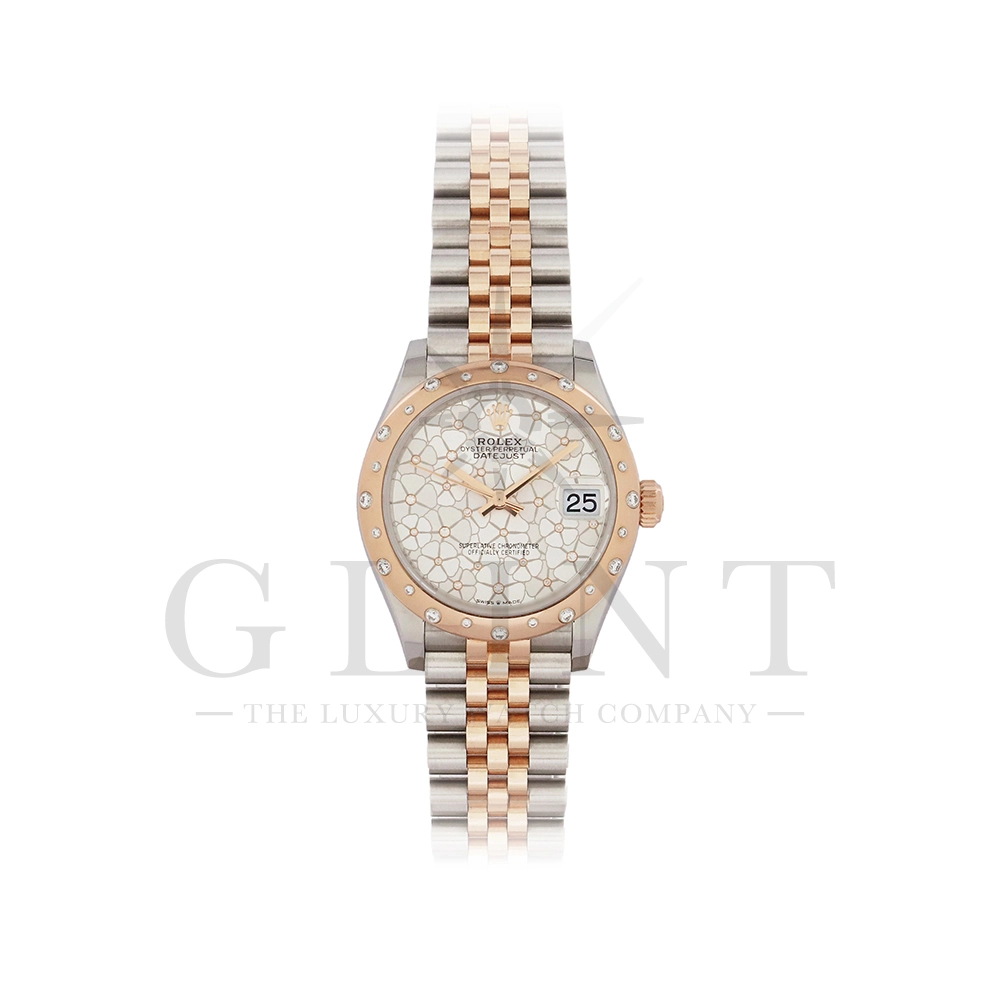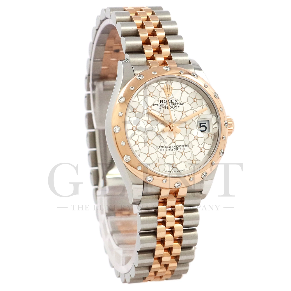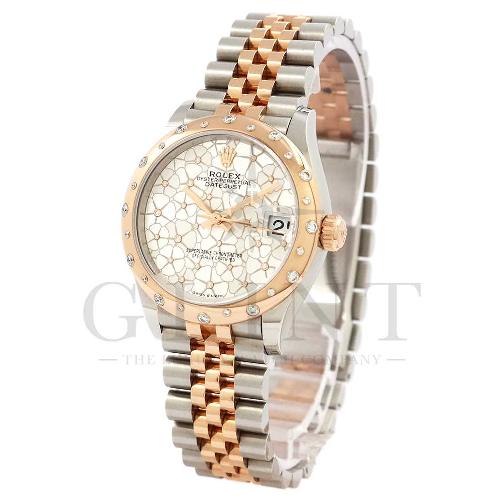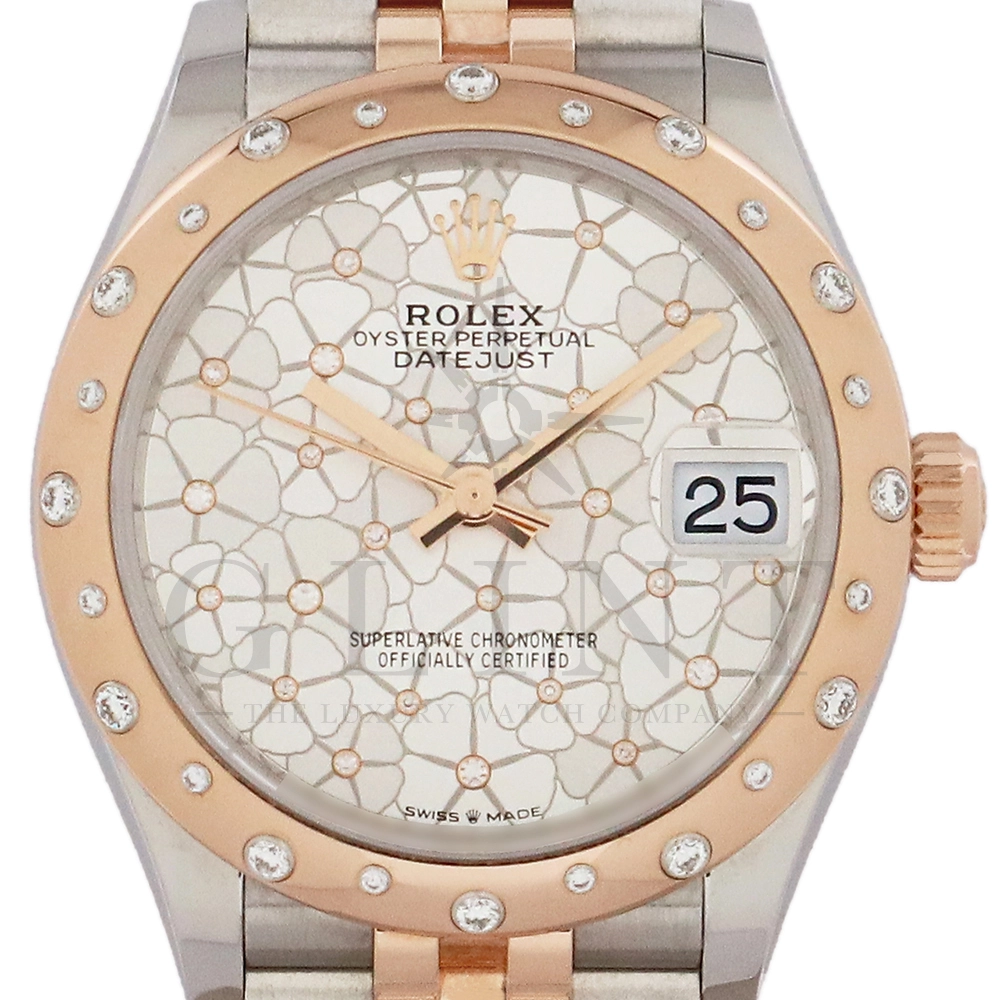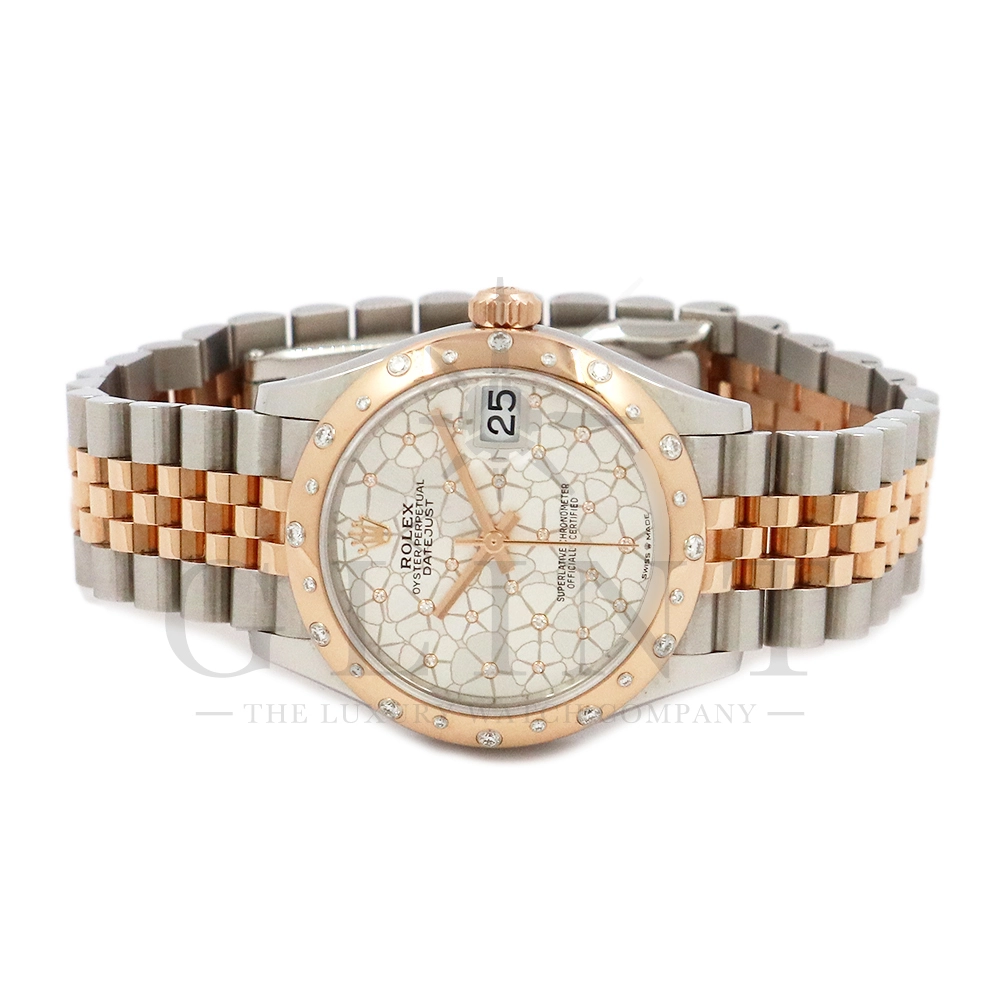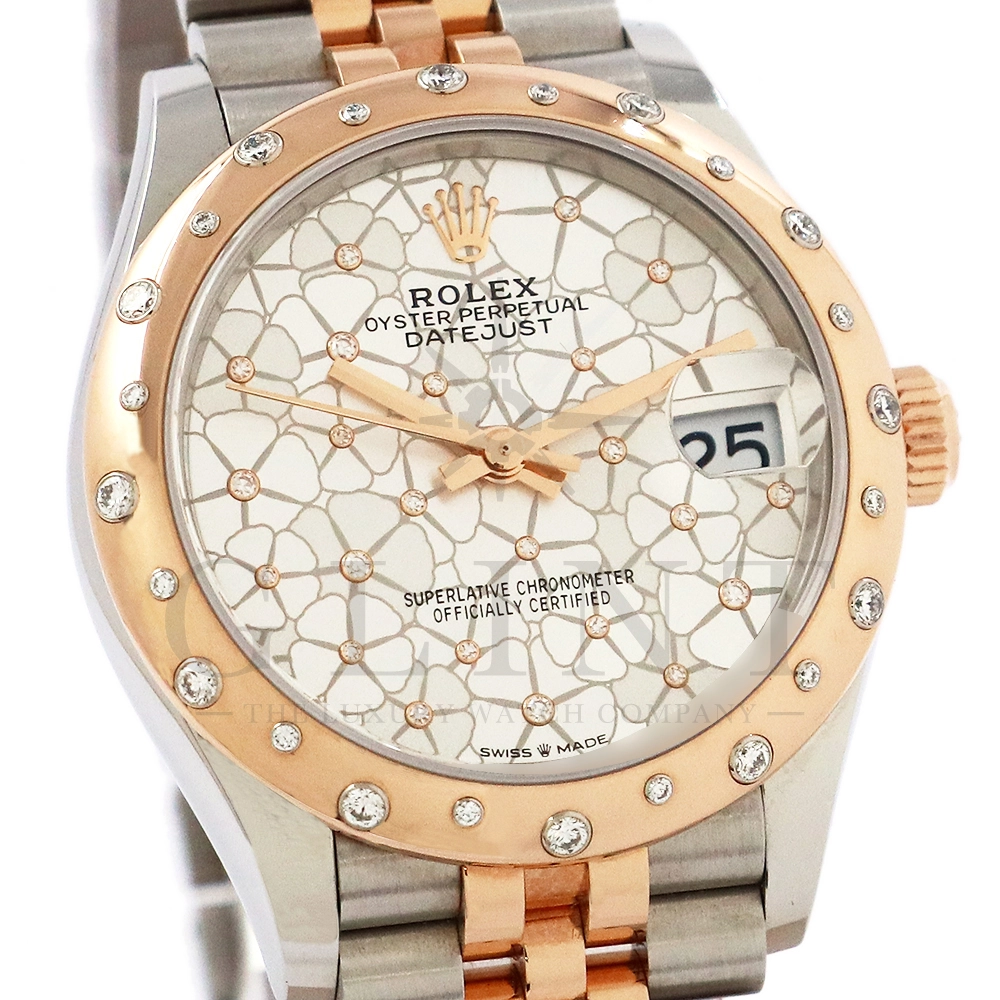 こちらはロレックス オイスターパーペチュアル デイトジャスト31です。素材にはステンレスとエバーローズゴールドを使用。文字盤には初となるデザインフローラルモチーフダイヤル。ドレッシーなフラワーモチーフに合う品のあるシルバーカラーとなっています。それぞれ花々をサンレイ、マット、グレインの3つの異なる仕上げによって描いており、ロレックスならではの高度な技術によって、高級感もあり可愛らしさもあるフラワーモチーフを演出。中央にはさまざまな大きさの24個のダイヤモンドをセッティングされております。ムーブメントにはロレックスによる完全自社製造キャリバー2236を搭載し、パワーリザーブが55時間まで延長され、何時でも日付調整を可能とする事で実用性も上がりました。ブレスレットはオイスタースチール素材のジュビリーブレスレットを採用しており、エレガントな雰囲気を与えてくれるでしょう。ジュビリーブレスレットにはコンシールドクラスプが採用され、あたかもバックルが無いようなスマートなシルエットになり、ジュエリー感覚としてもお楽しみになれる一本です。