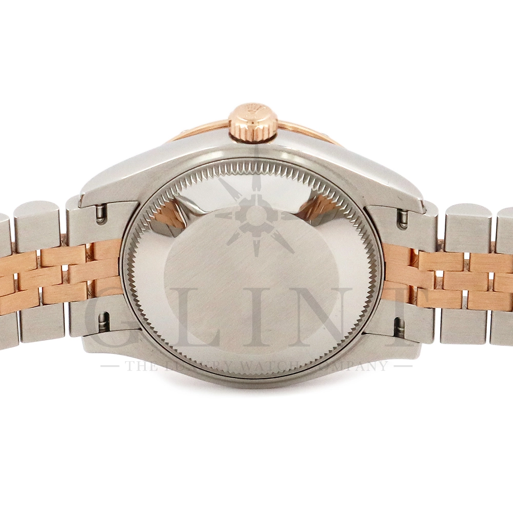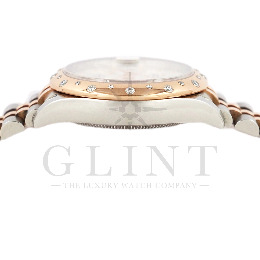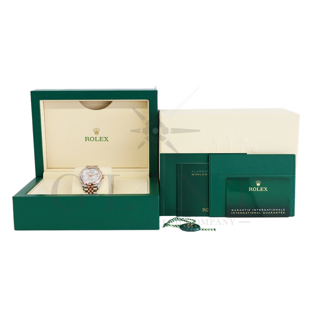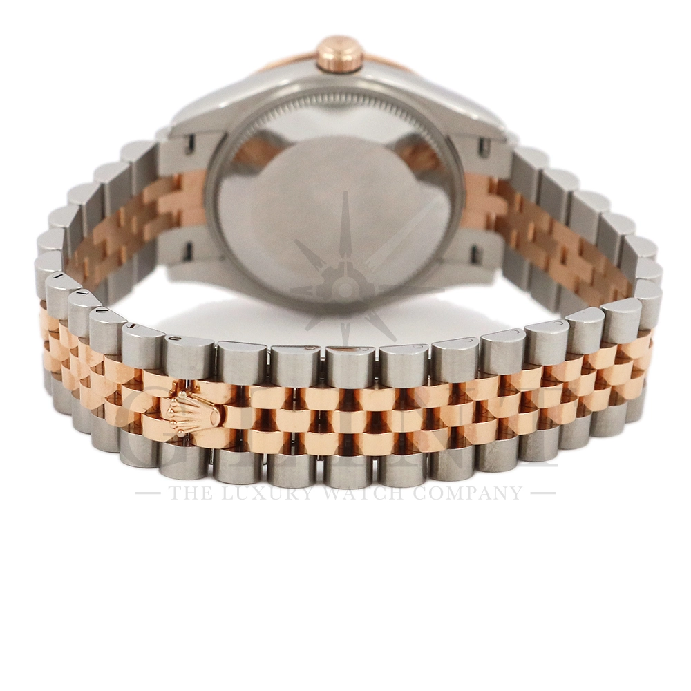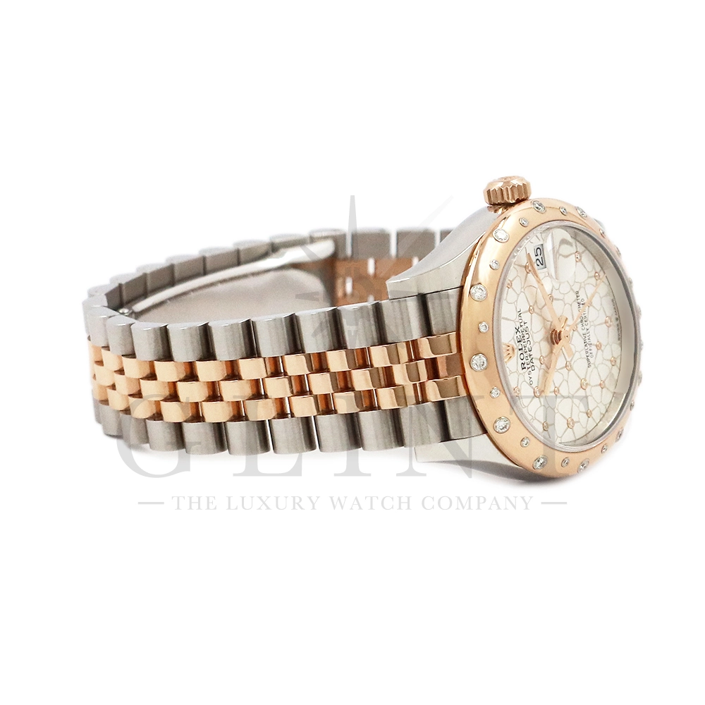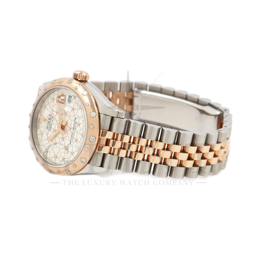 こちらはロレックス オイスターパーペチュアル デイトジャスト31です。素材にはステンレスとエバーローズゴールドを使用。文字盤には初となるデザインフローラルモチーフダイヤル。ドレッシーなフラワーモチーフに合う品のあるシルバーカラーとなっています。それぞれ花々をサンレイ、マット、グレインの3つの異なる仕上げによって描いており、ロレックスならではの高度な技術によって、高級感もあり可愛らしさもあるフラワーモチーフを演出。中央にはさまざまな大きさの24個のダイヤモンドをセッティングされております。ムーブメントにはロレックスによる完全自社製造キャリバー2236を搭載し、パワーリザーブが55時間まで延長され、何時でも日付調整を可能とする事で実用性も上がりました。ブレスレットはオイスタースチール素材のジュビリーブレスレットを採用しており、エレガントな雰囲気を与えてくれるでしょう。ジュビリーブレスレットにはコンシールドクラスプが採用され、あたかもバックルが無いようなスマートなシルエットになり、ジュエリー感覚としてもお楽しみになれる一本です。