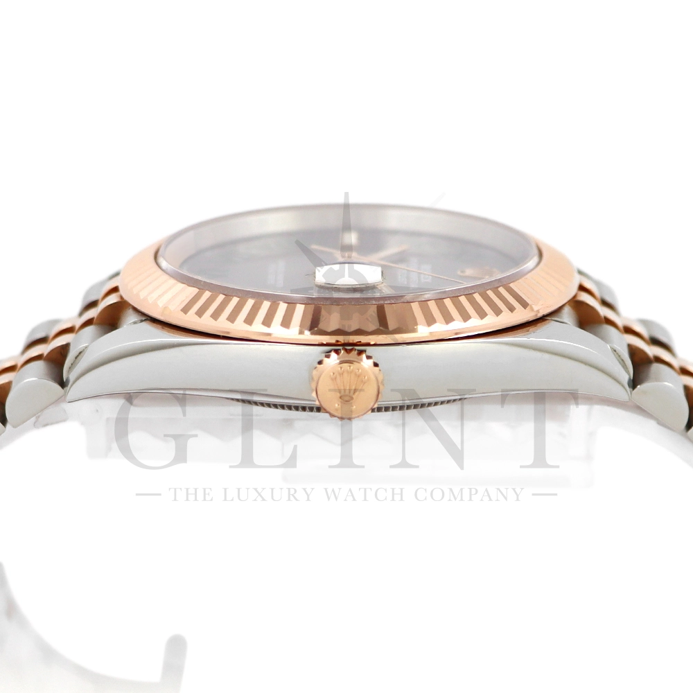 こちらはオイスターパーペチュアル デイトジャスト41です。従来の36mmケースから41mmにサイズアップし、スポーツモデルに負けず劣らずの人気を博す同モデル。ムーブメントにはロレックスによる完全自社製造キャリバー3235を搭載し、パワーリザーブが70時間まで延長され、何時でも日付調整を可能とする事で実用性も上がりました。フルーテッドベゼルにジュビリーブレスレットを採用しており、スポーツモデルでは味わえないROLEXならではの高級感を堪能できる一本です。多彩なバリエーションを誇るデイトジャストの中でもスレートカラーのローマンインデックスはデイトジャスト41しか存在しない文字盤となり、特別感を感じさせてくれるでしょう。